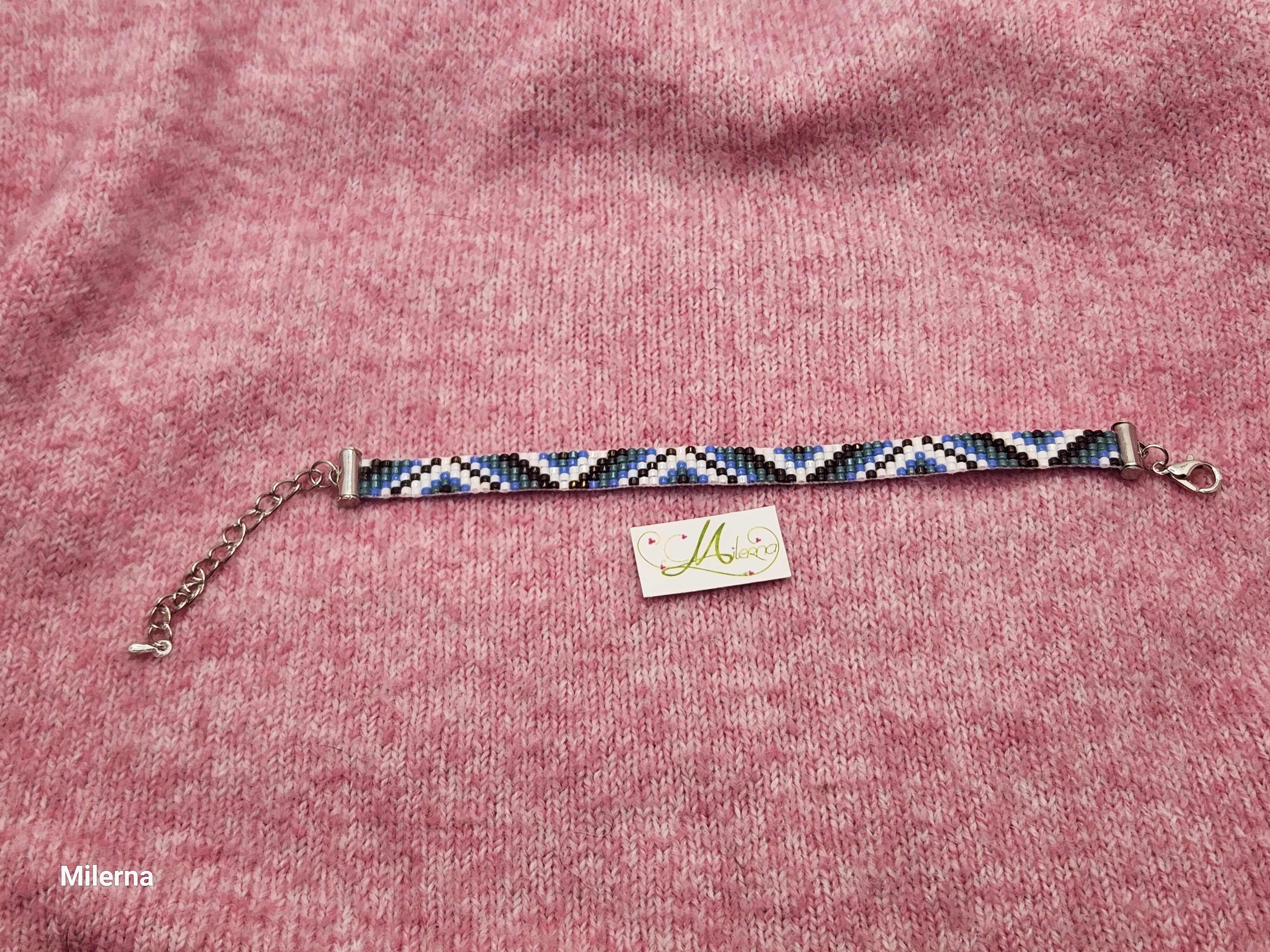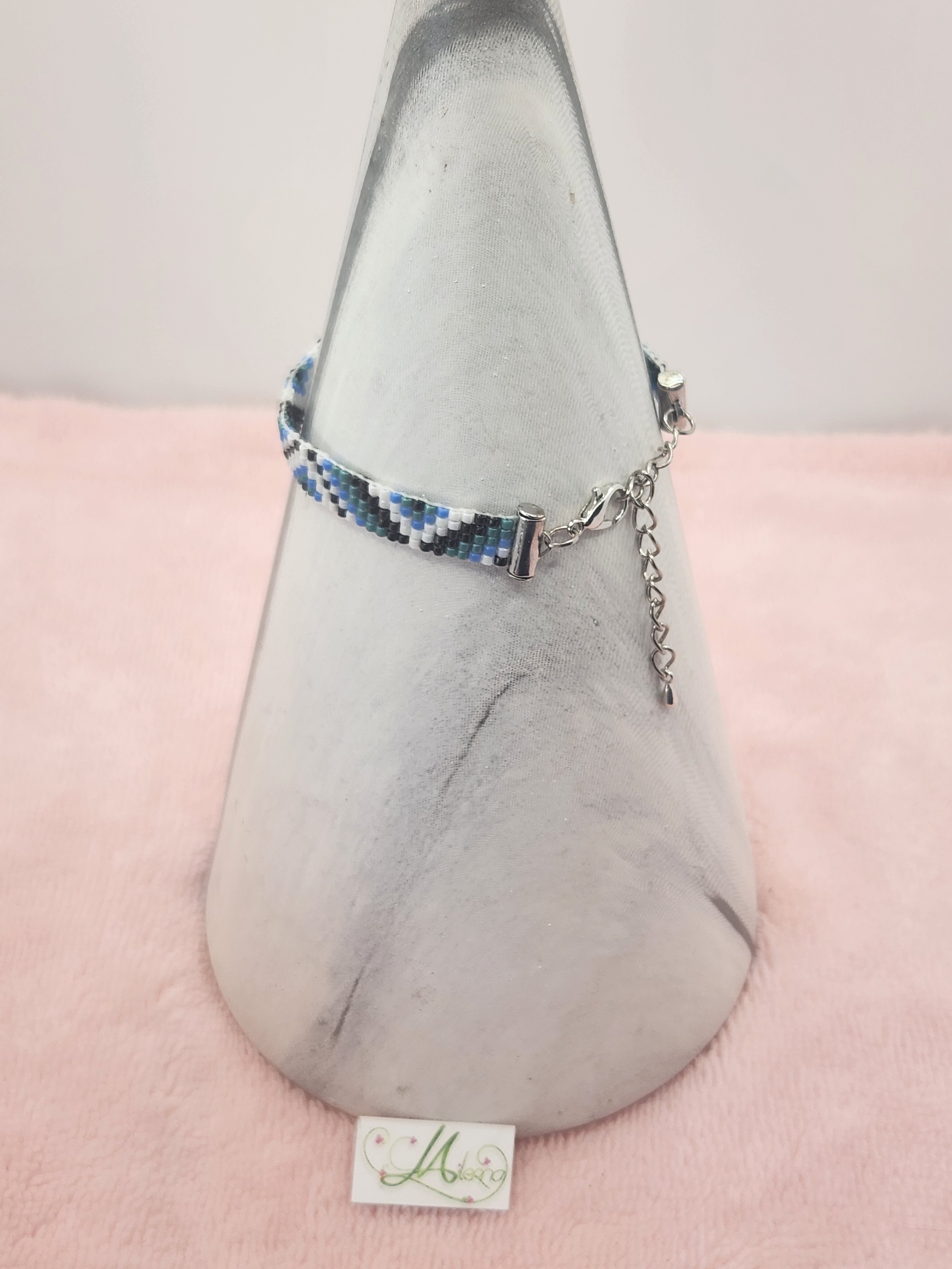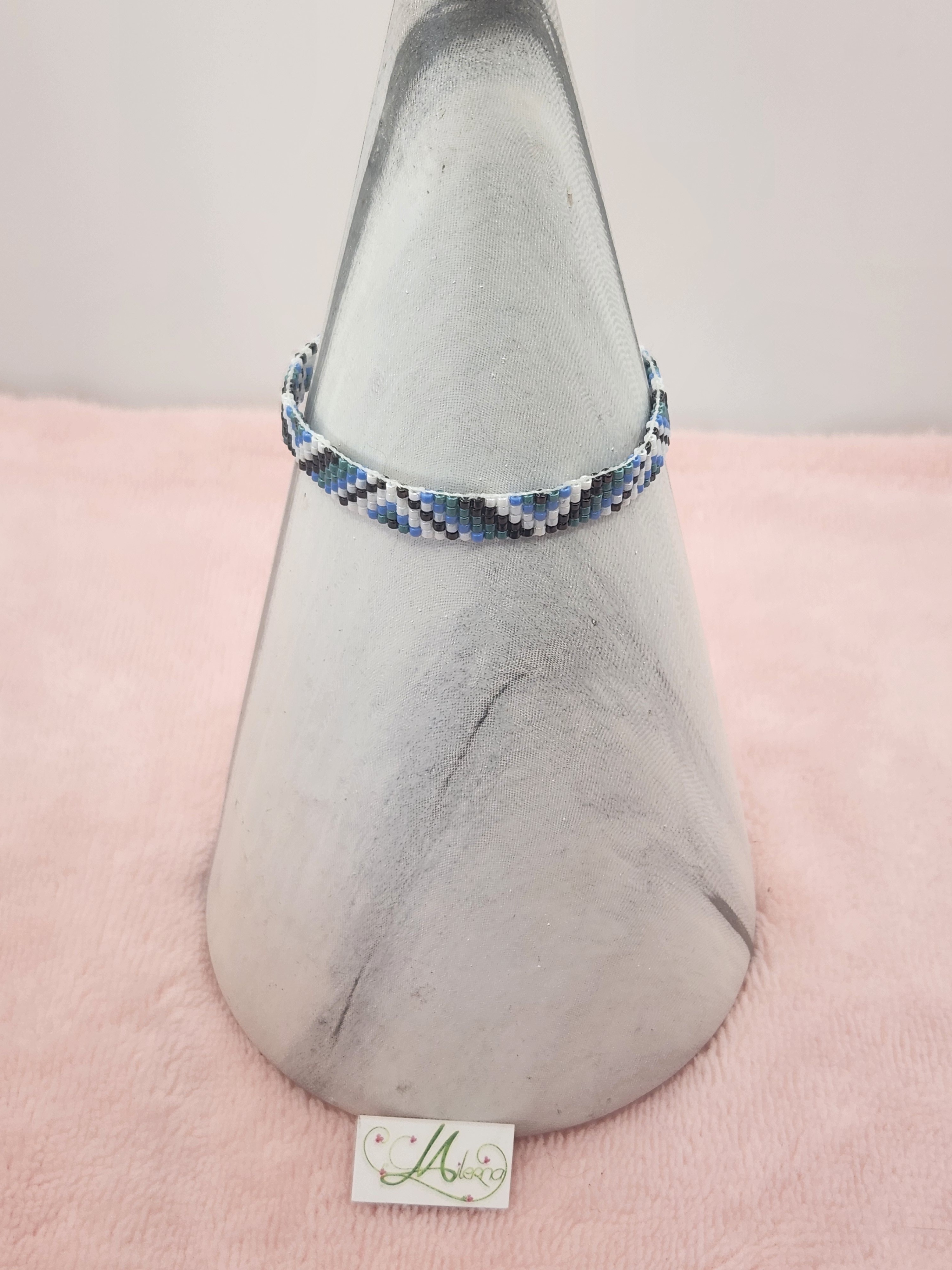 Je vous propose ce bracelet tissé en perles Miyuki délica coloris nacré, bleu, vert et marron.