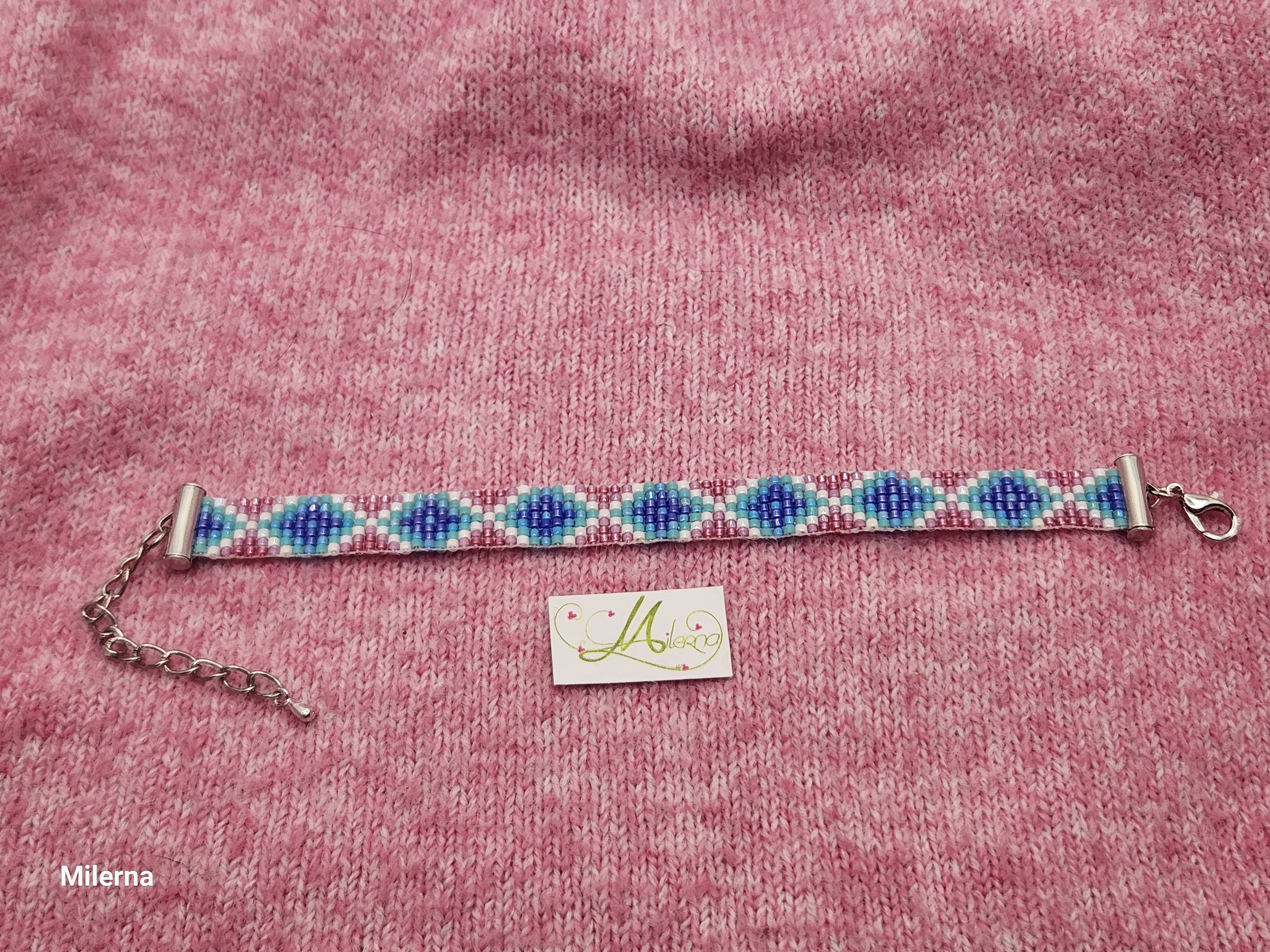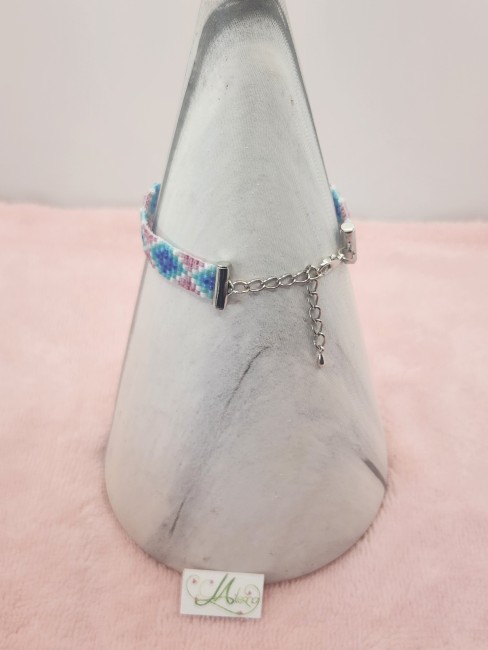 Je vous propose ce bracelet tissé en perles Miyuki délica coloris nacré, bleu, violet et rose.