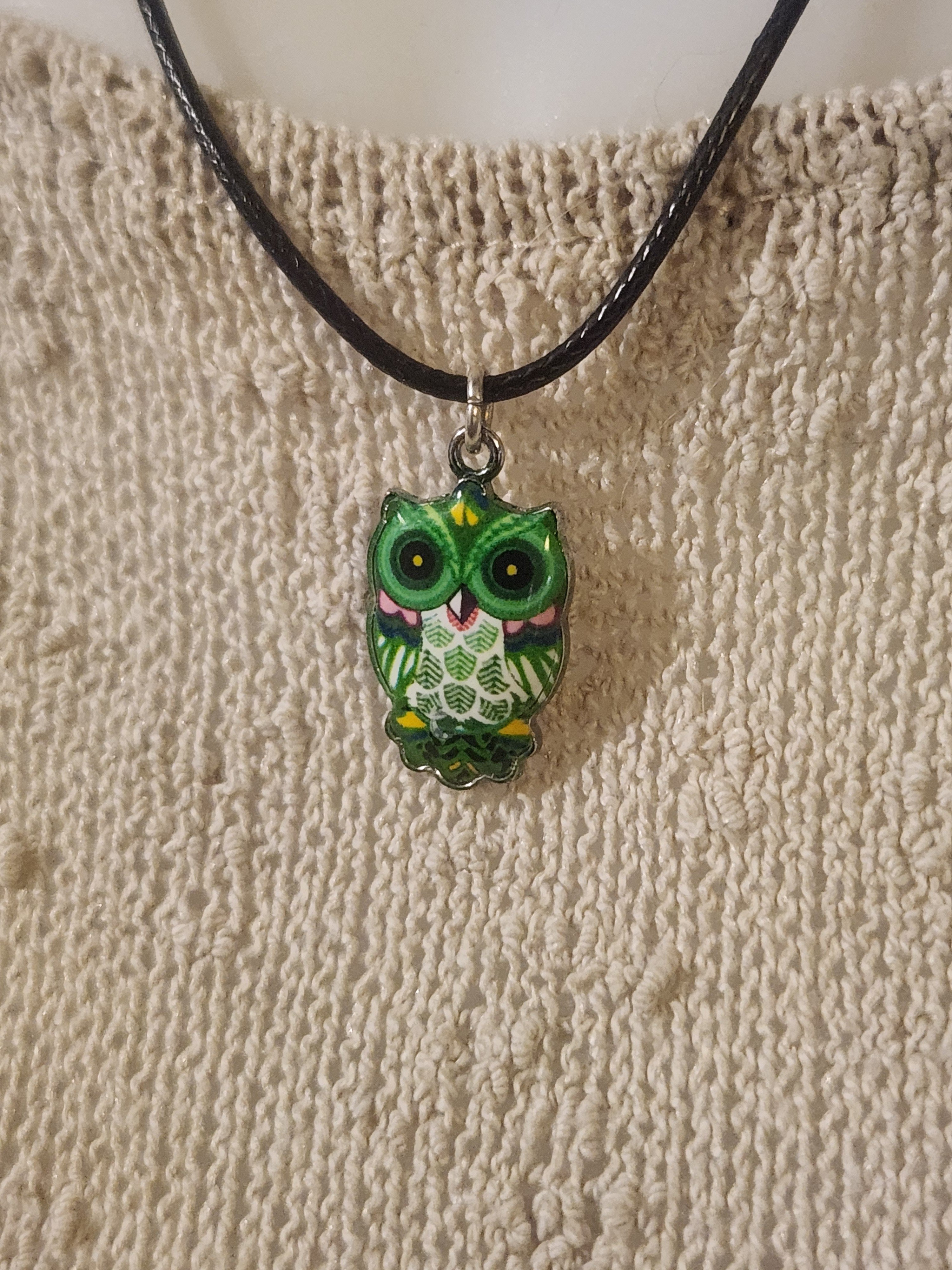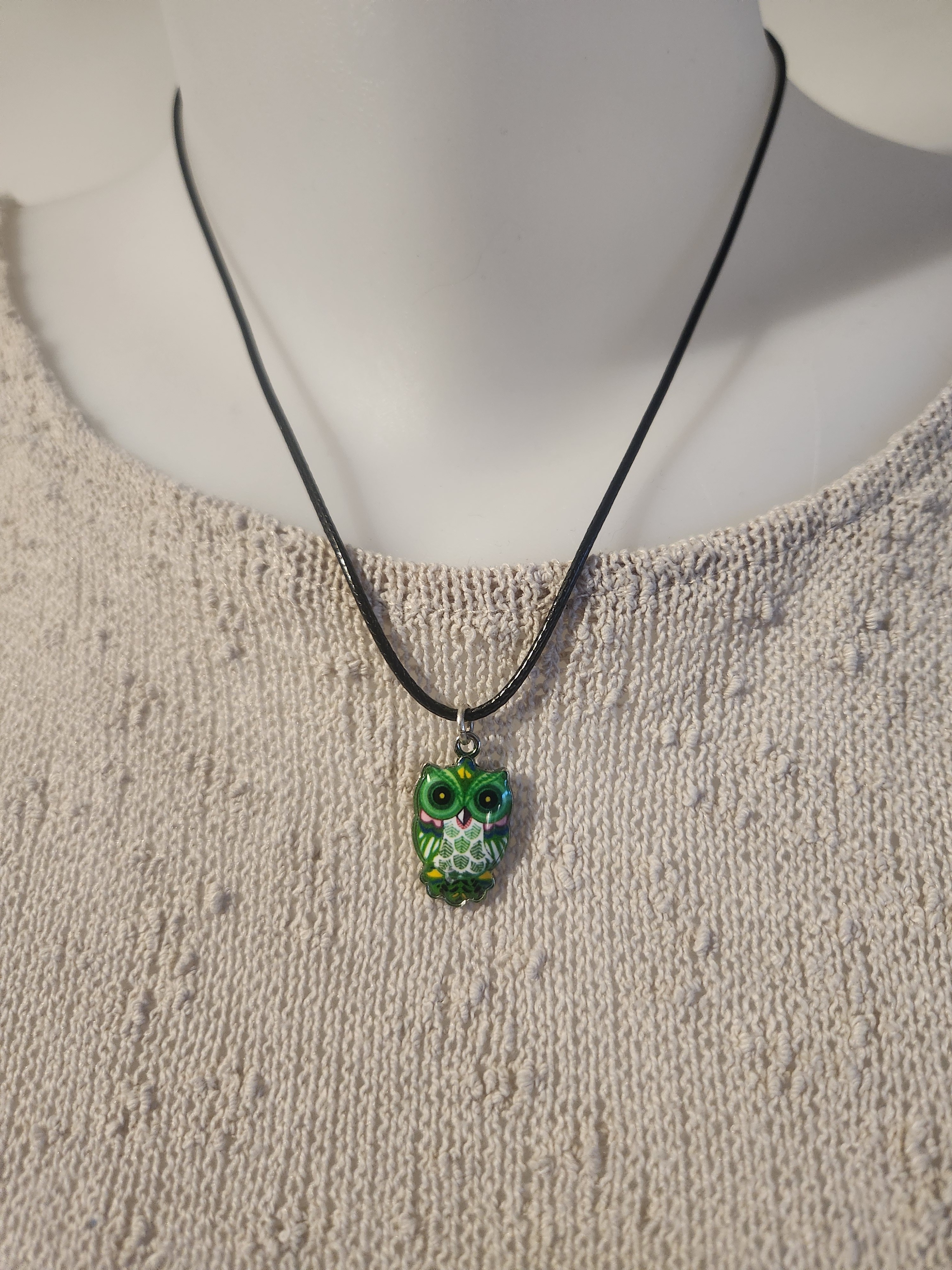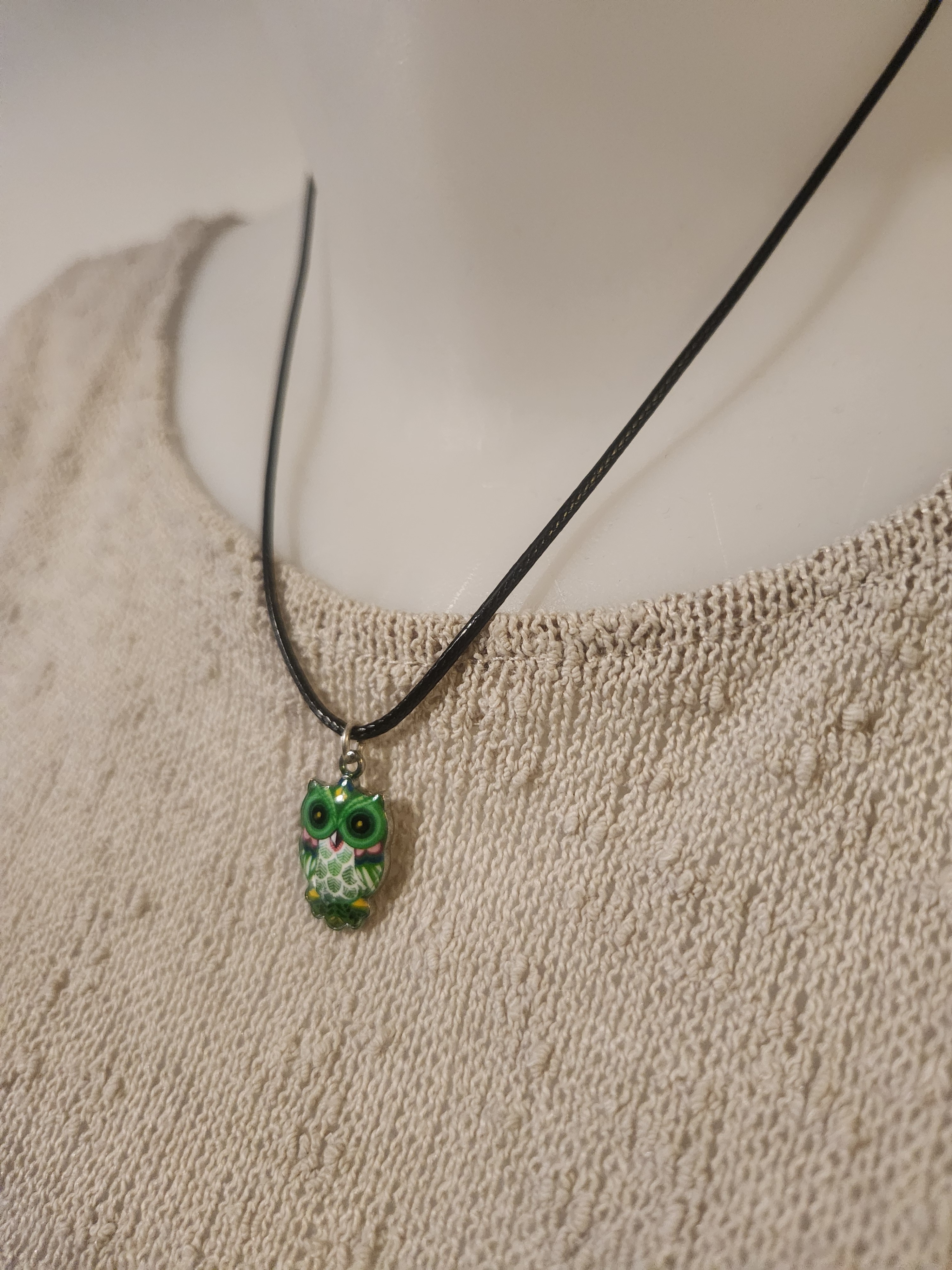 Je vous propose ce pendentif chouette verte monté sur tour de cou noir en coton ciré