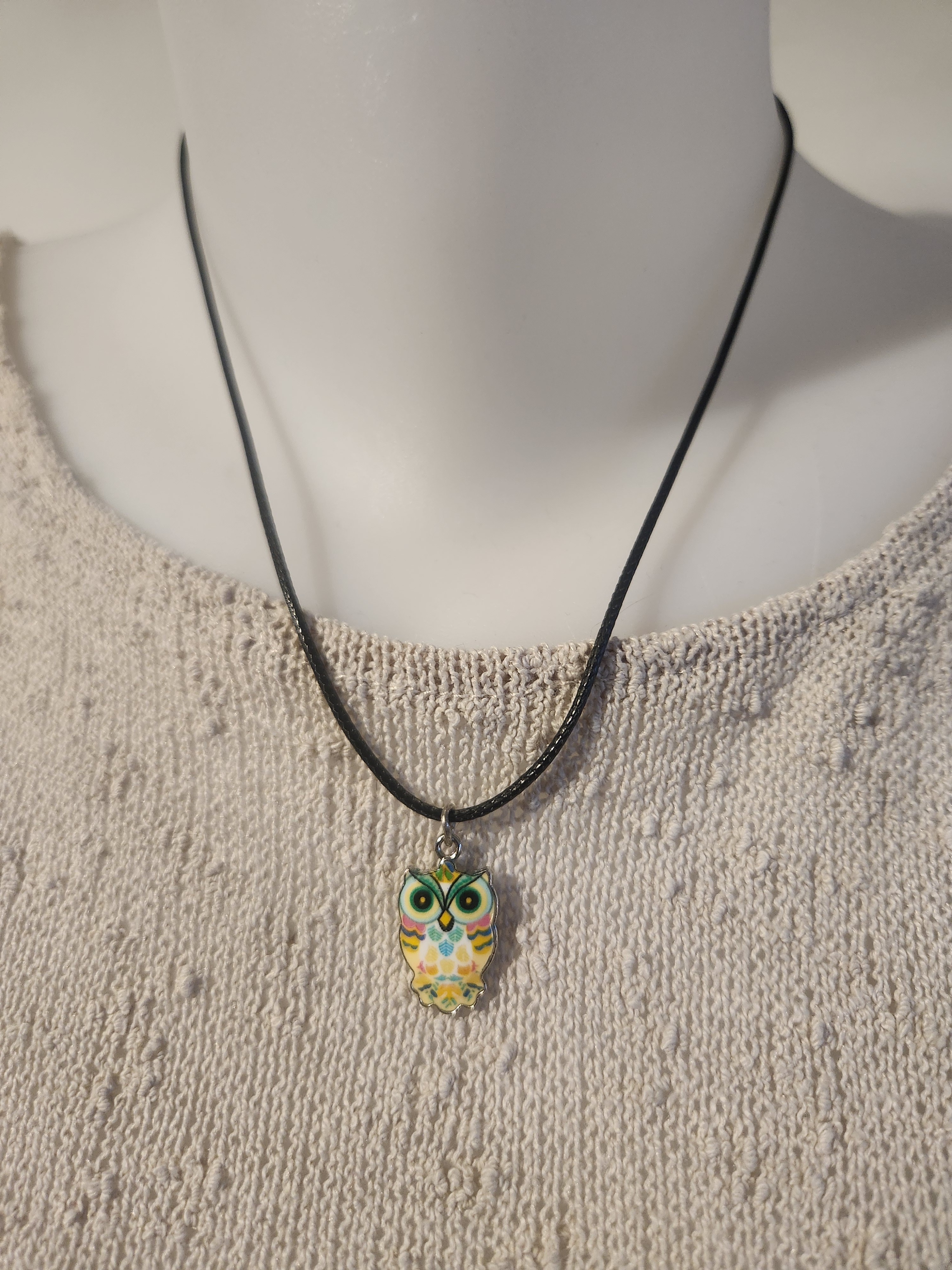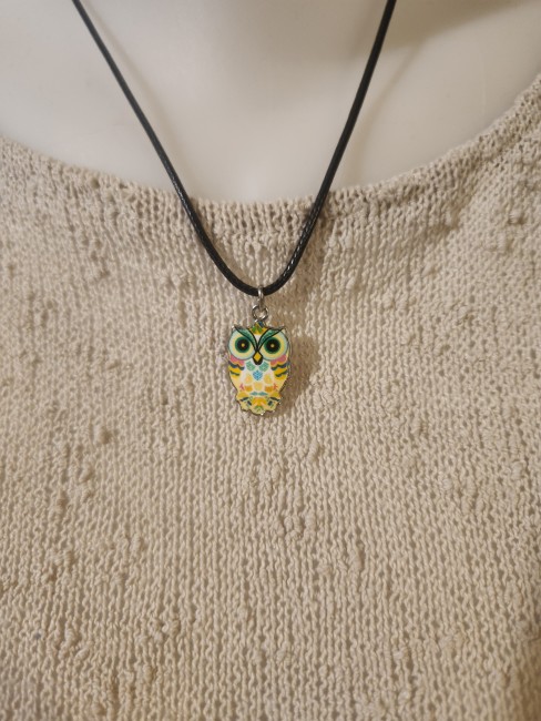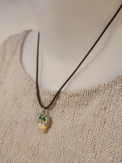 Je vous propose ce pendentif chouette arc en ciel monté sur tour de cou noir en coton ciré