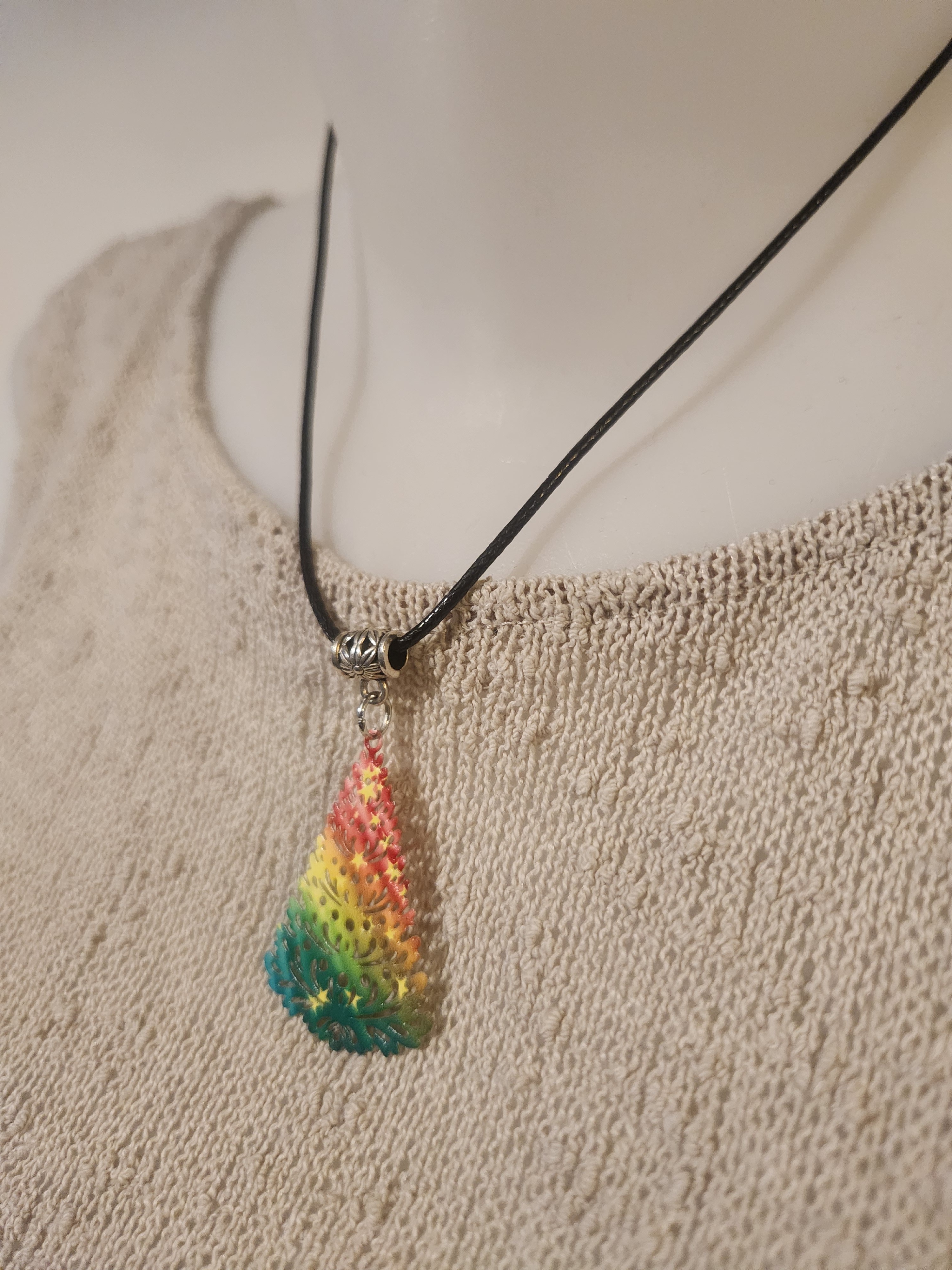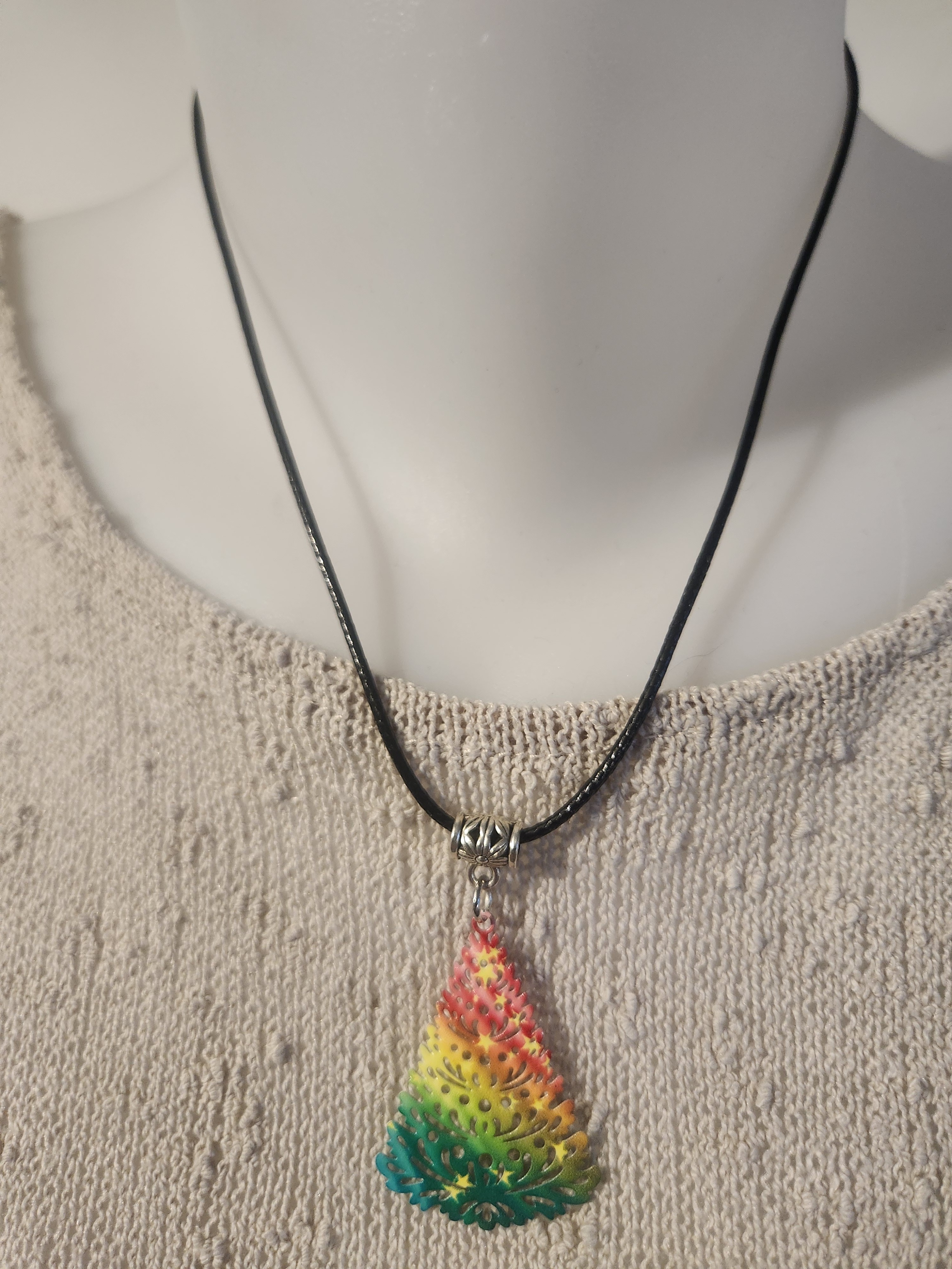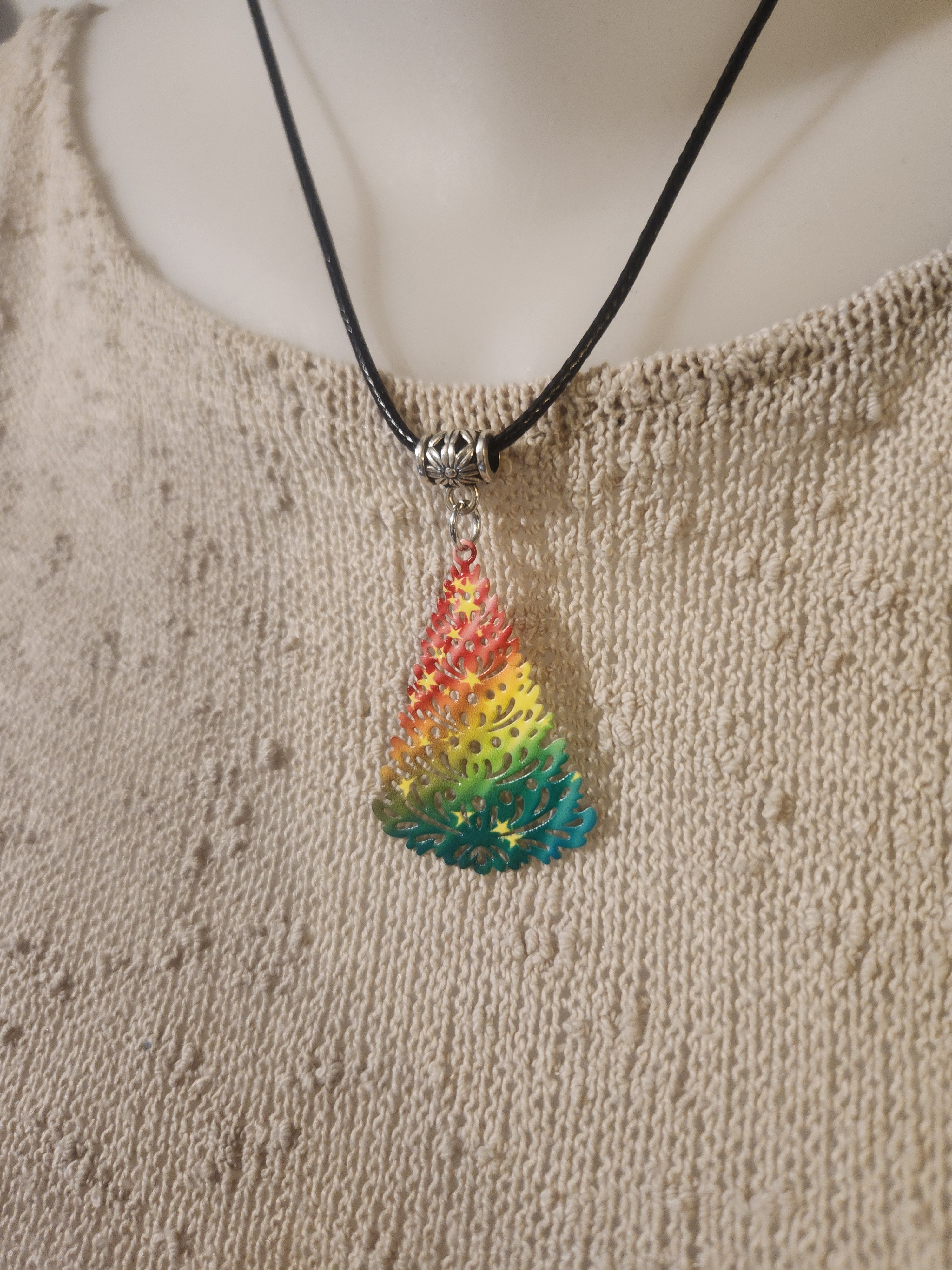 Je vous propose ce pendentif estampe sapin de Noël multicolore en laiton.