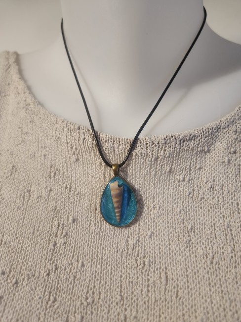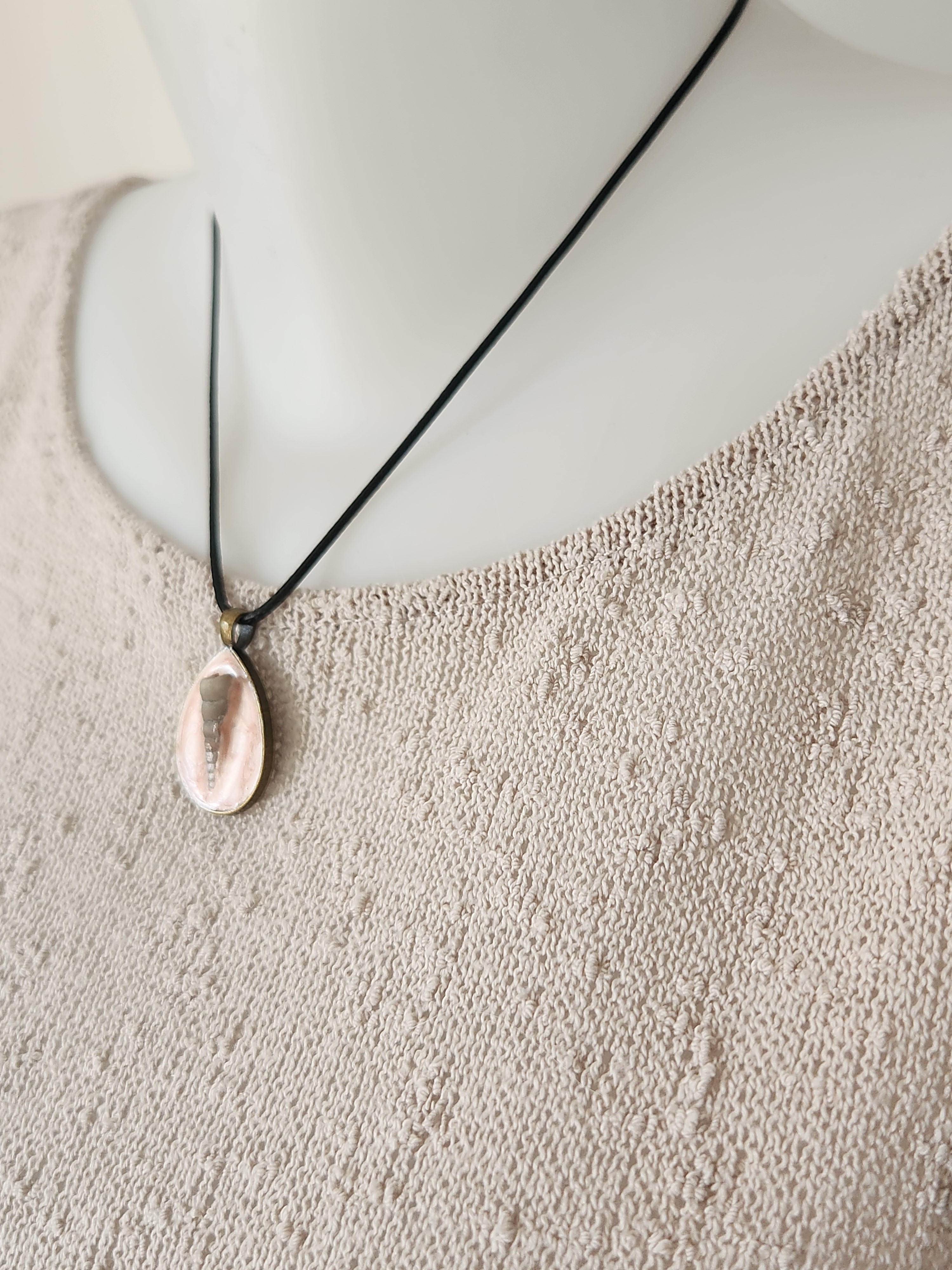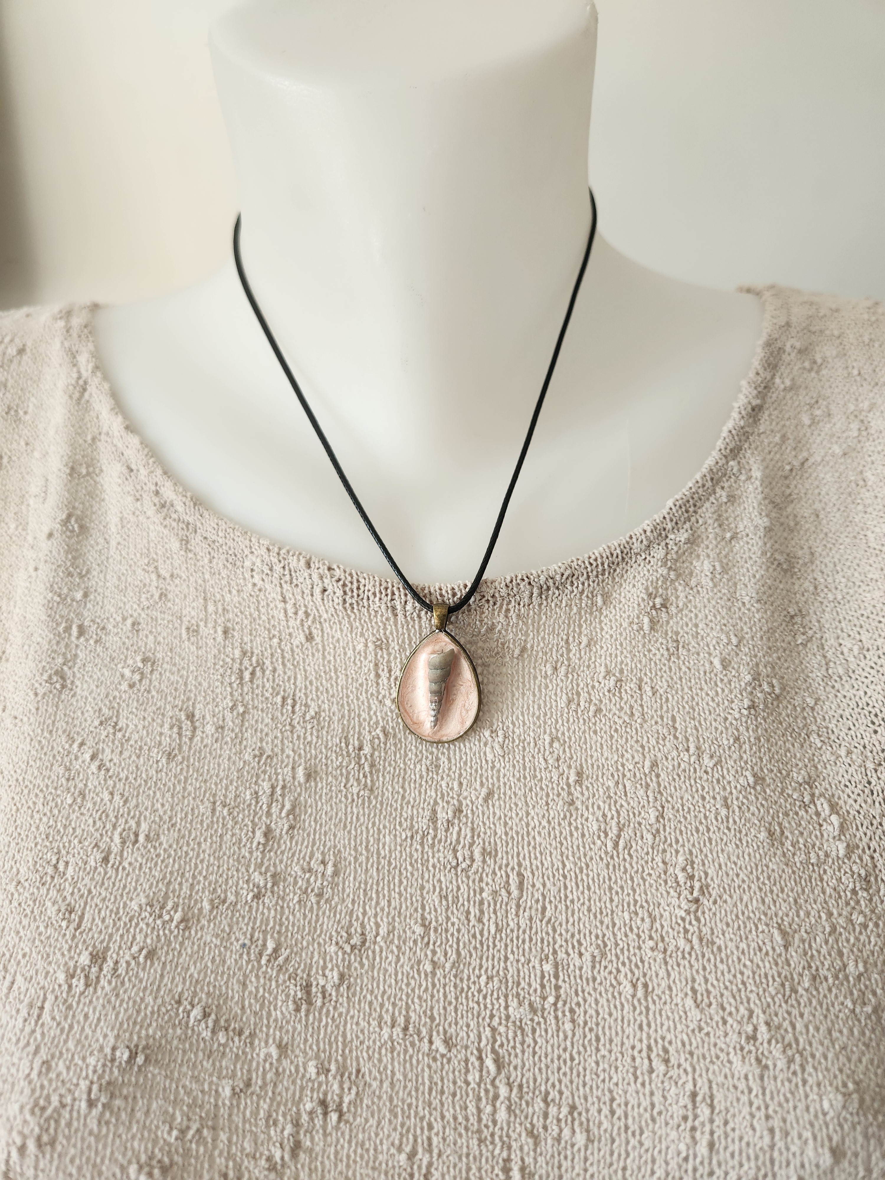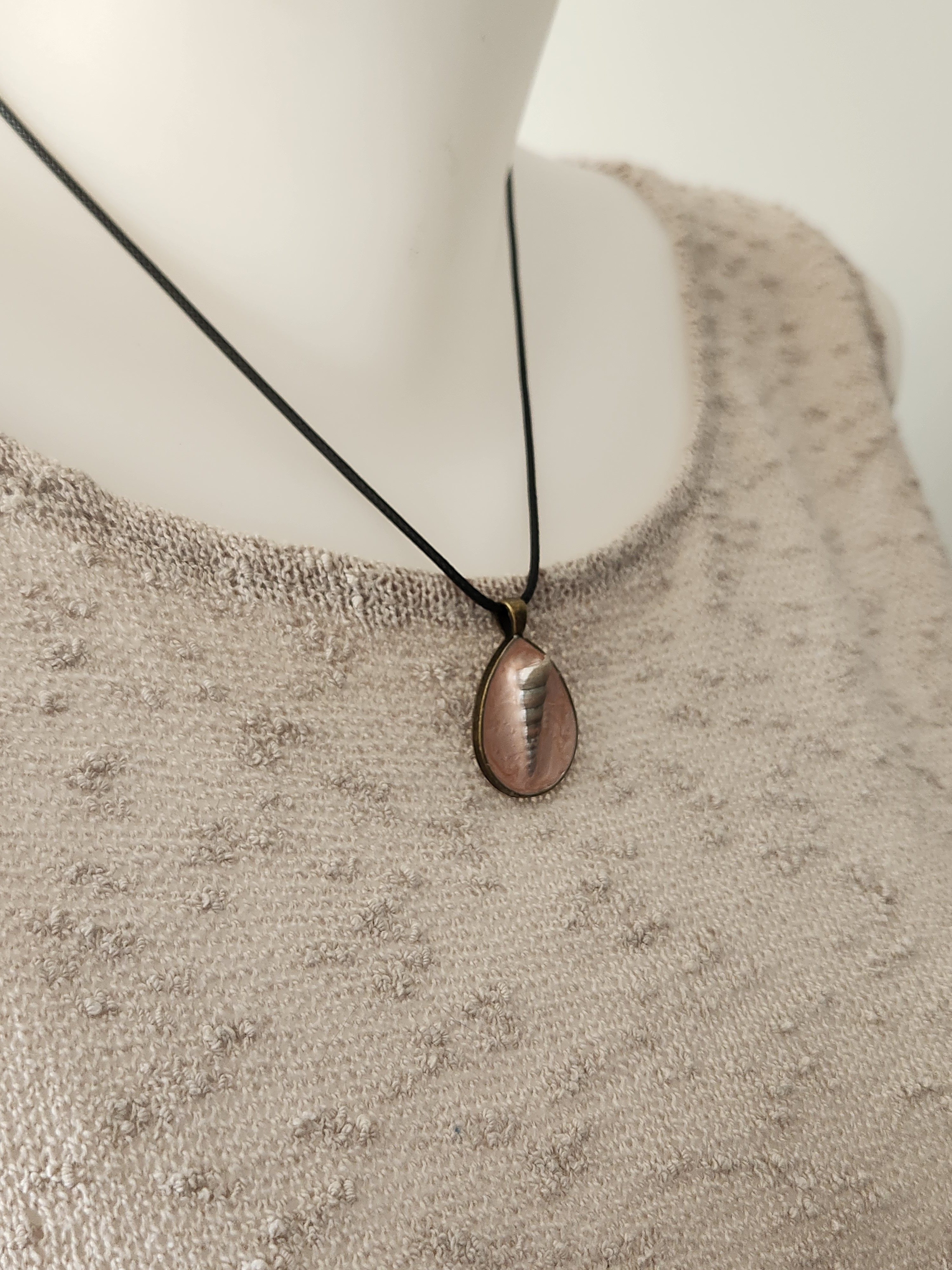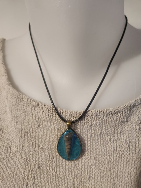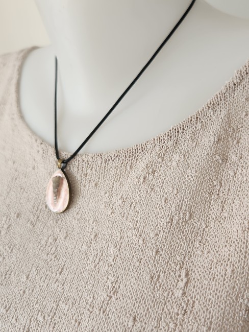 Longueur 24.5cm. il est monté sur un tour de cou en coton ciré noir.