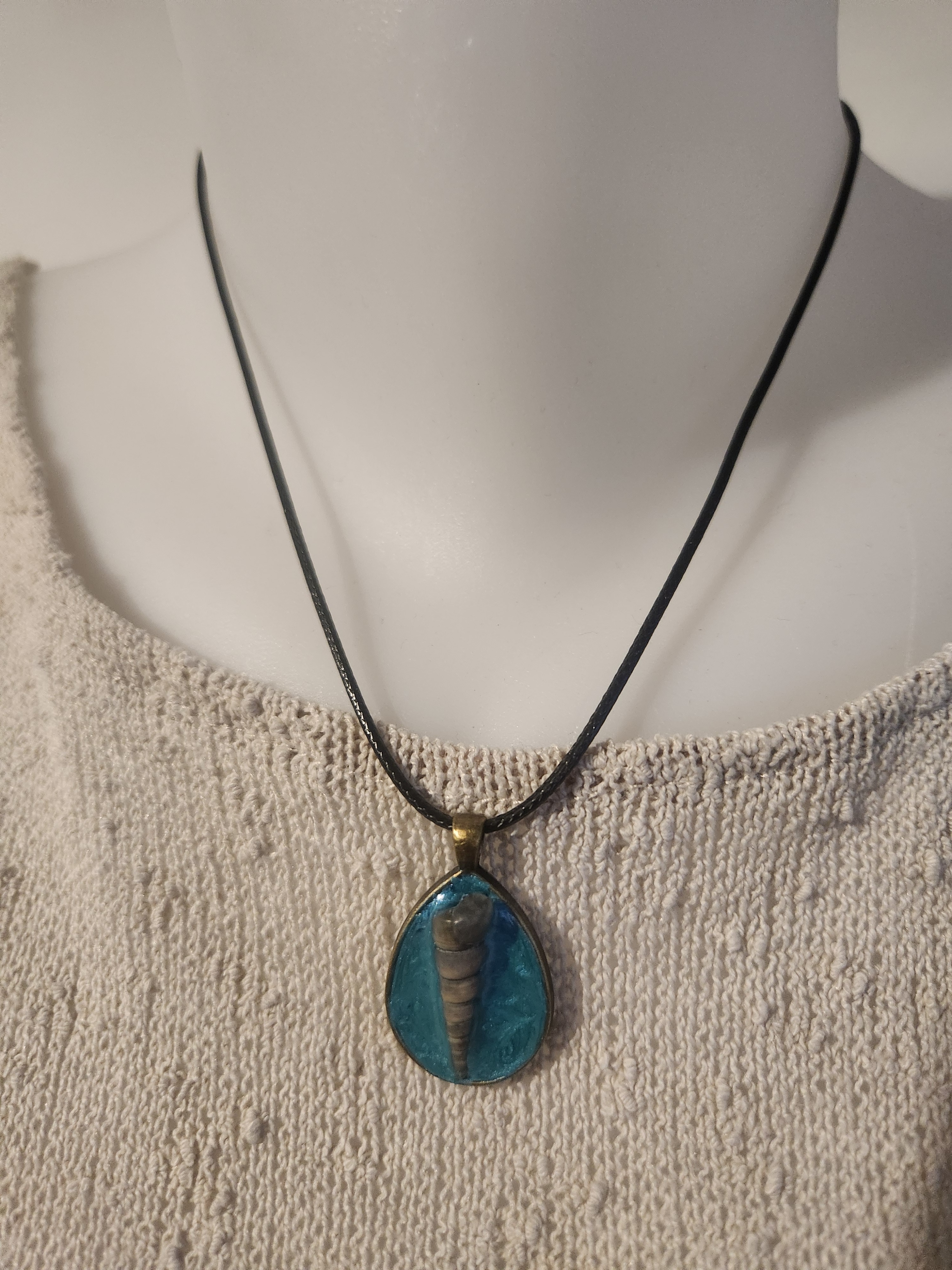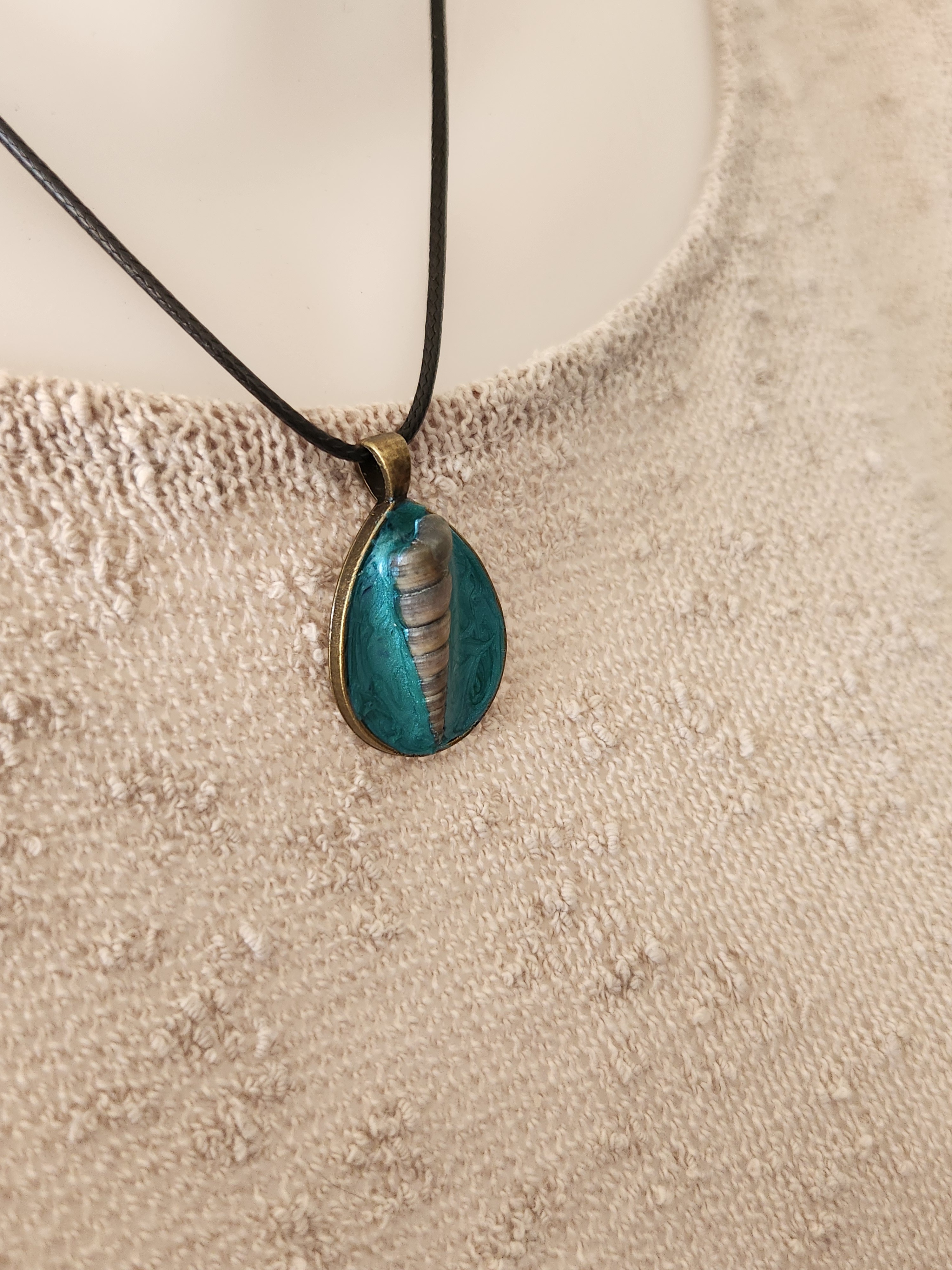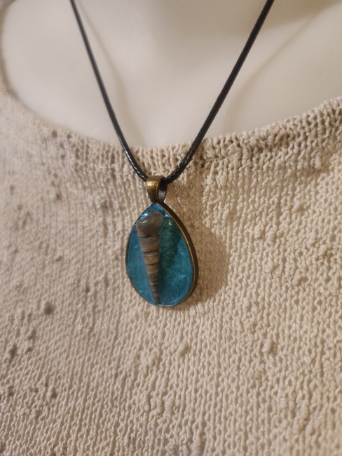 Je vous propose ce cabochon coloris bronze et bleu avec en son centre un coquillage.