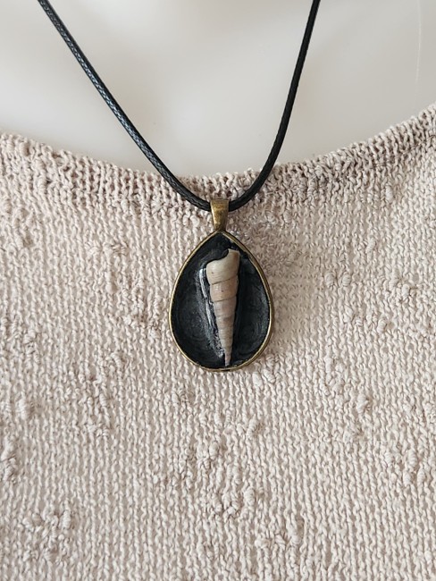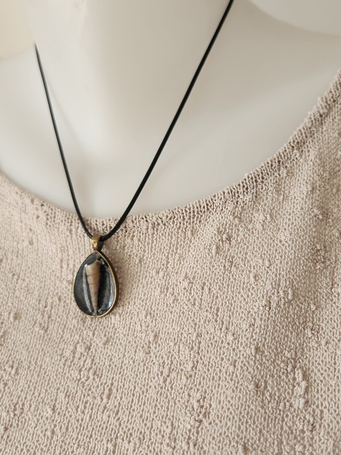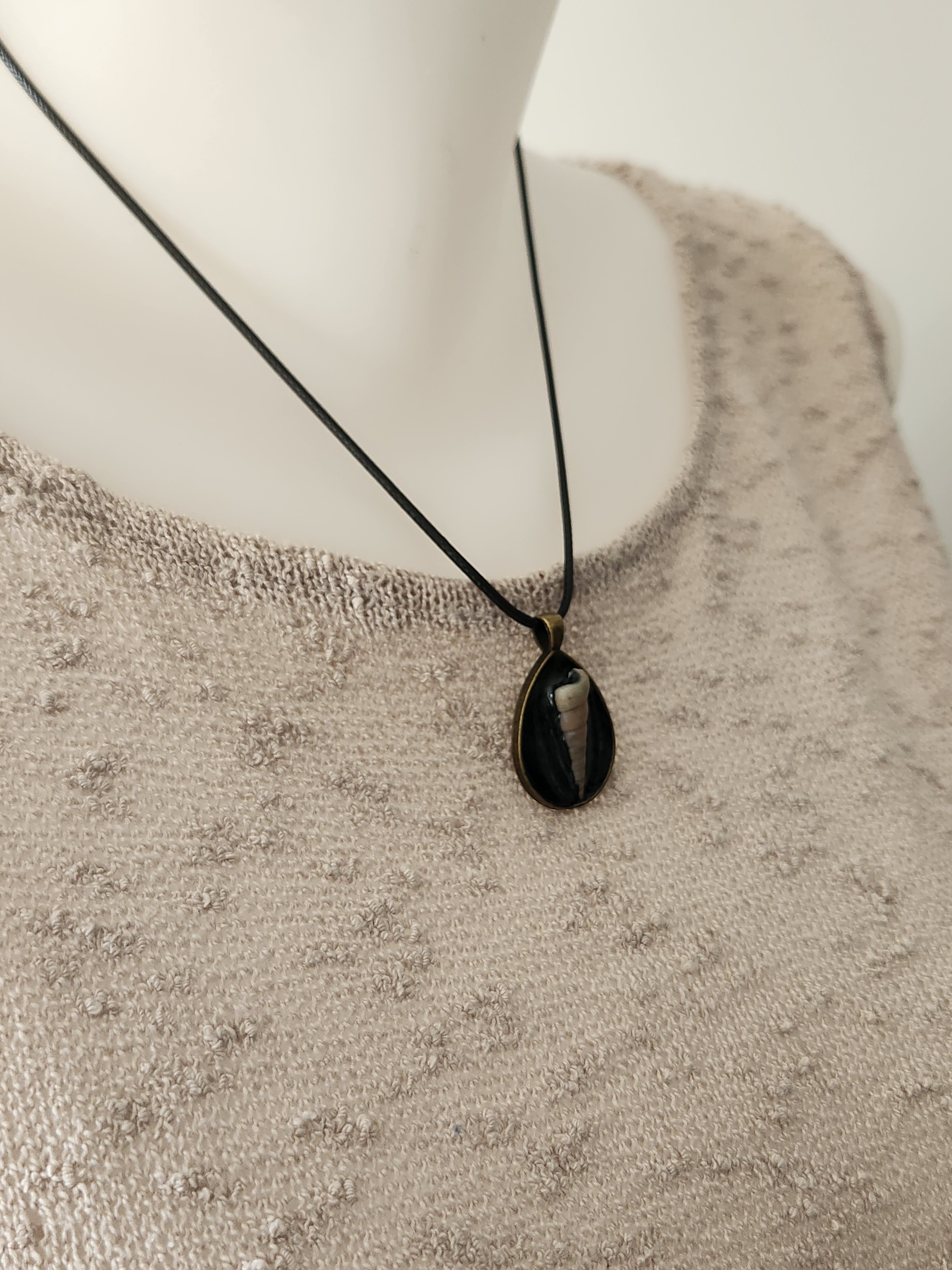 Longueur 24.5cm. il est monté sur un tour de cou en coton ciré noir.