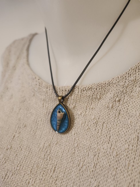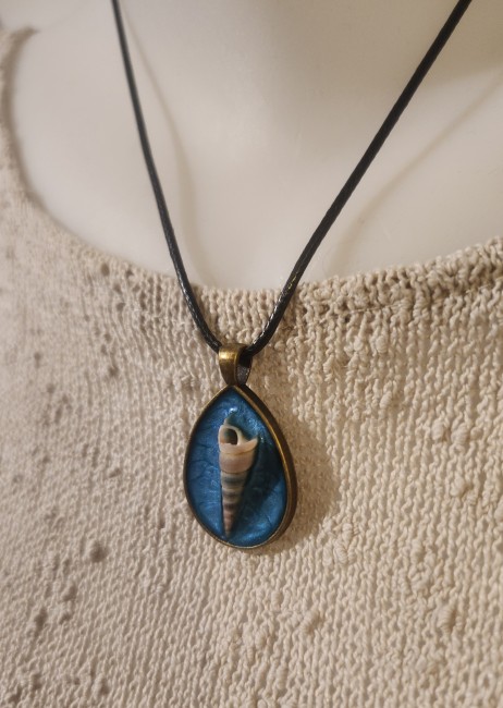 Je vous propose ce cabochon coloris bronze et bleu alvéoles avec en son centre un coquillage.