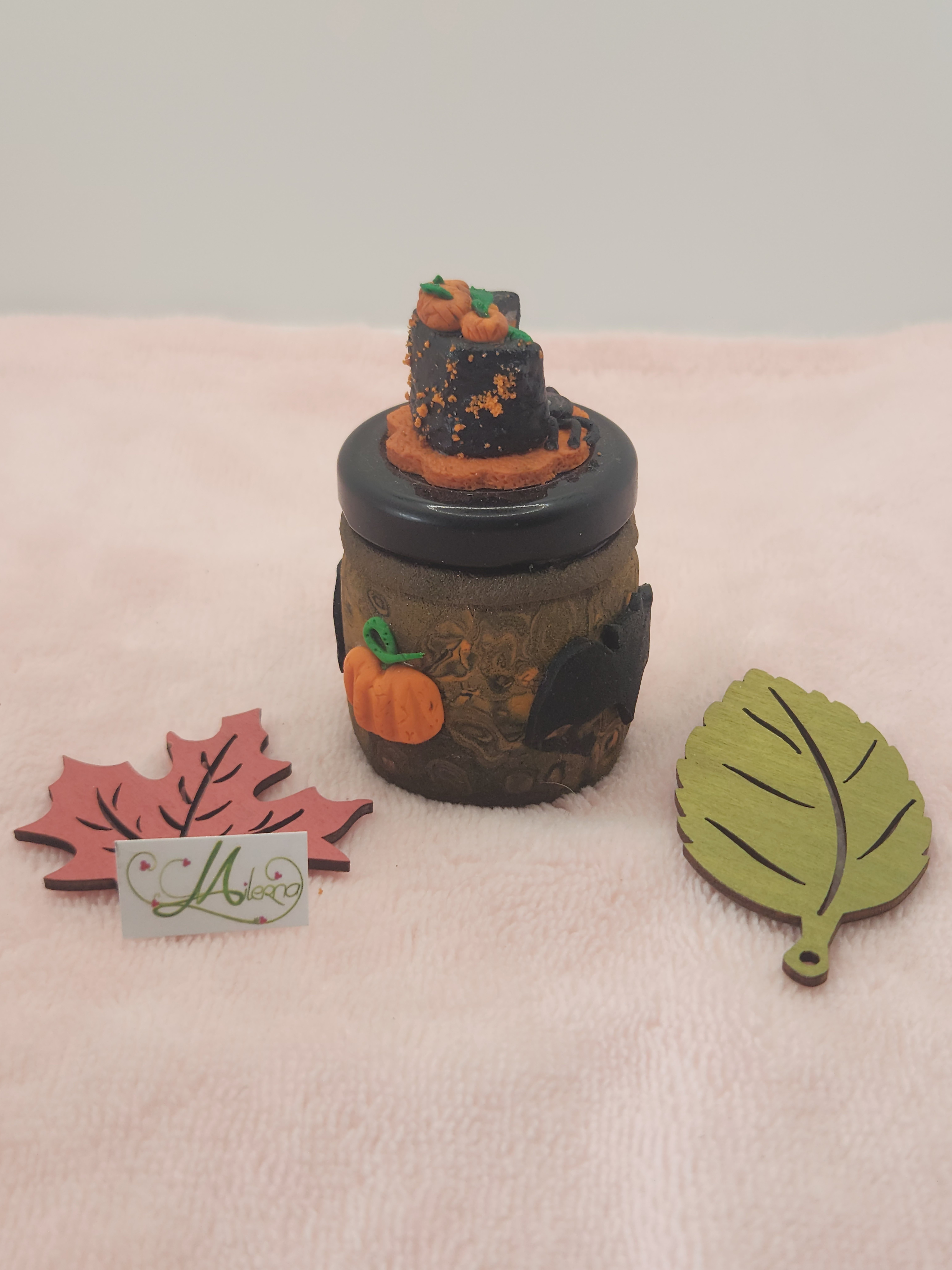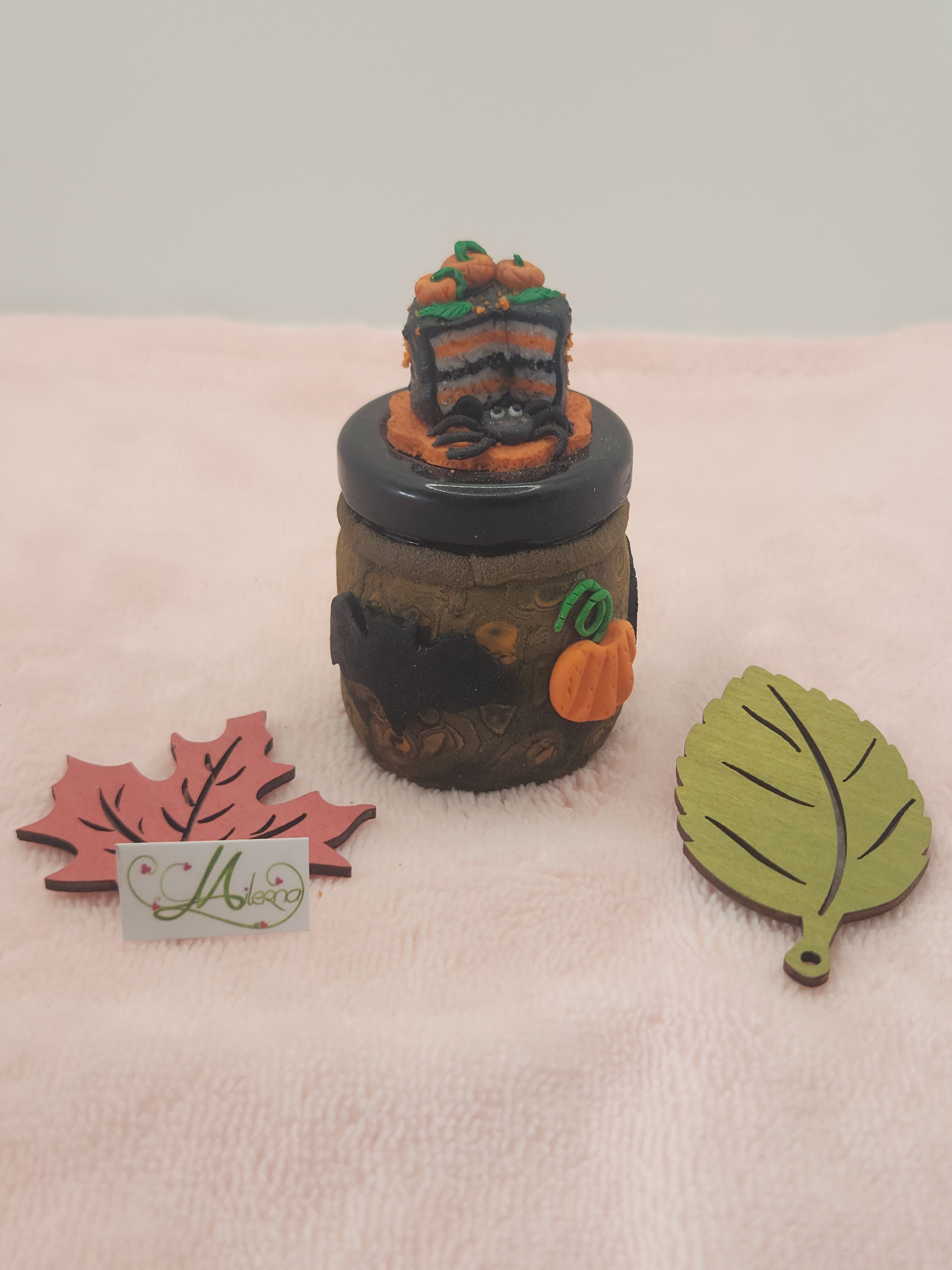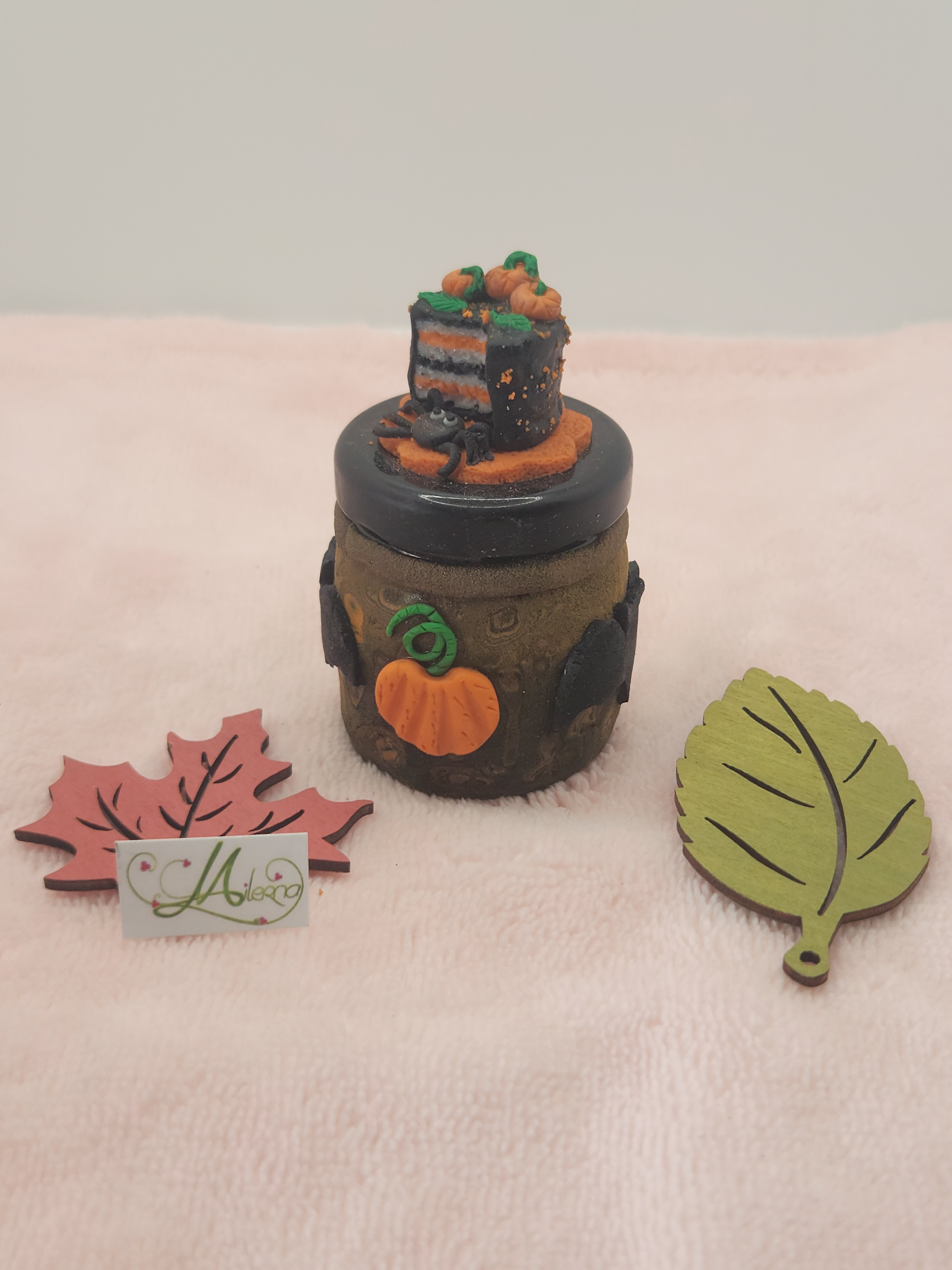 Je vous propose ce pot gateau d'halloween avec des citrouilles et une araignée.