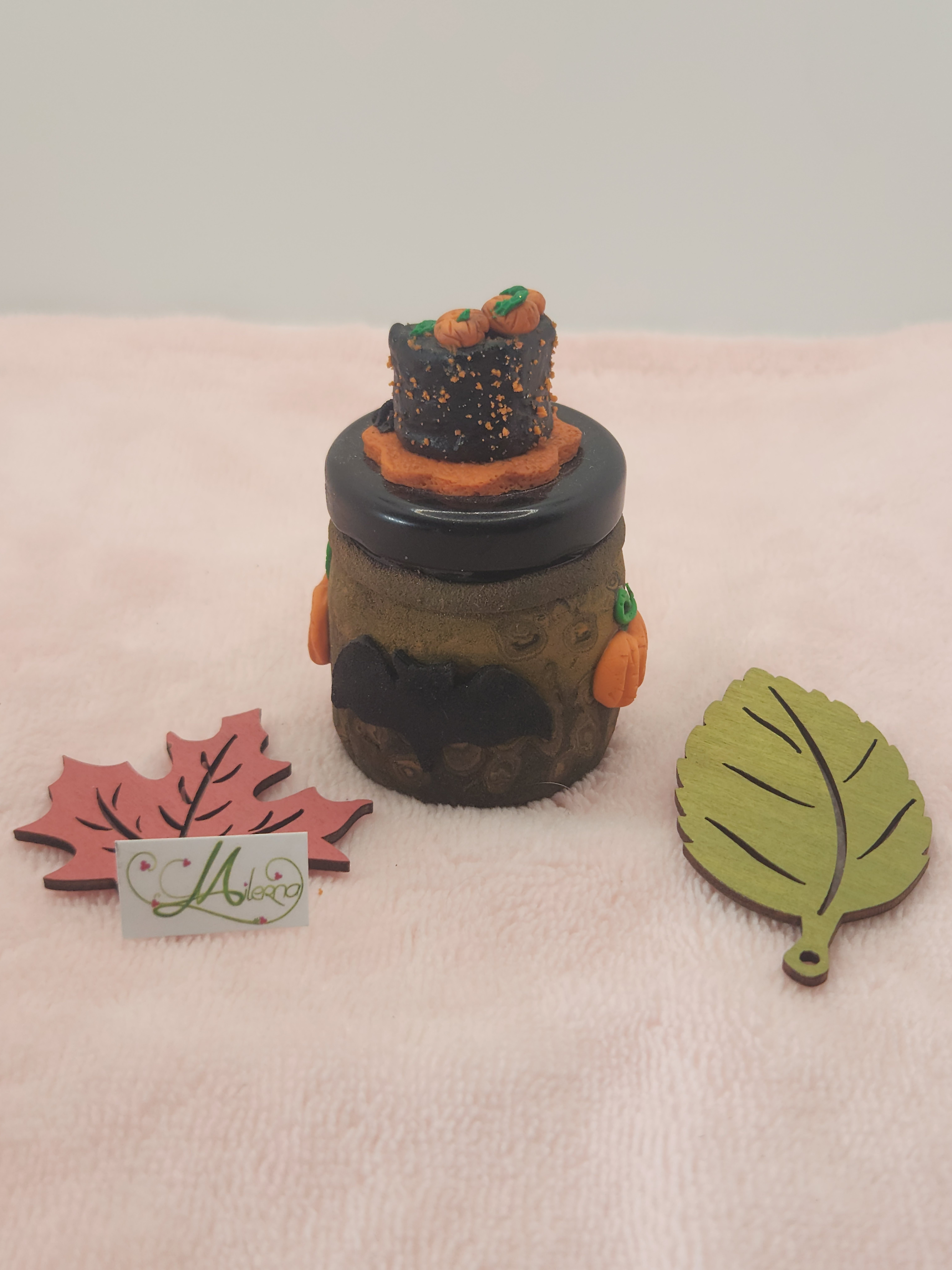 Sur le tour de ce pot qui est en verre recouvert de polymère, vous trouverez deux citrouilles et deux chauves souris.