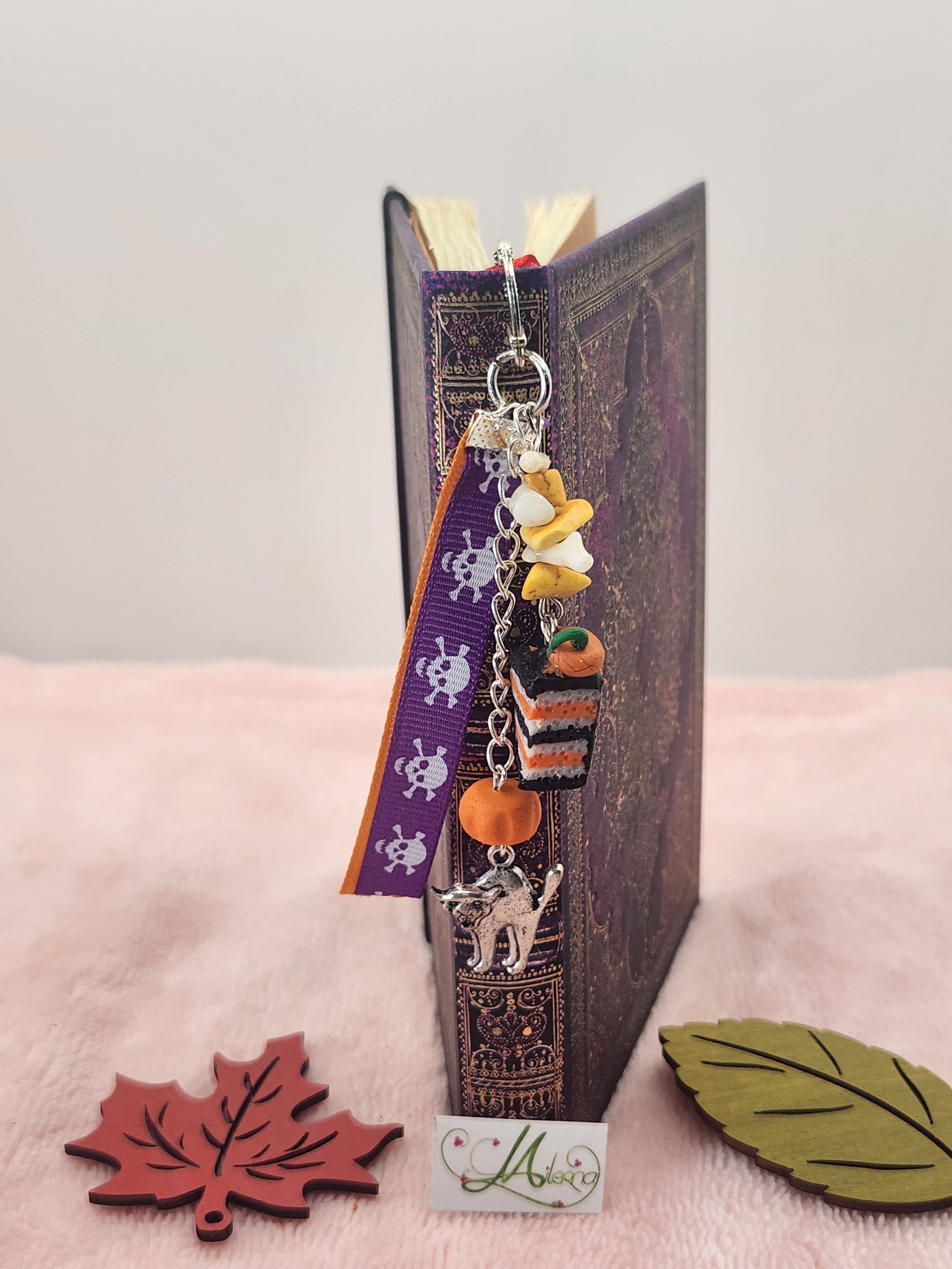 Il est composé d'une chainette avec une citrouille en polymère et breloque chat.