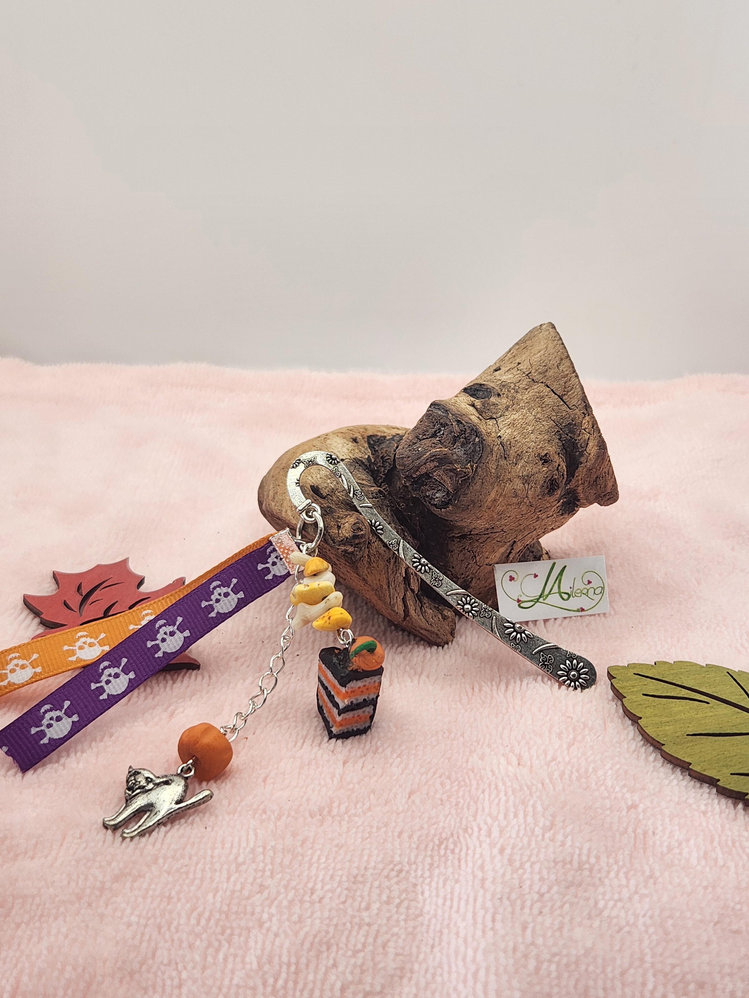 Des perles jaune et crème en forme d'os avec une part de gâteau Halloween en polymère et deux rubans, l'un orange et l'autre violet avec des têtes de mort.