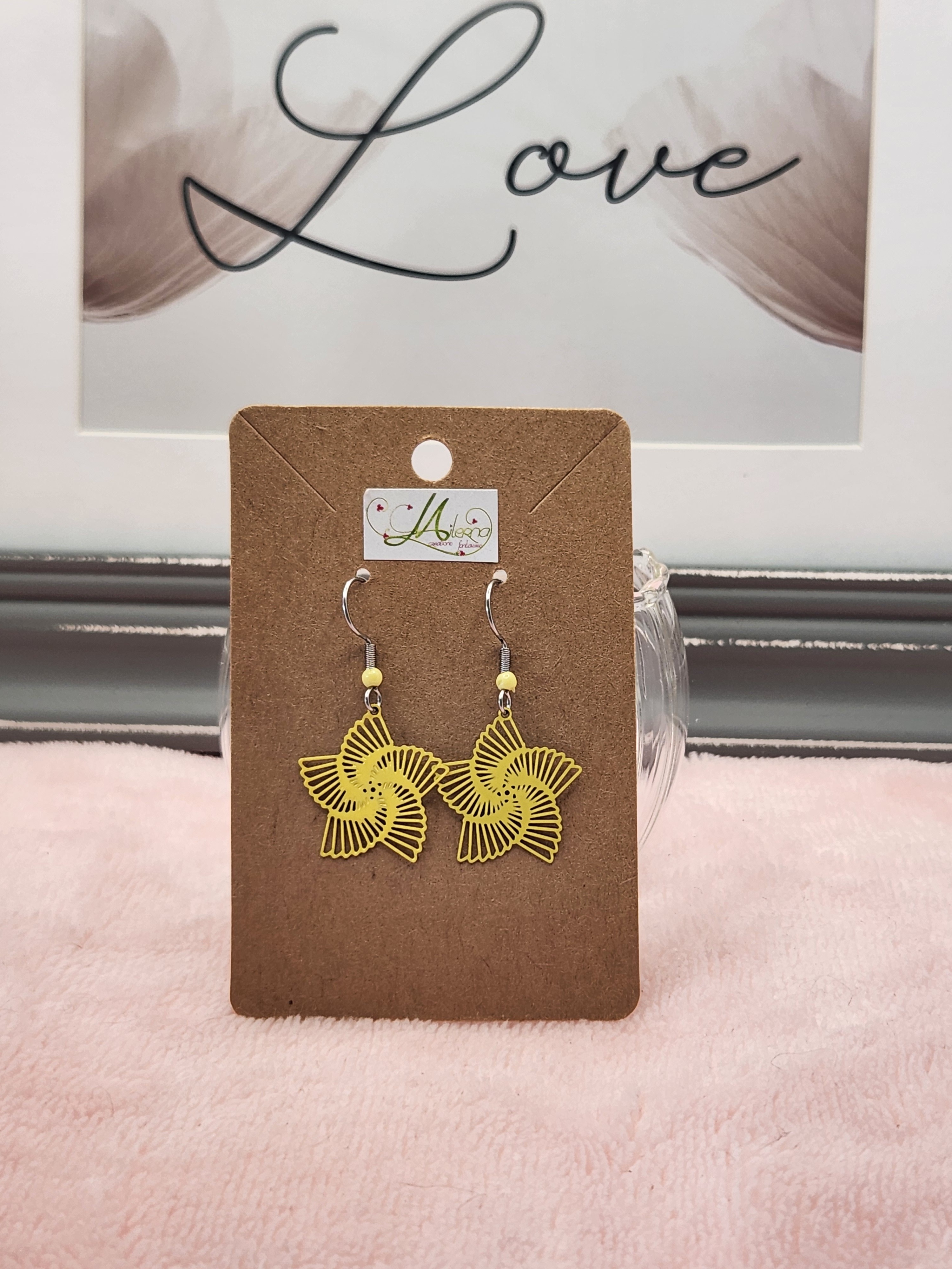 Je vous propose cette paire de boucles d'oreilles estampe spirale jaune avec perle jaune.