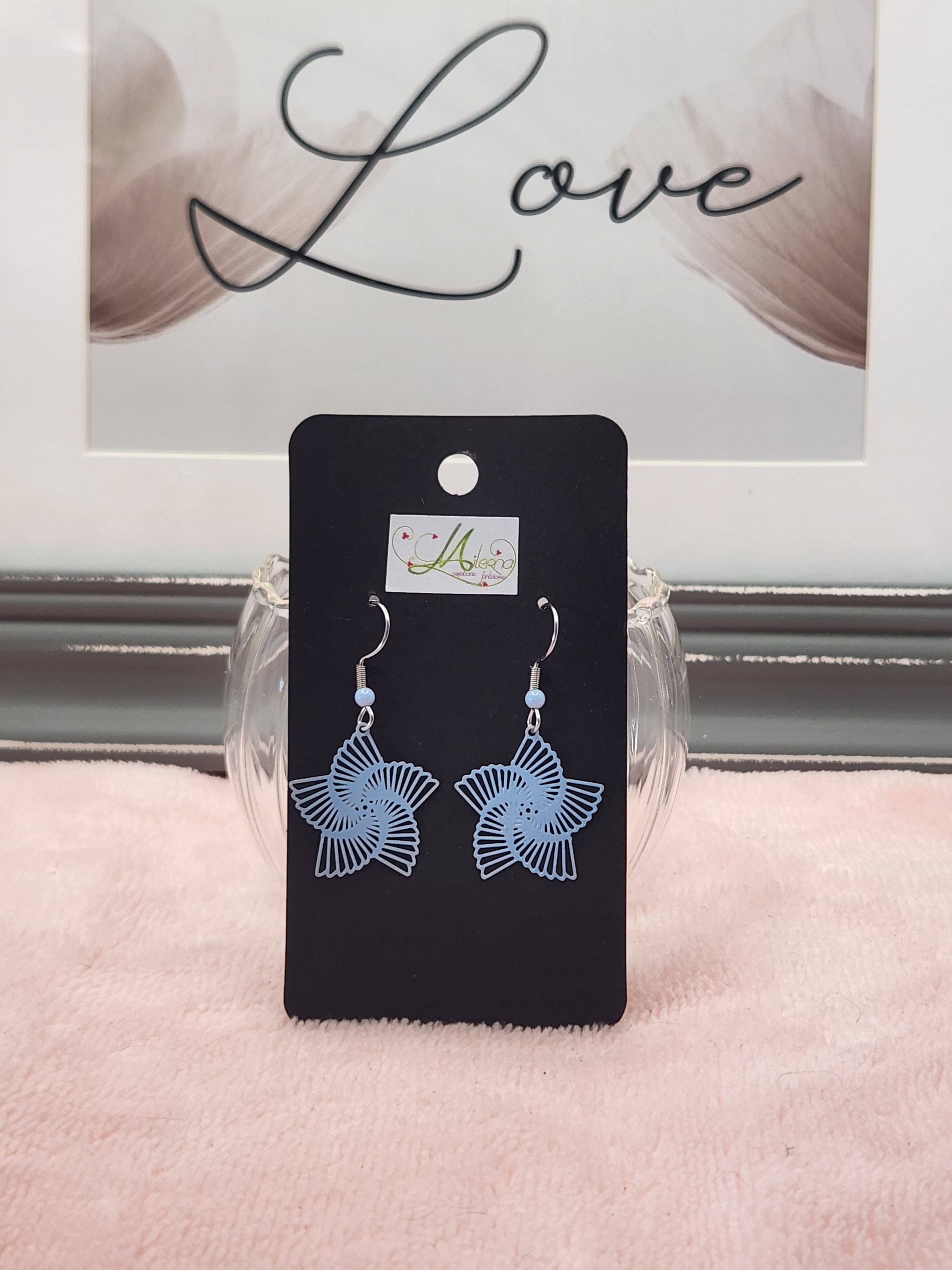 Je vous propose cette paire de boucles d'oreilles estampe spirale bleue clair avec perle bleue.