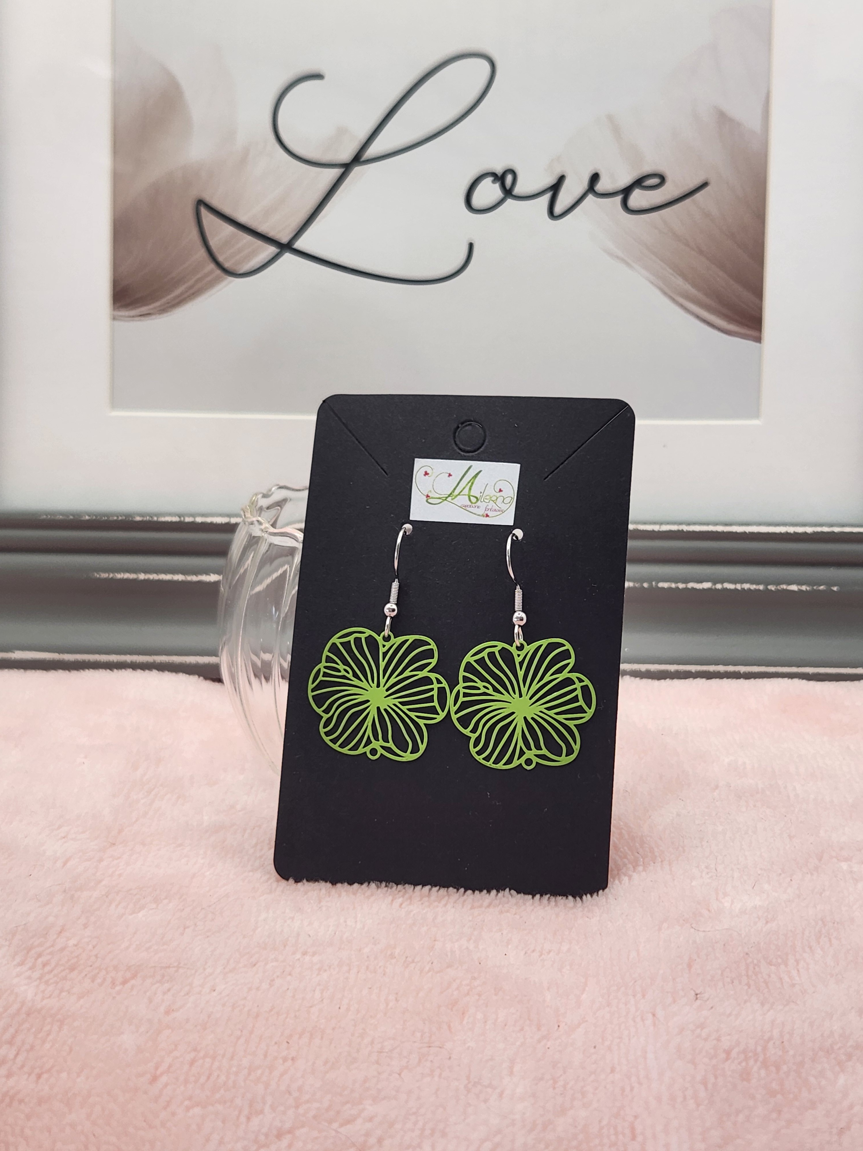 Je vous propose cette paire de boucles d'oreilles estampe fleur vert pomme avec perle argentée.