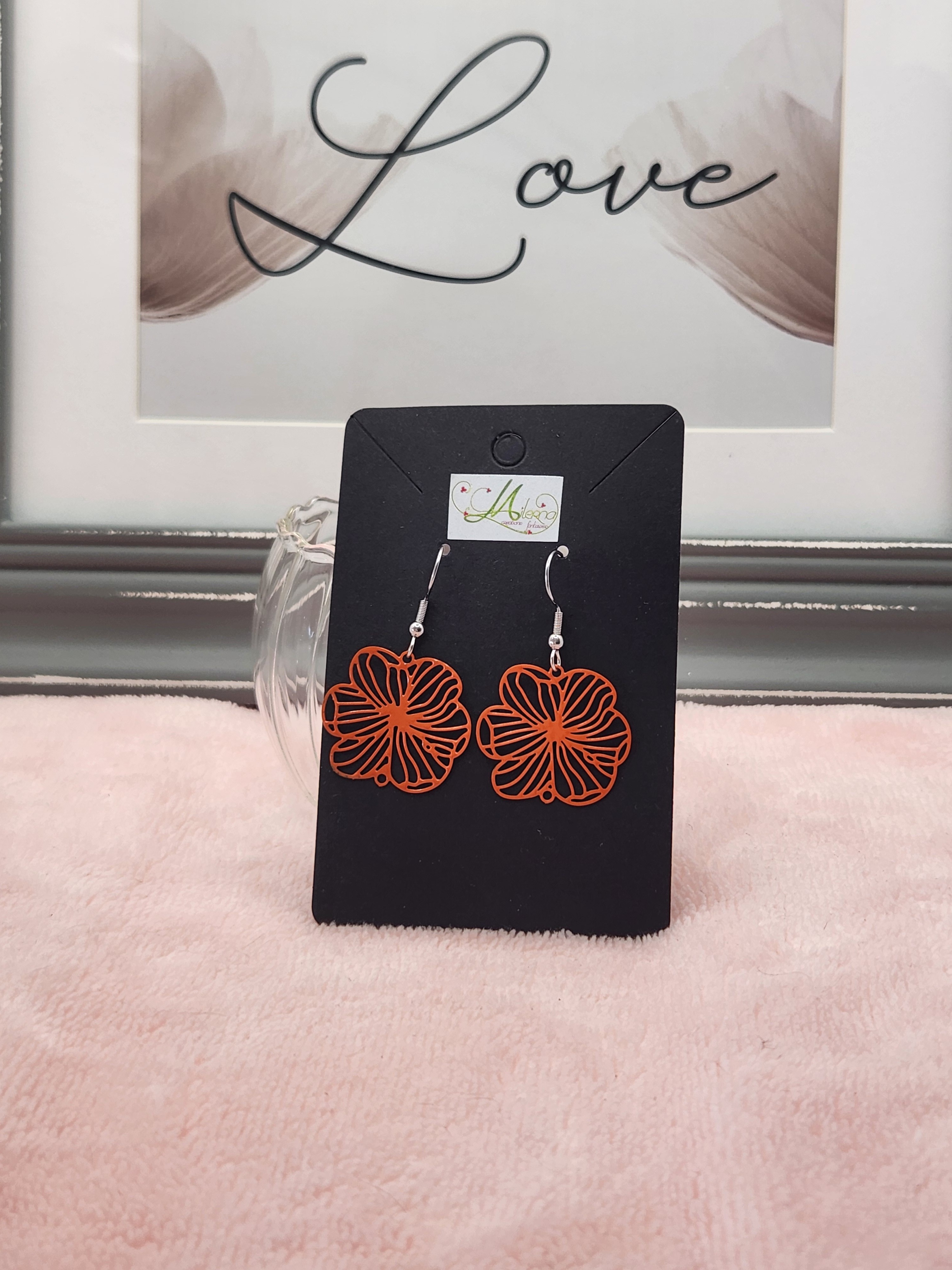 Je vous propose cette paire de boucles d'oreilles estampe fleur orange avec perle argentée.