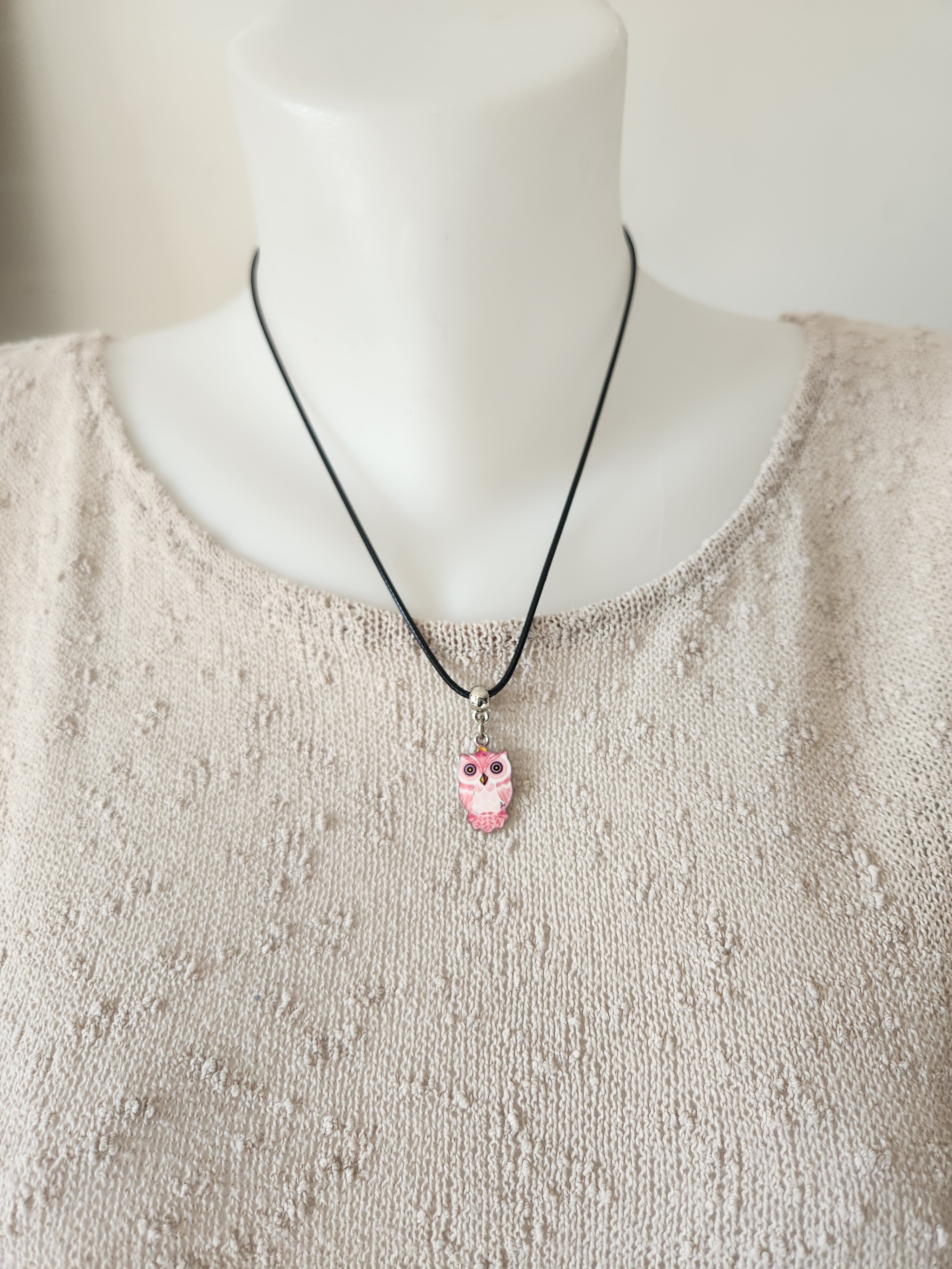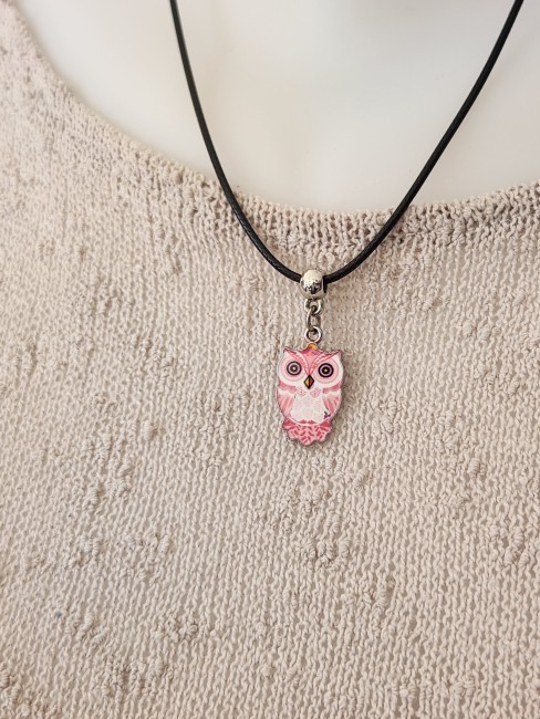 Je vous propose ce pendentif chouette de couleur rose monté sur tour de cou noir en coton ciré