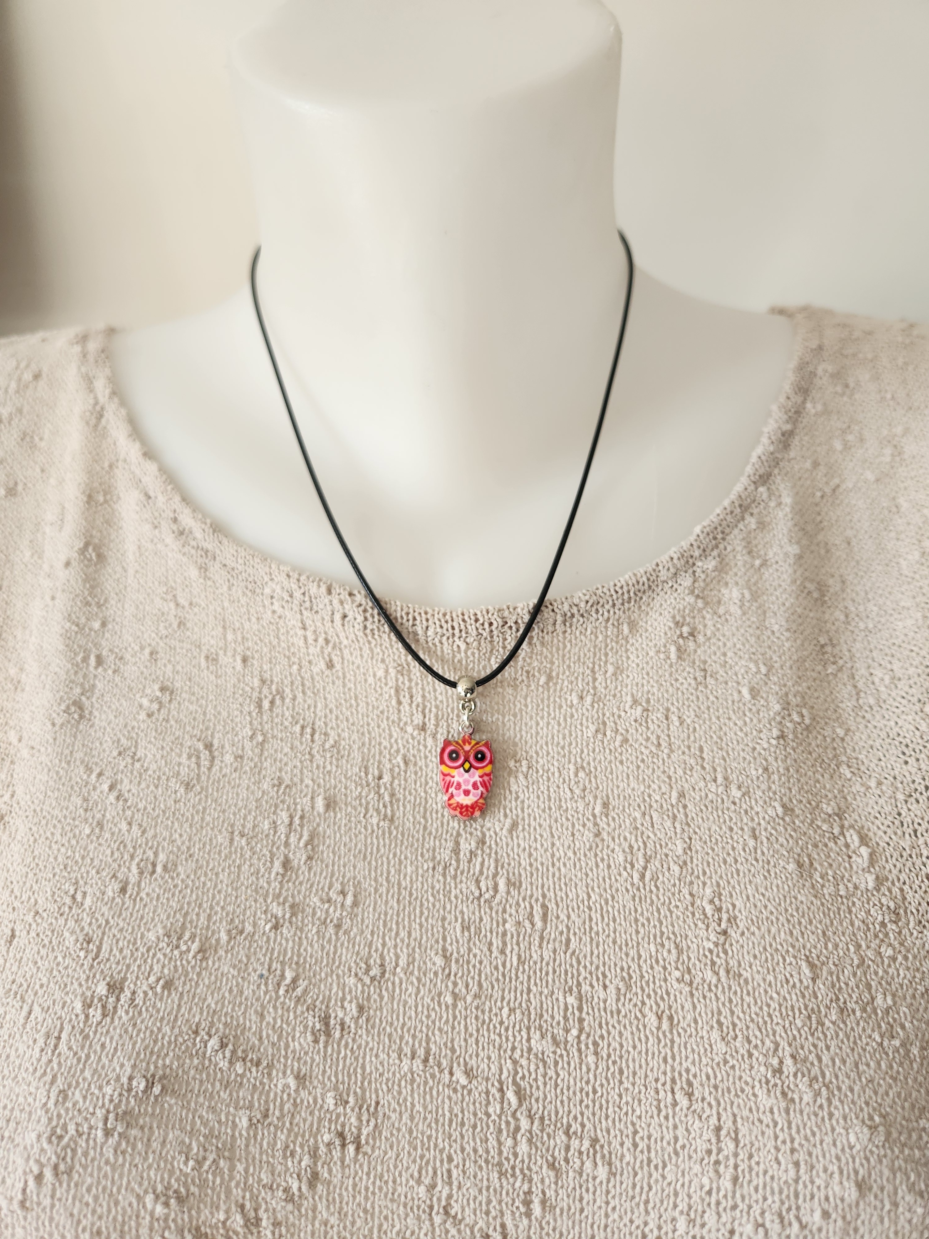 Je vous propose ce pendentif chouette de couleur rose monté sur tour de cou noir en coton ciré