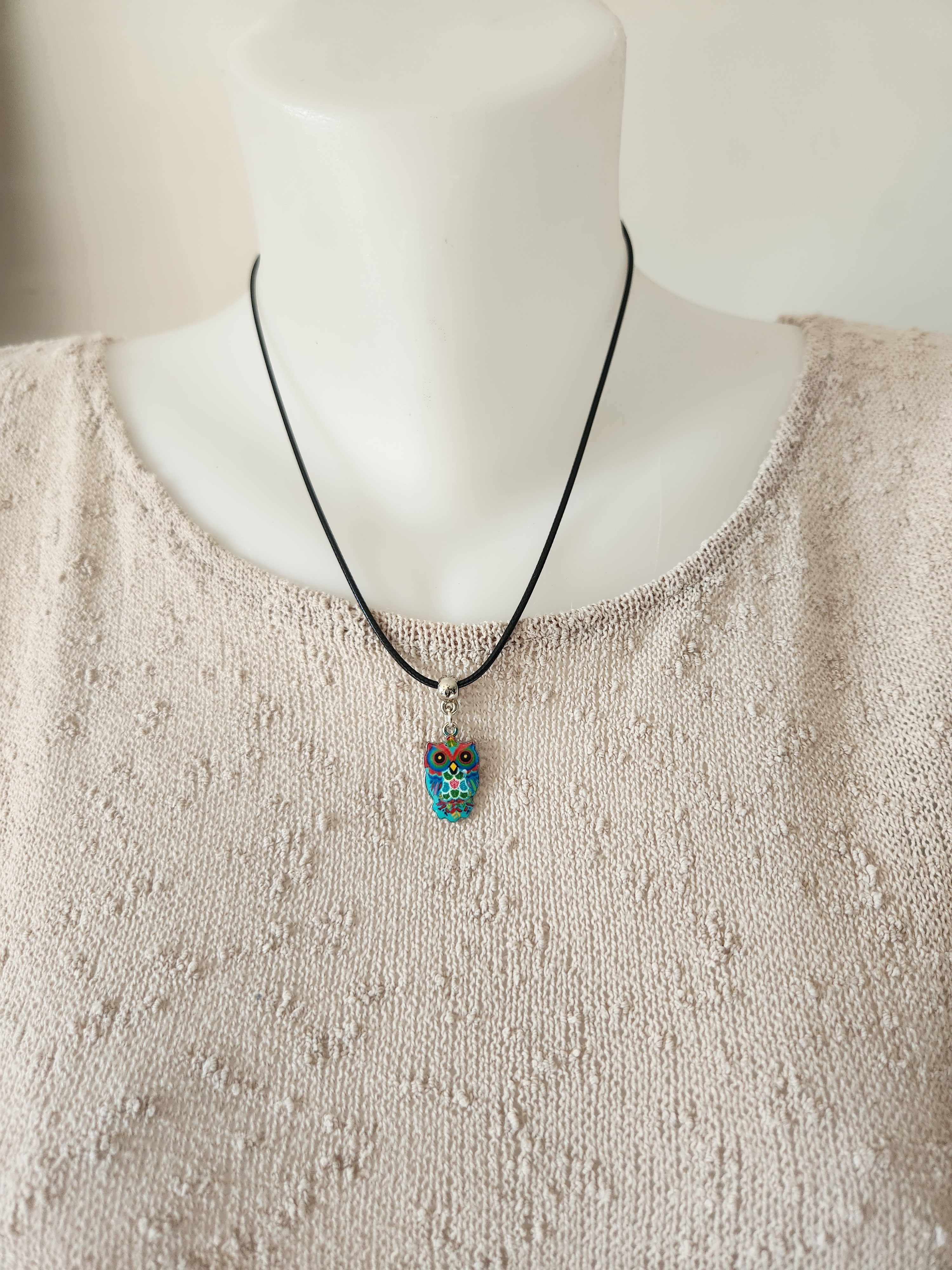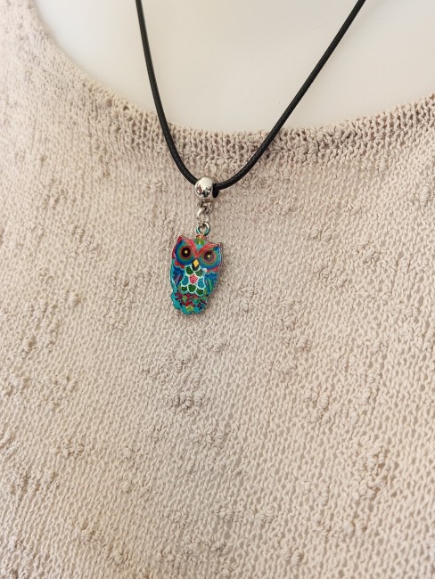 Je vous propose ce pendentif chouette de couleur bleue monté sur tour de cou noir en coton ciré