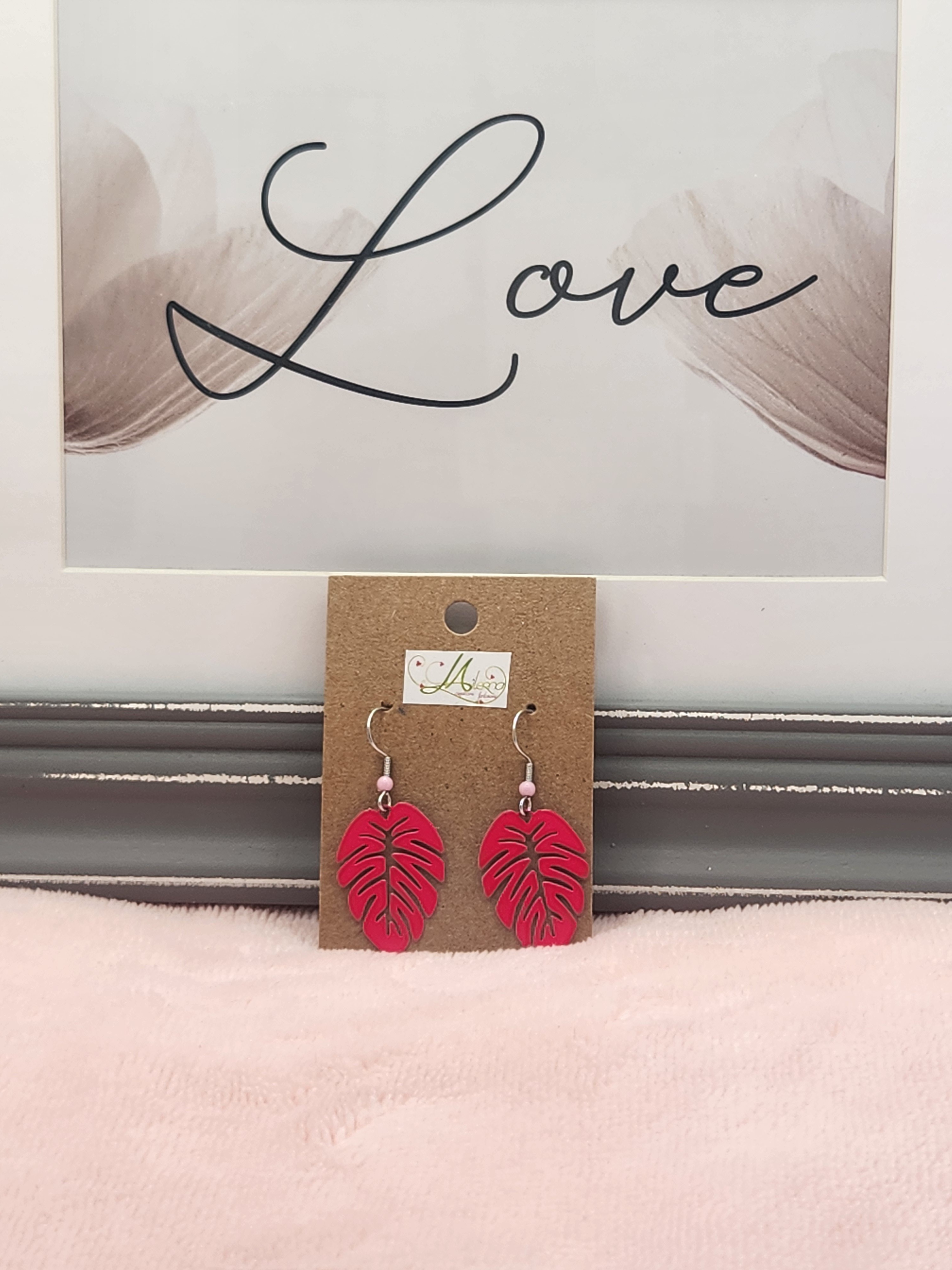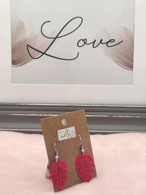 Je vous propose cette paire de boucles d'oreilles estampe feuille fushia avec perle rose.