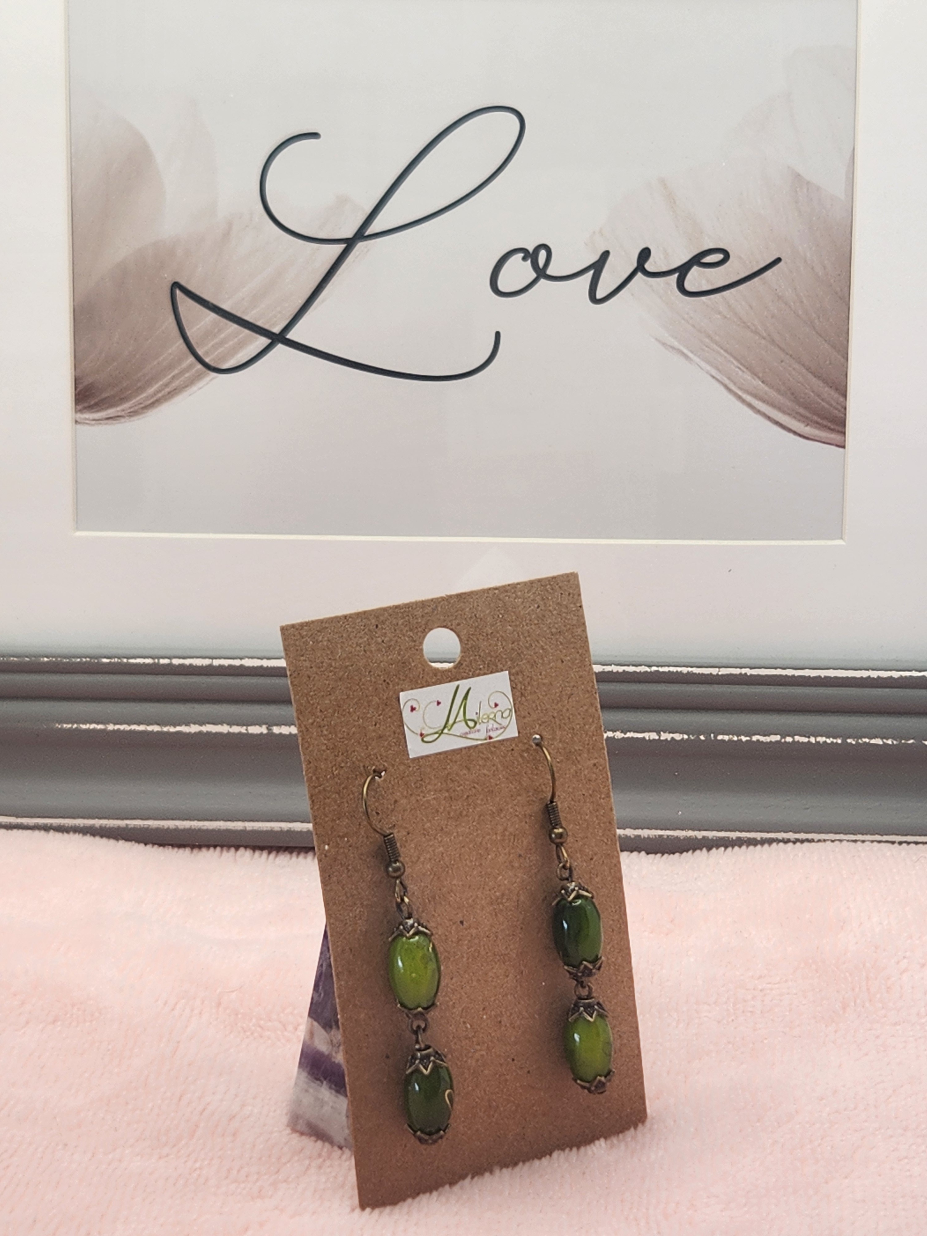 Boucles d'oreilles perles vertes ovales avec des motifs doré.