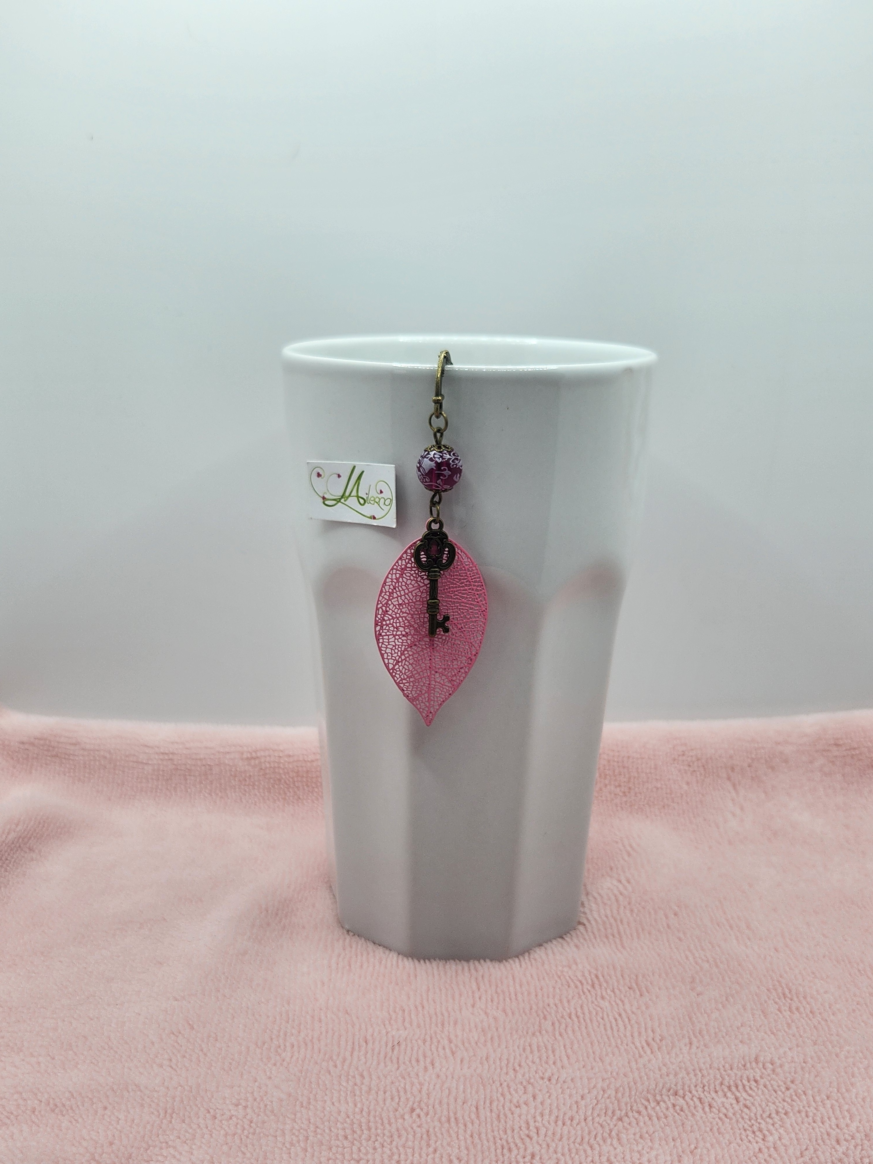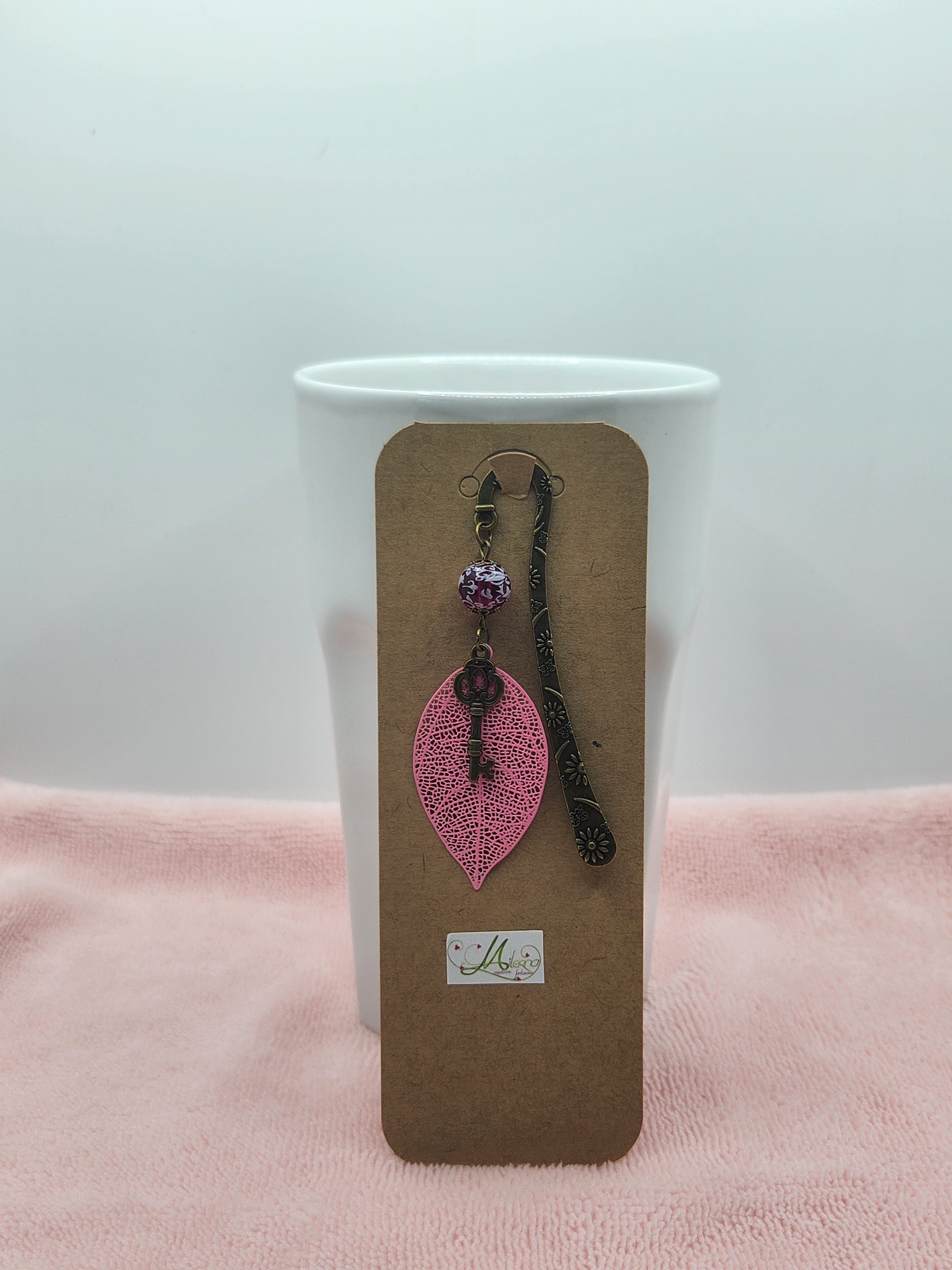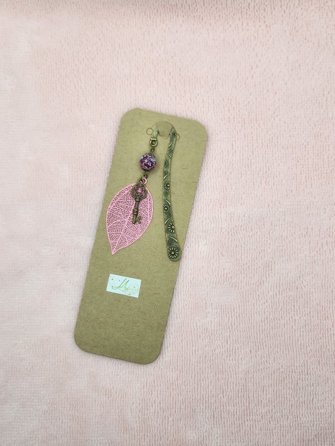 Marque-page fait main, délicat et poétique, composé d’une feuille ajourée rose, d’une clé ancienne décorative et d’une perle élégante.