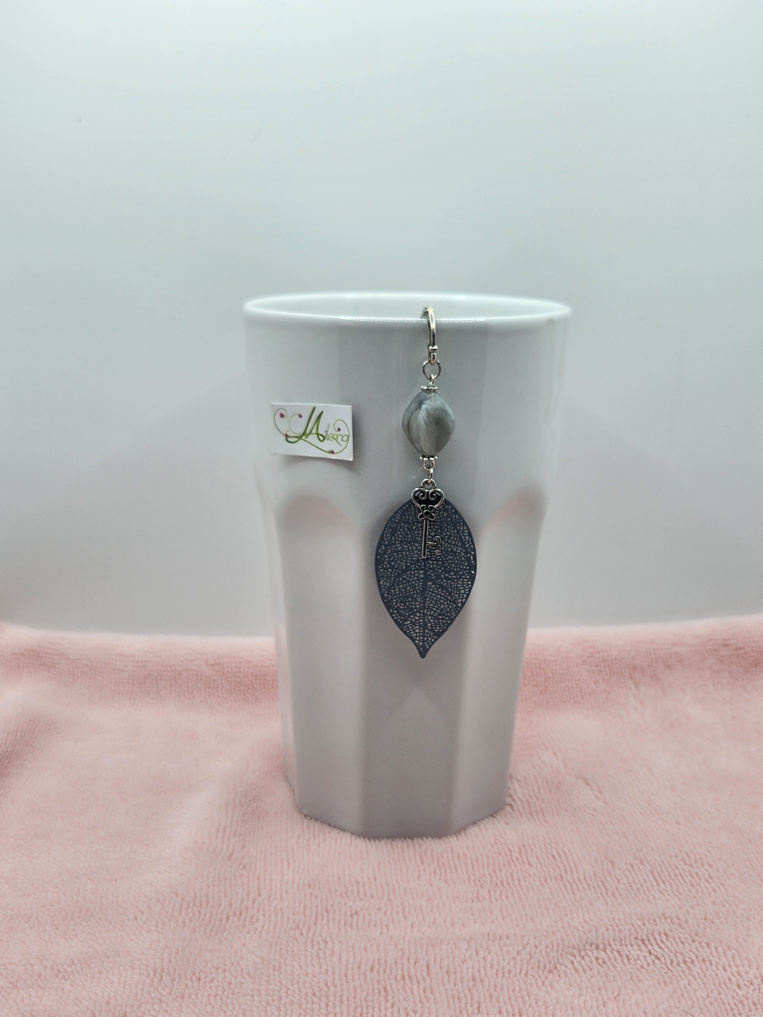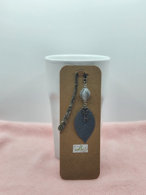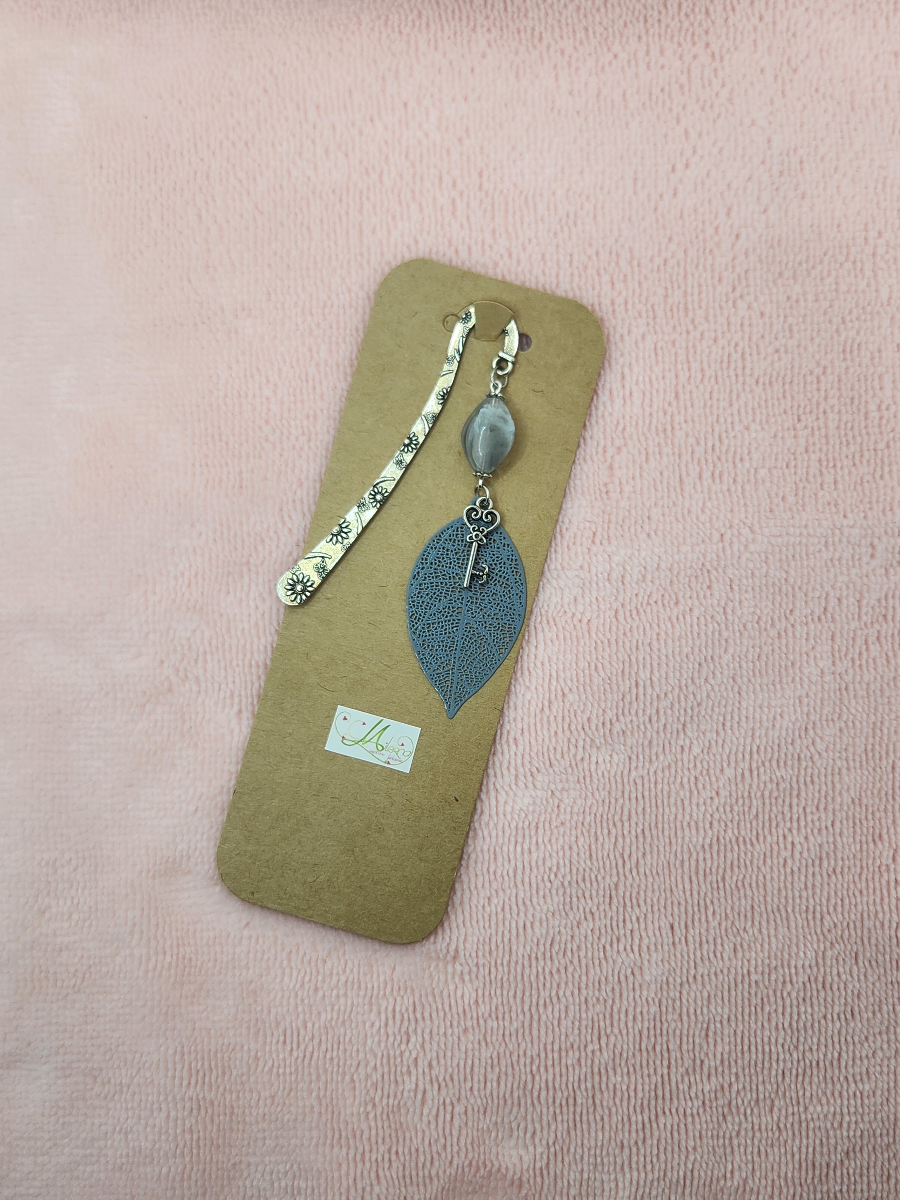 Marque-page fait main, délicat et poétique, composé d’une feuille ajourée grise, d’une clé ancienne décorative et d’une perle élégante.