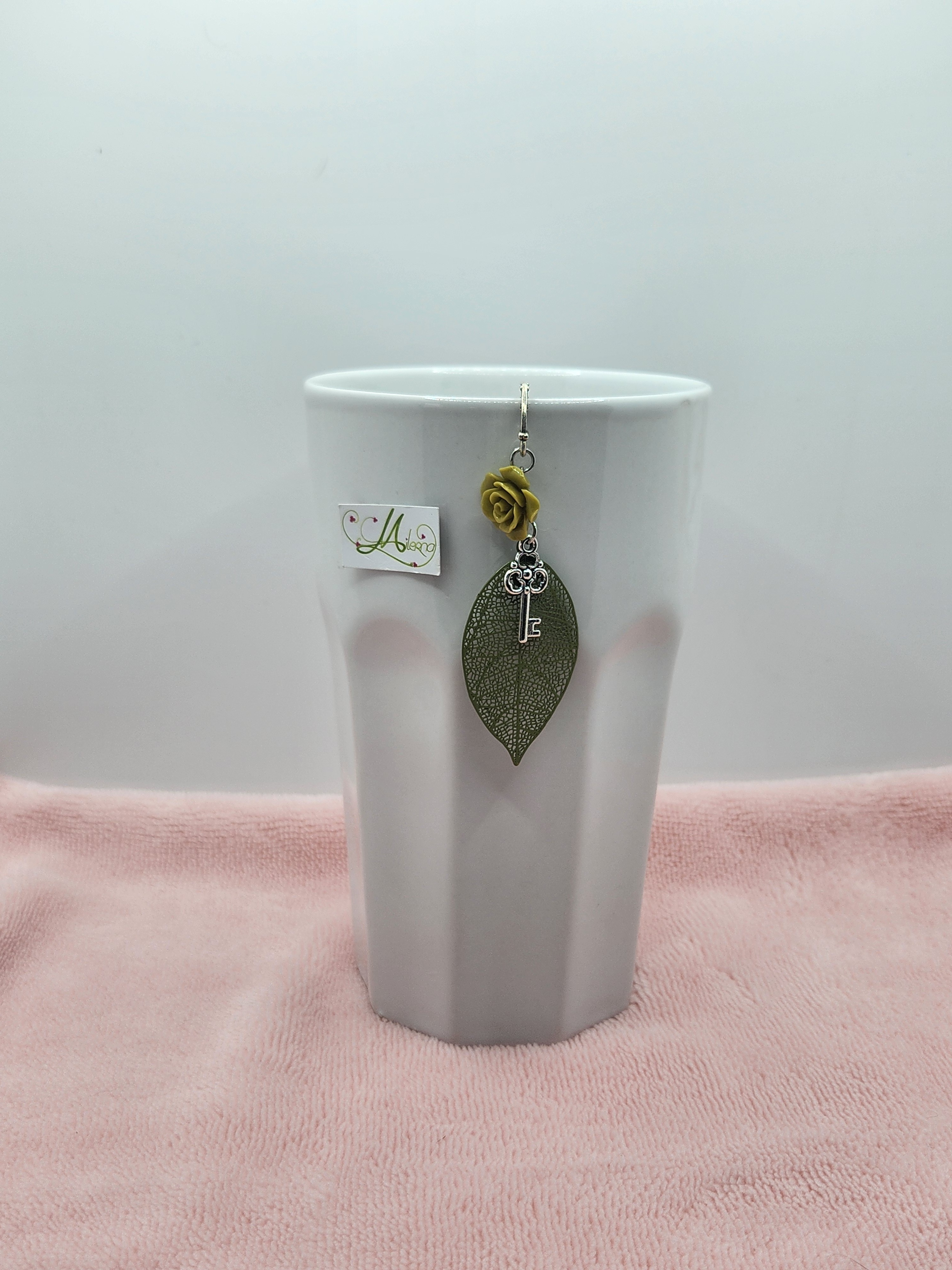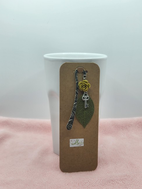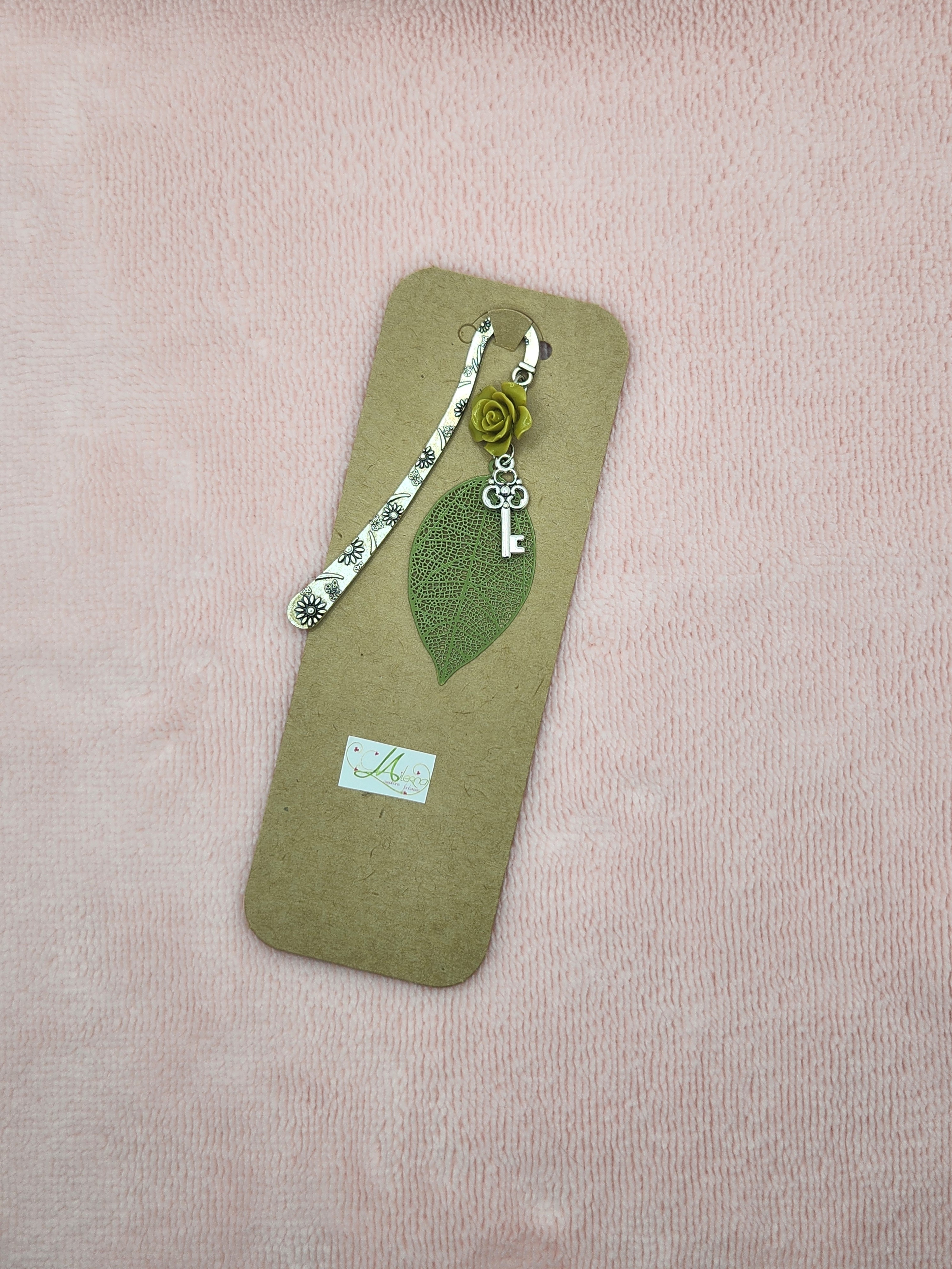 Marque-page fait main, délicat et poétique, composé d’une feuille ajourée verte olive, d’une clé ancienne décorative et d’une perle fleur élégante.