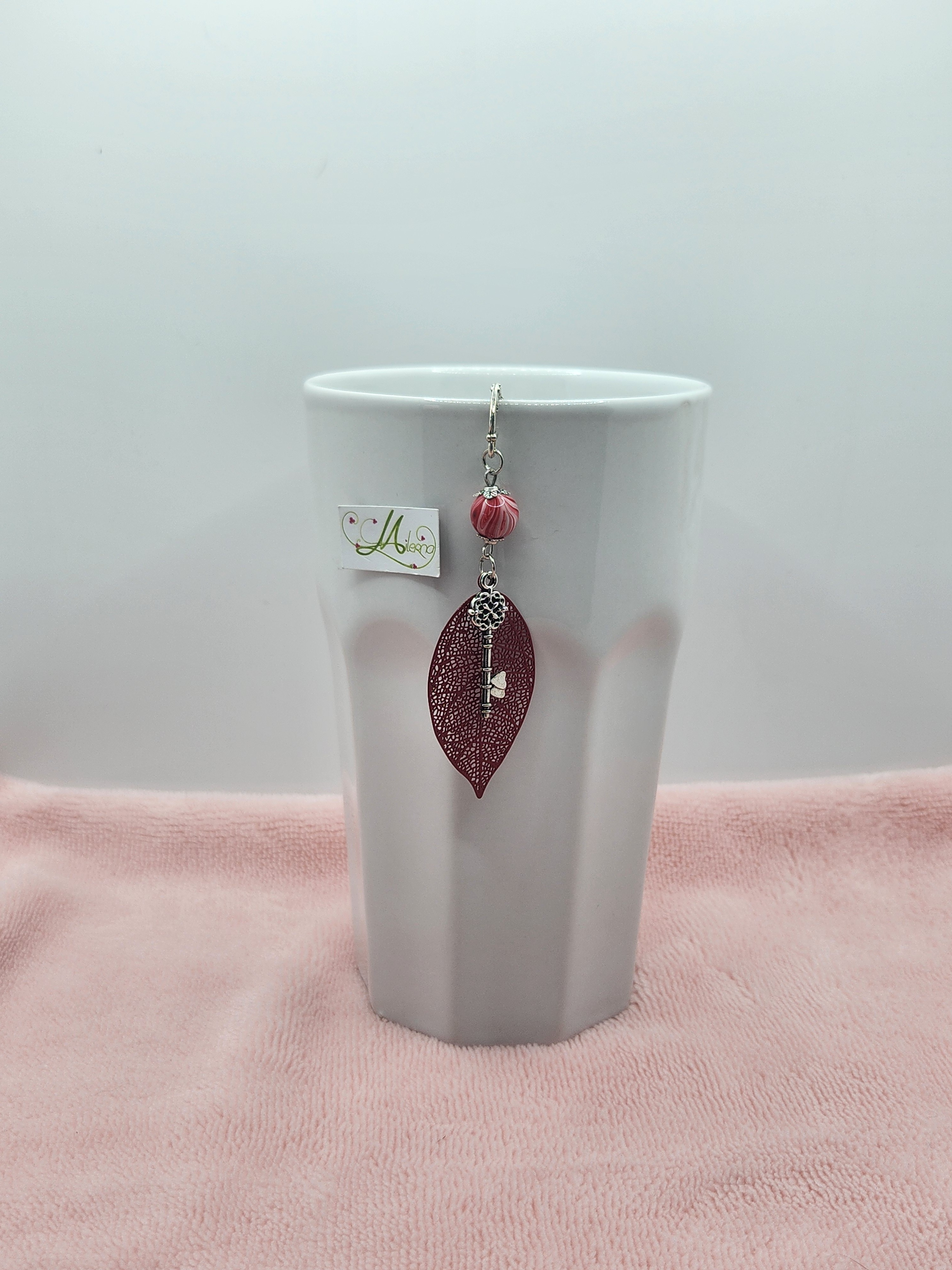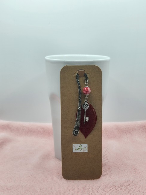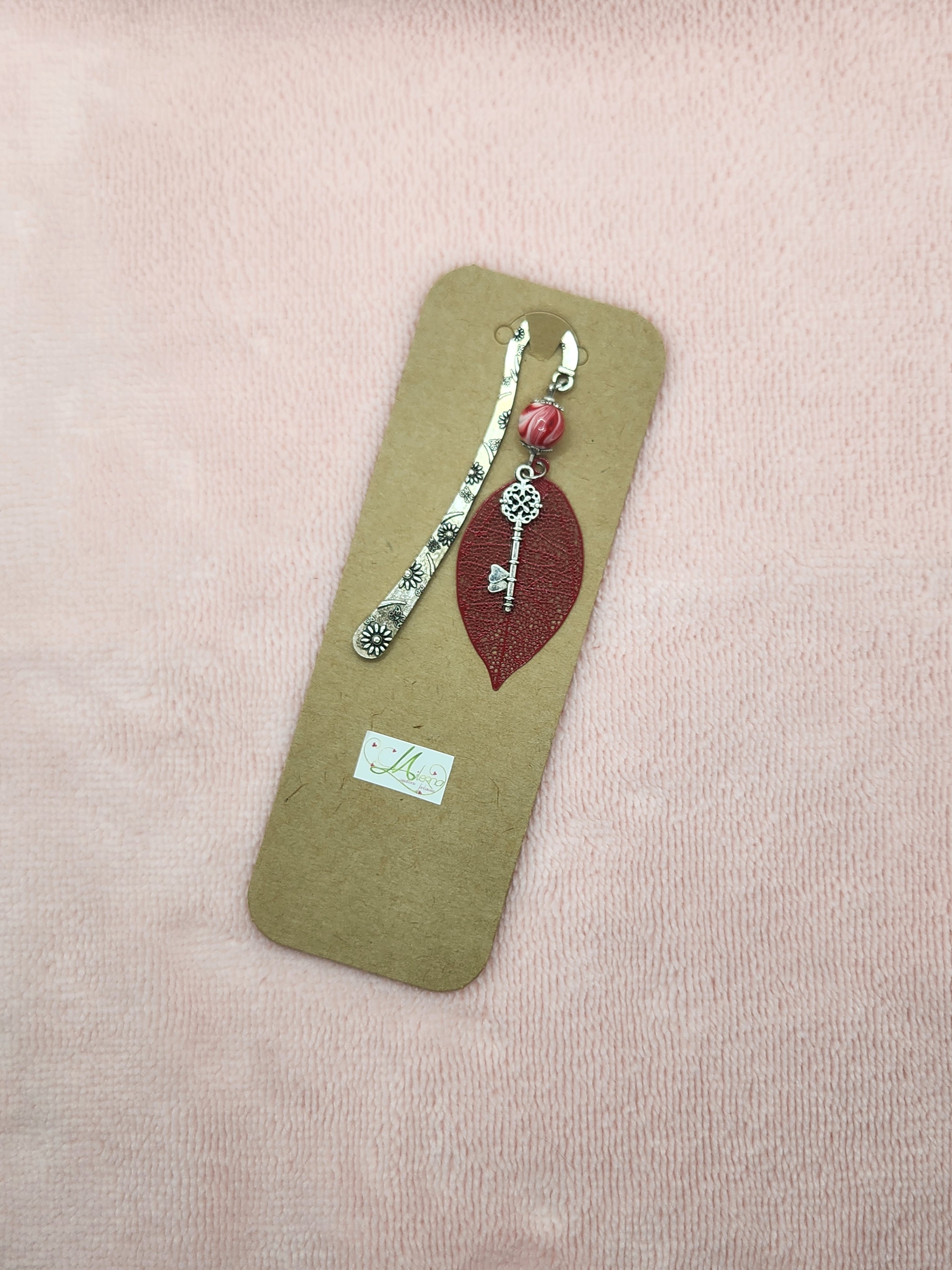 Marque-page fait main, délicat et poétique, composé d’une feuille ajourée rouge, d’une clé ancienne décorative et d'une perle élégante.