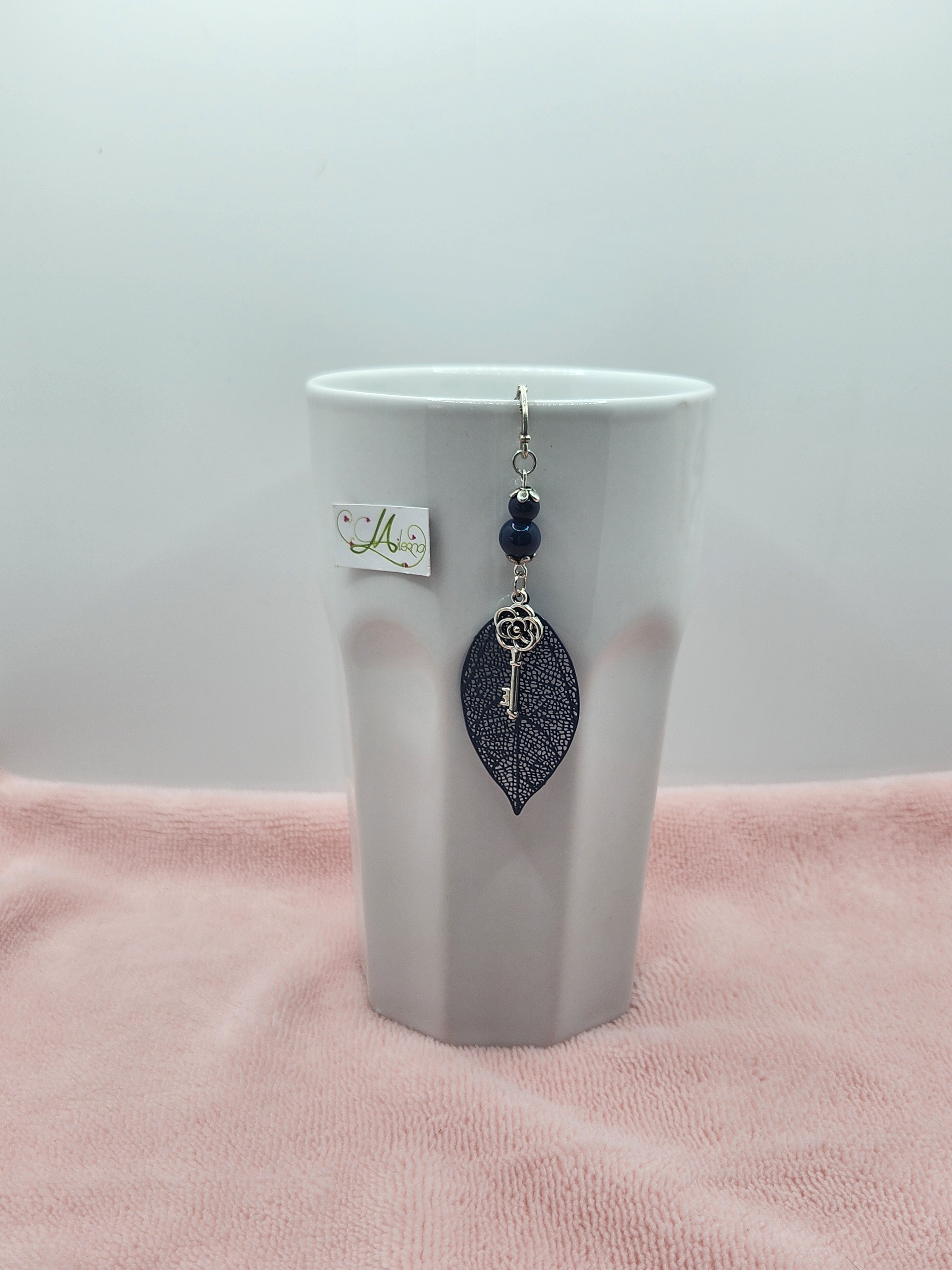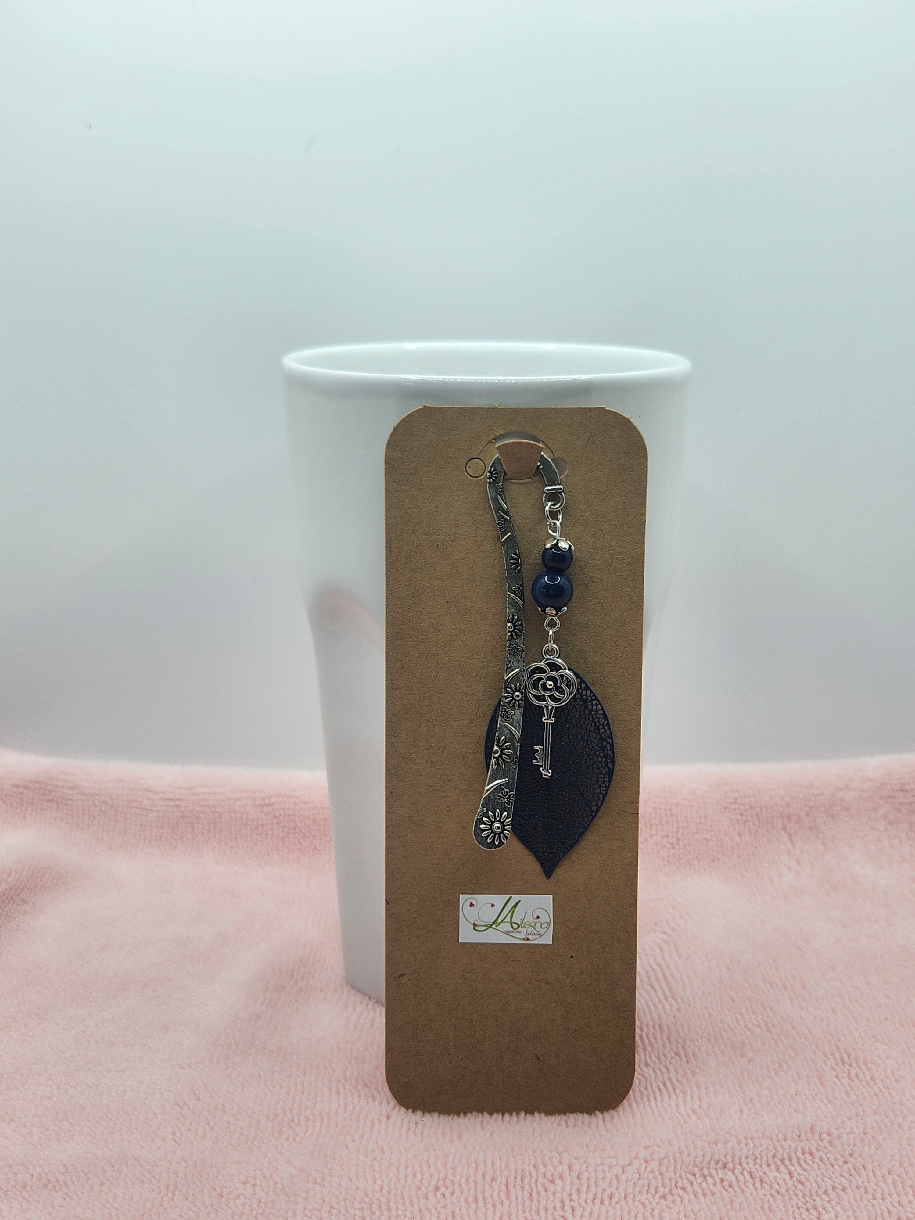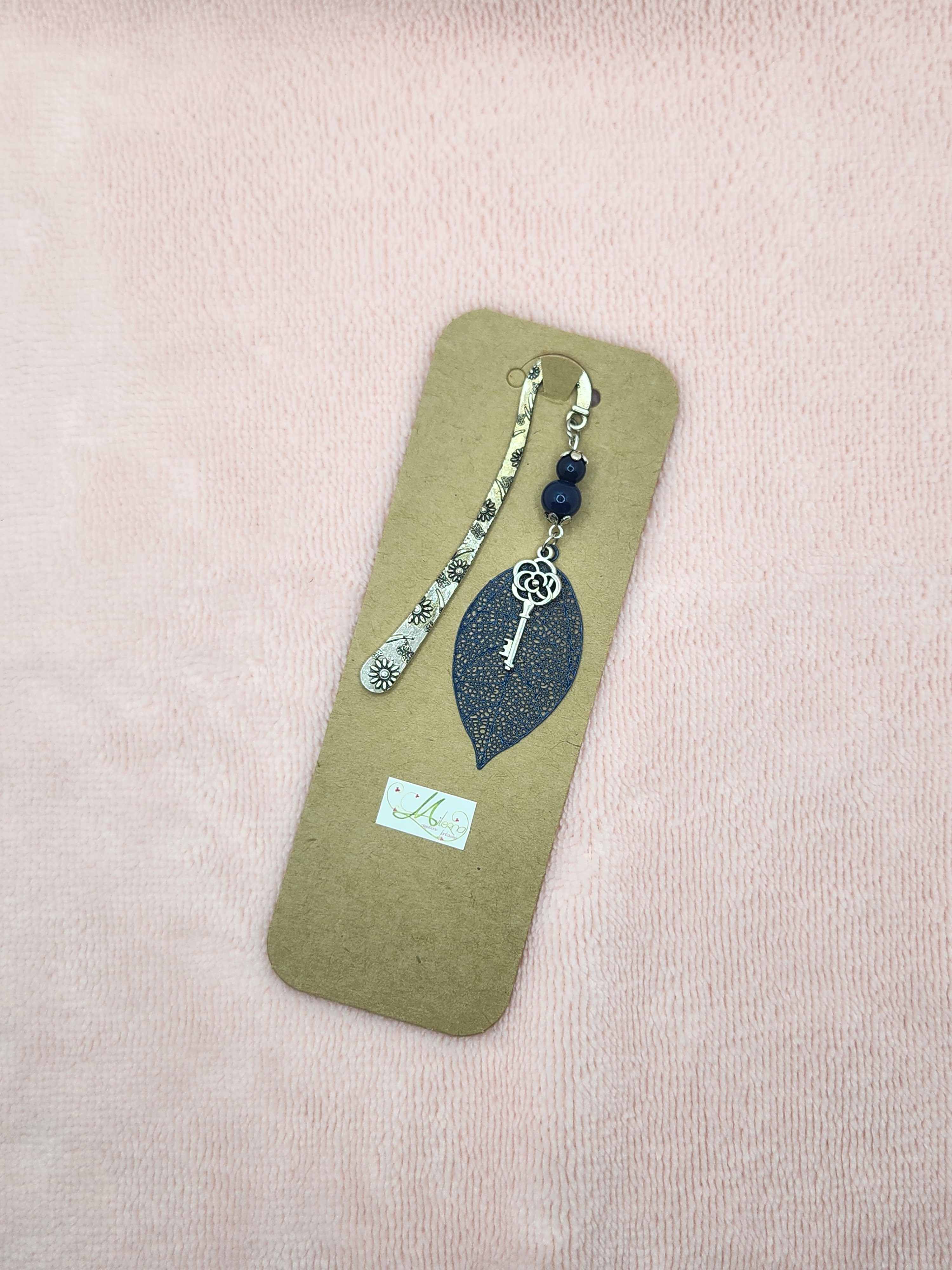 Marque-page fait main, délicat et poétique, composé d’une feuille ajourée bleue marine, d’une clé ancienne décorative et d'une perle élégante.
