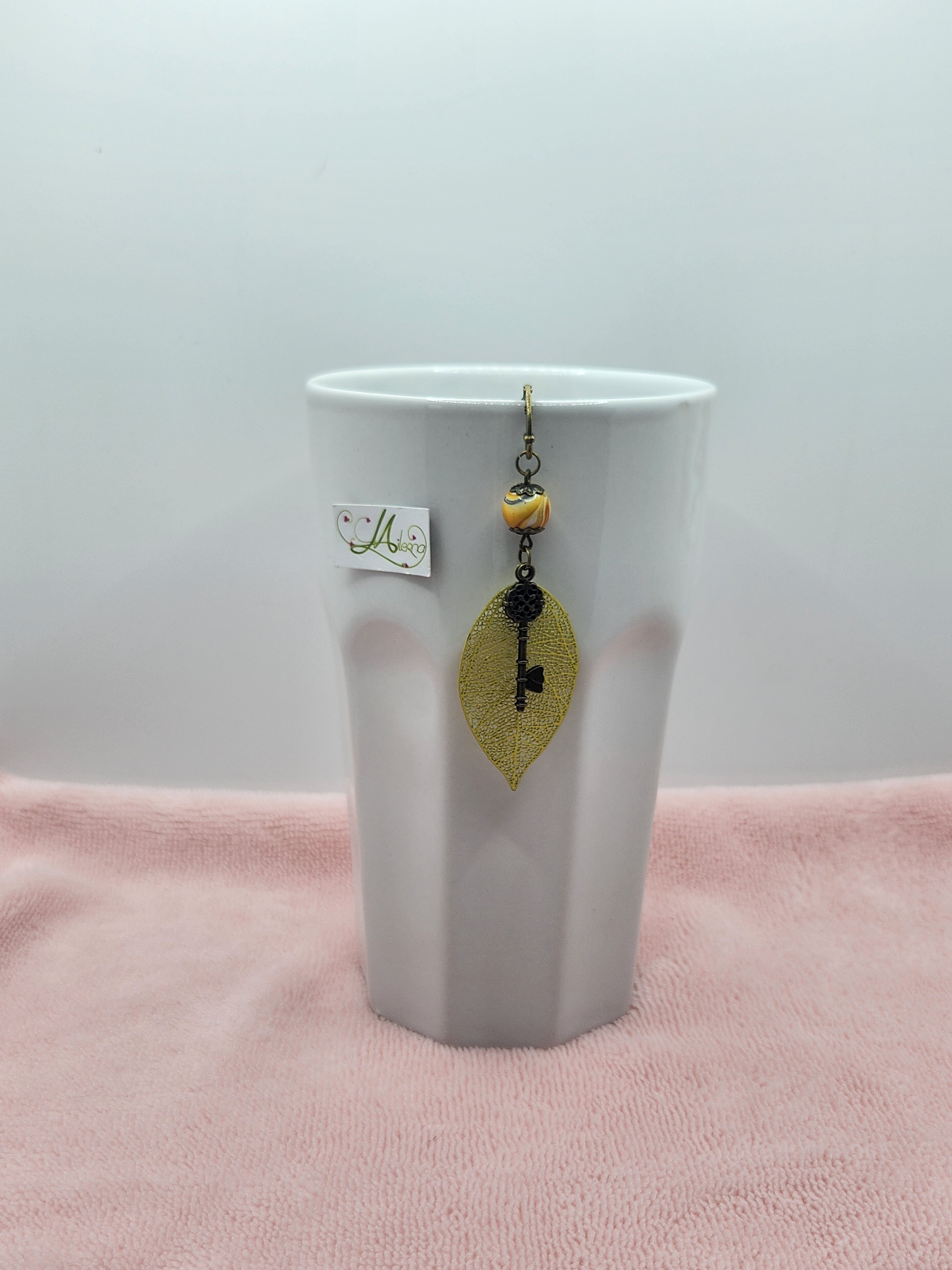 Marque-page fait main, délicat et poétique, composé d’une feuille ajourée jaune, d’une clé ancienne décorative et d’une perle élégante.