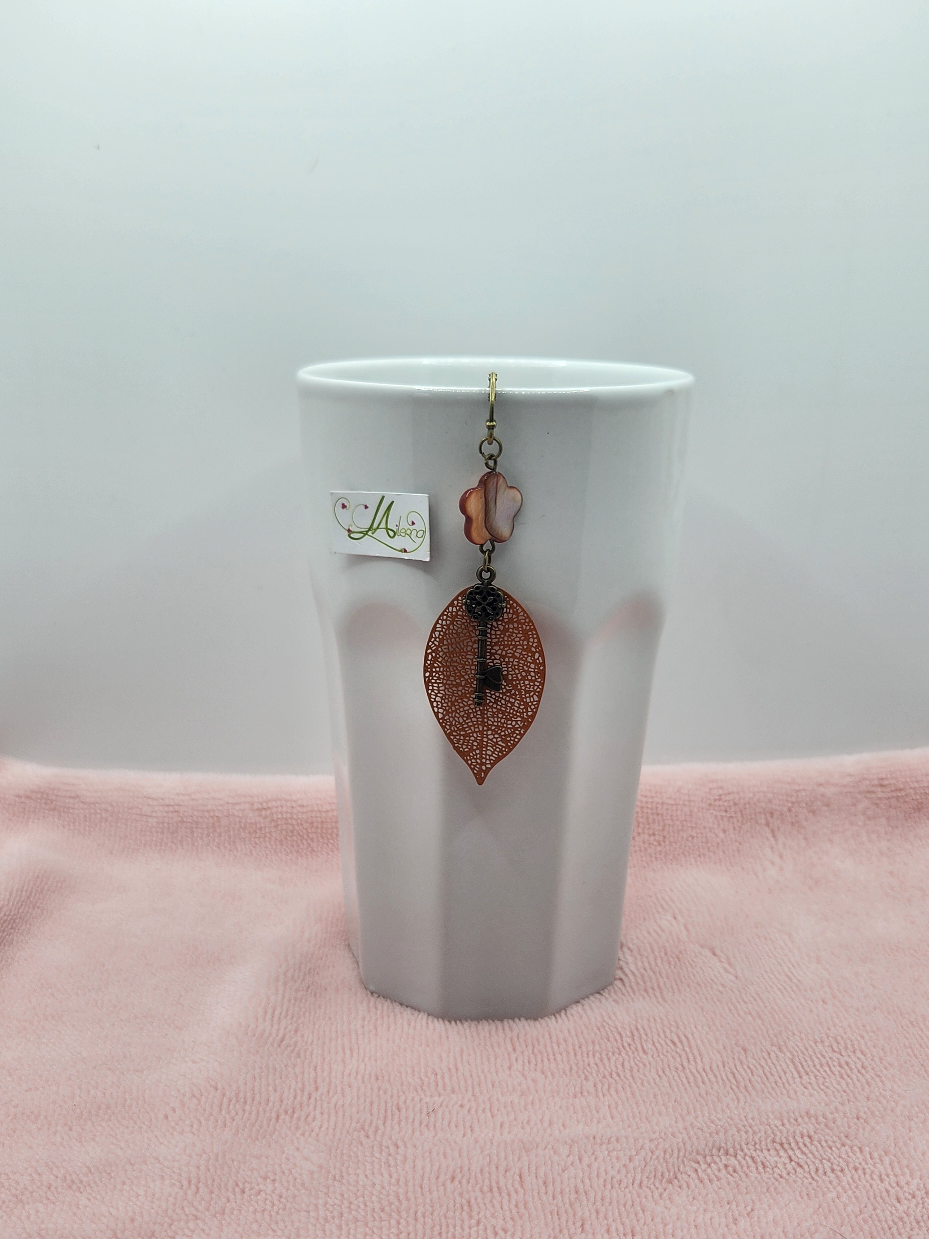 Marque-page fait main, délicat et poétique, composé d’une feuille ajourée orange, d’une clé ancienne décorative et d’une perle élégante.