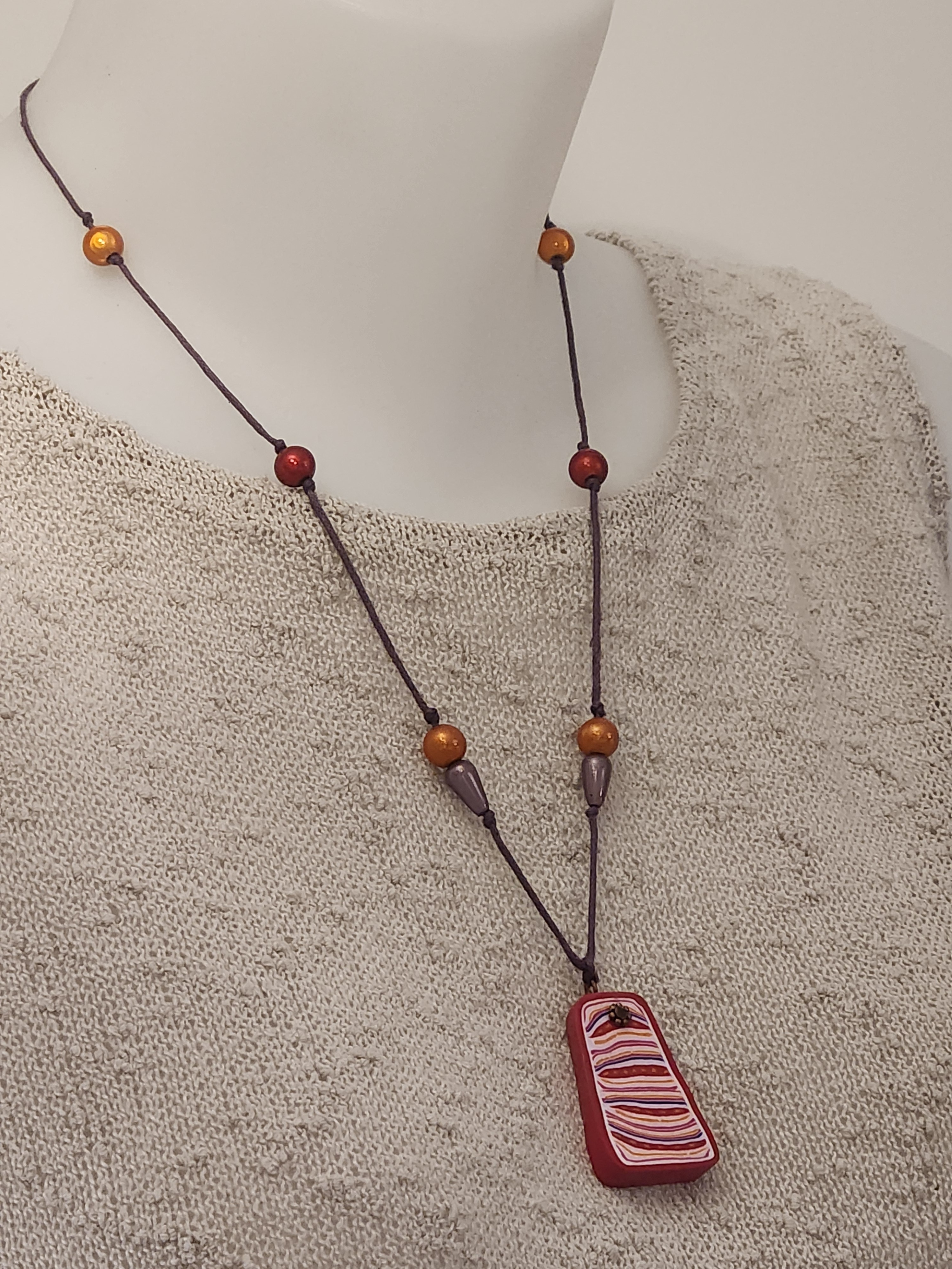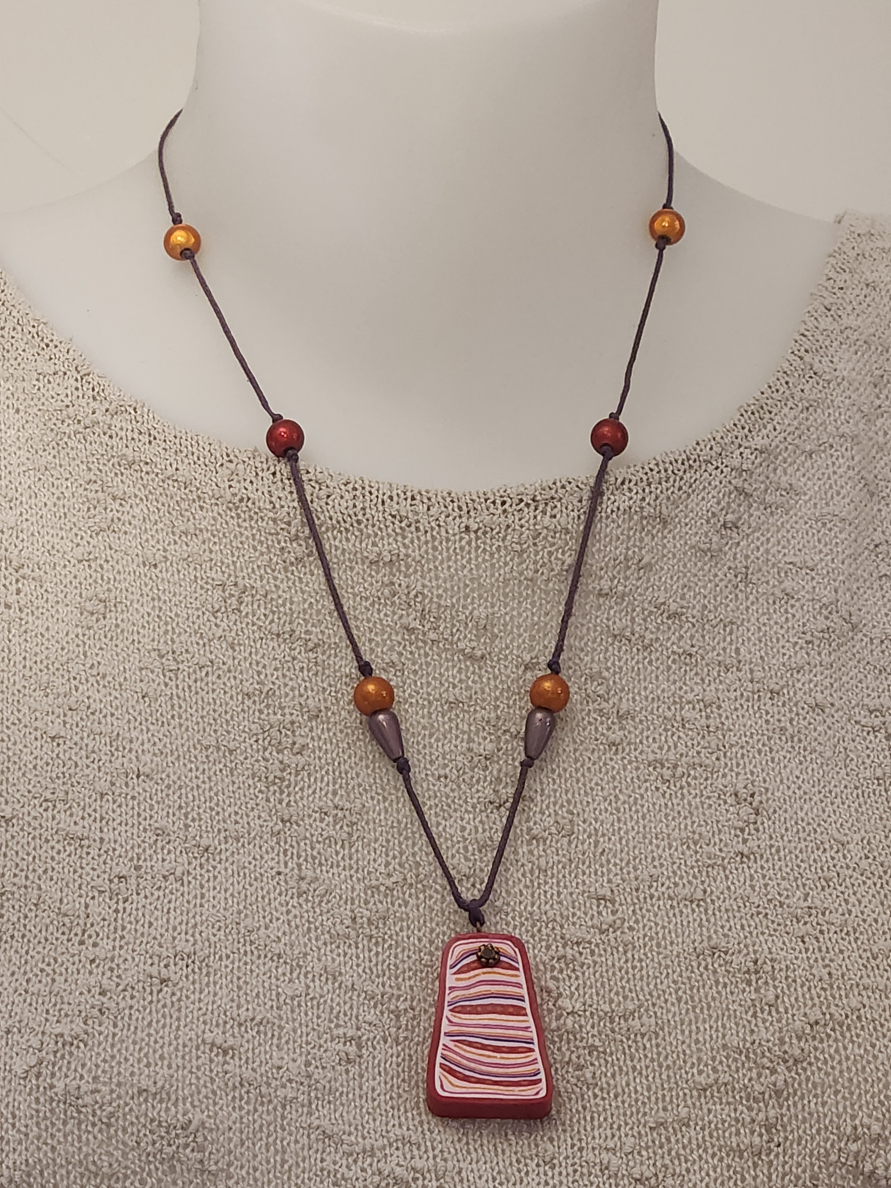 Le pendentif est en polymère rayé; ton de rouge, orange et blanc.