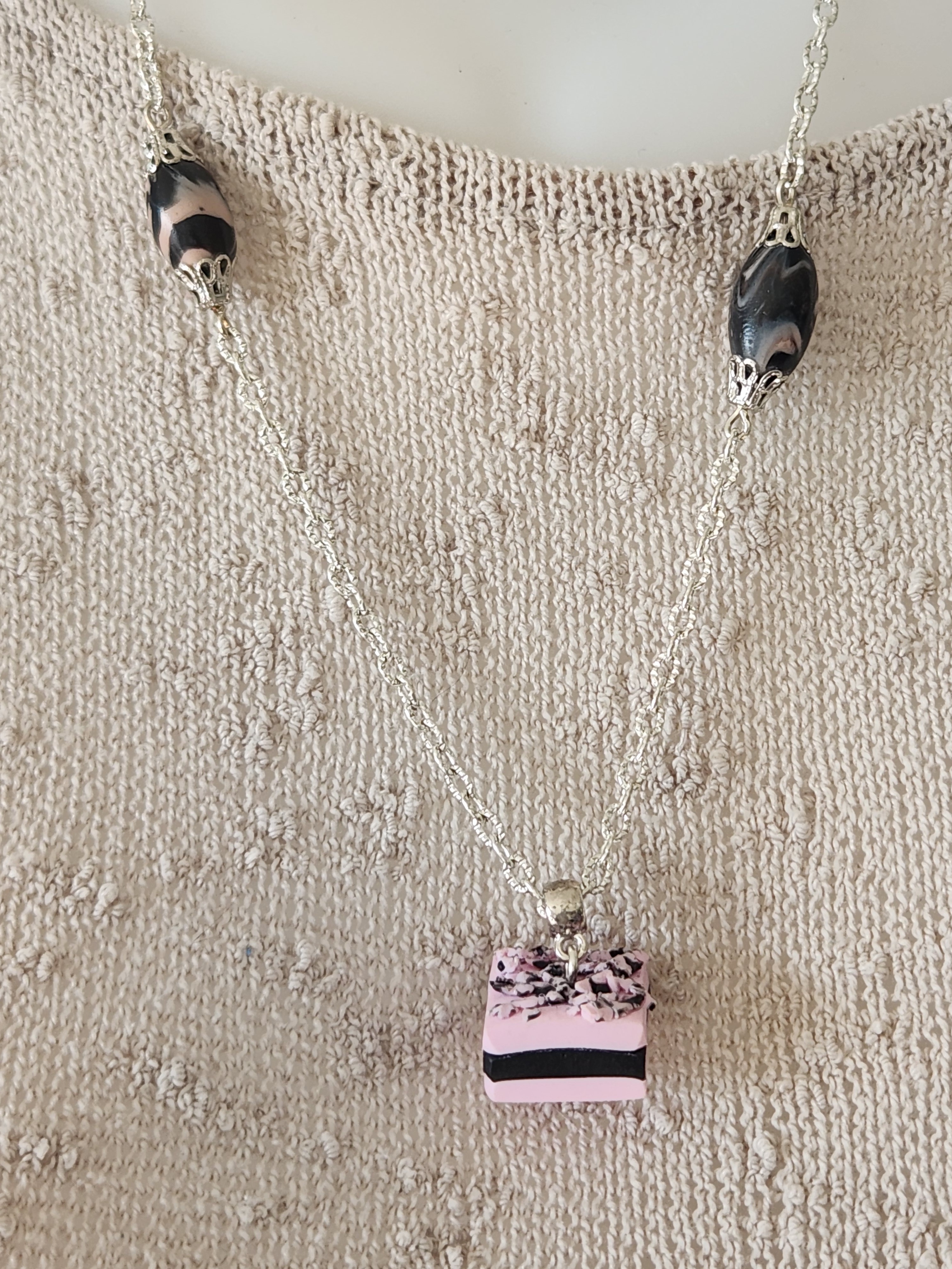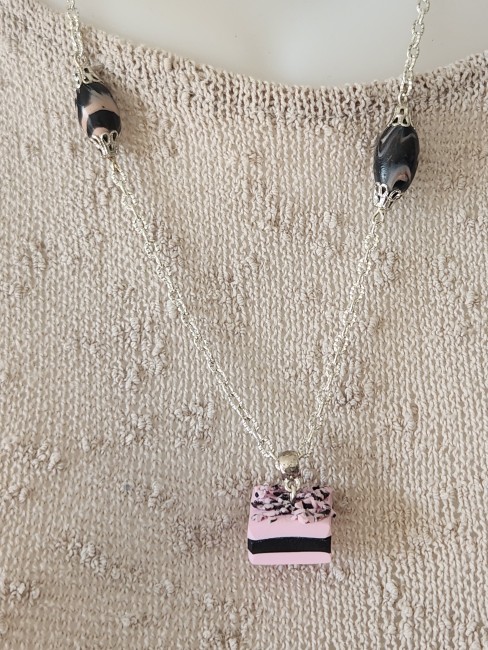 Deux perles allongées noire et rose en polymère complètent ce pendentif gourmand.