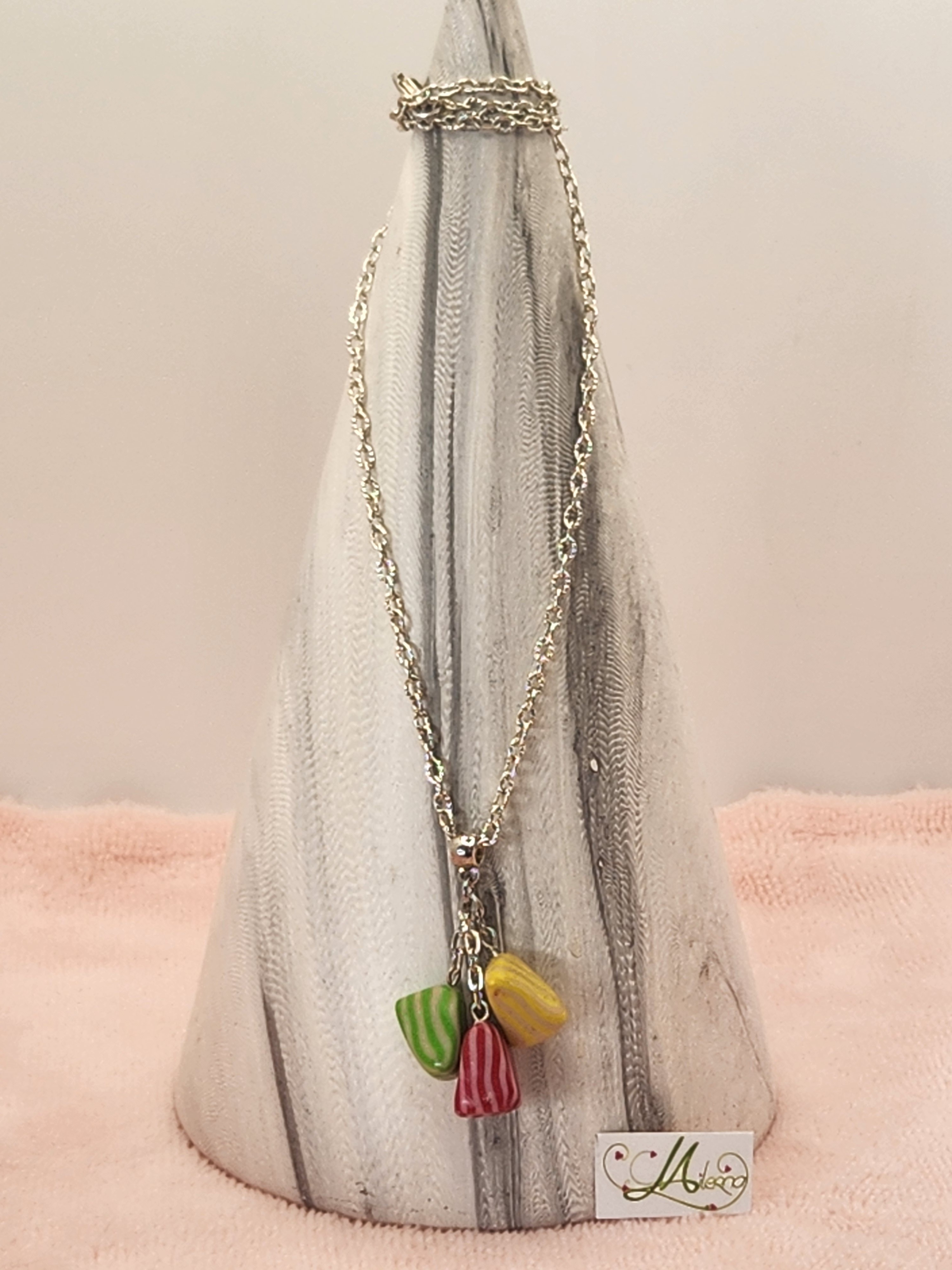 Je vous propose ces 3 Berlingots en polymère pour ce joli collier pendentif en métal argenté, chaine maillon de 0,3mm.