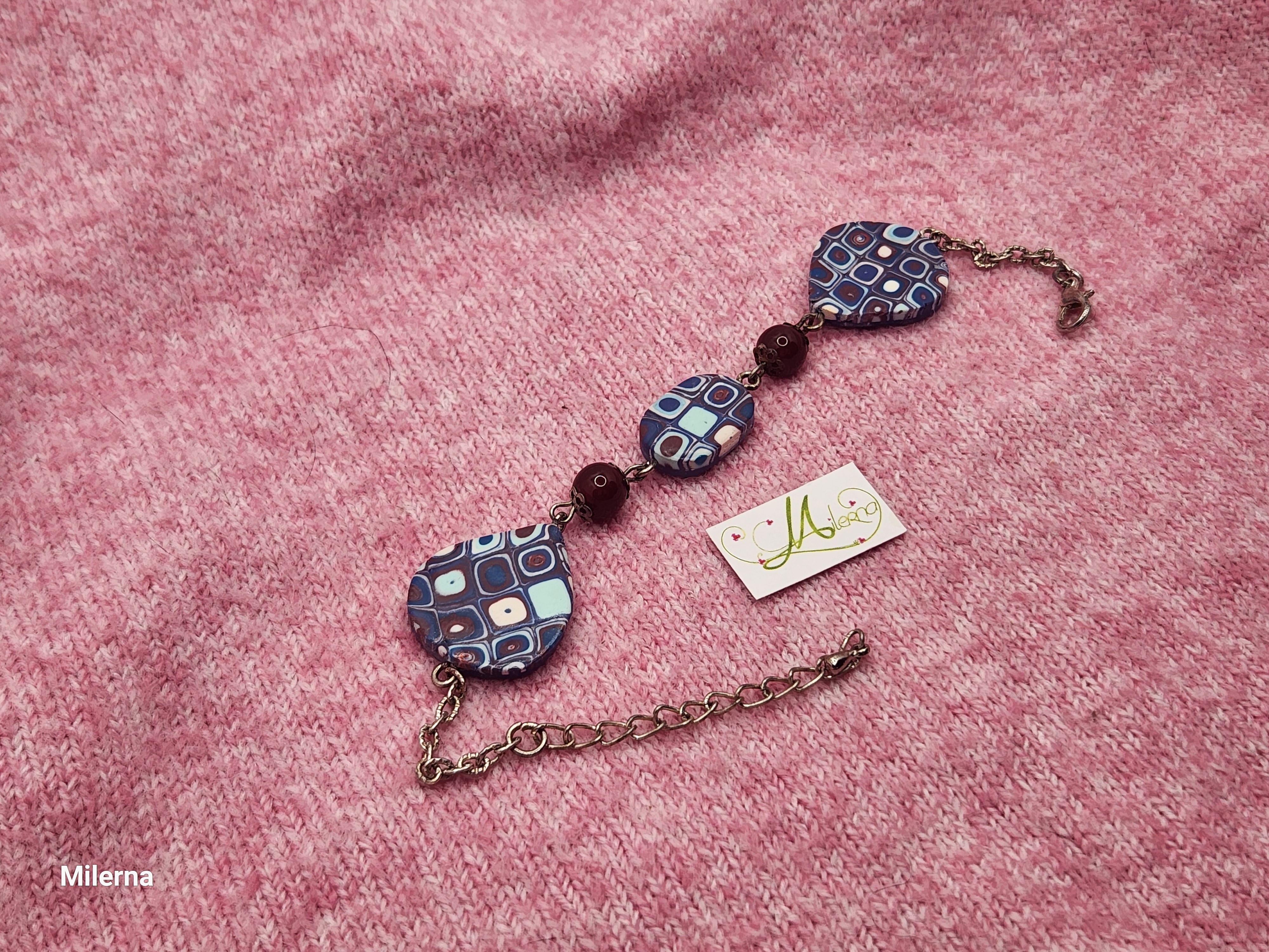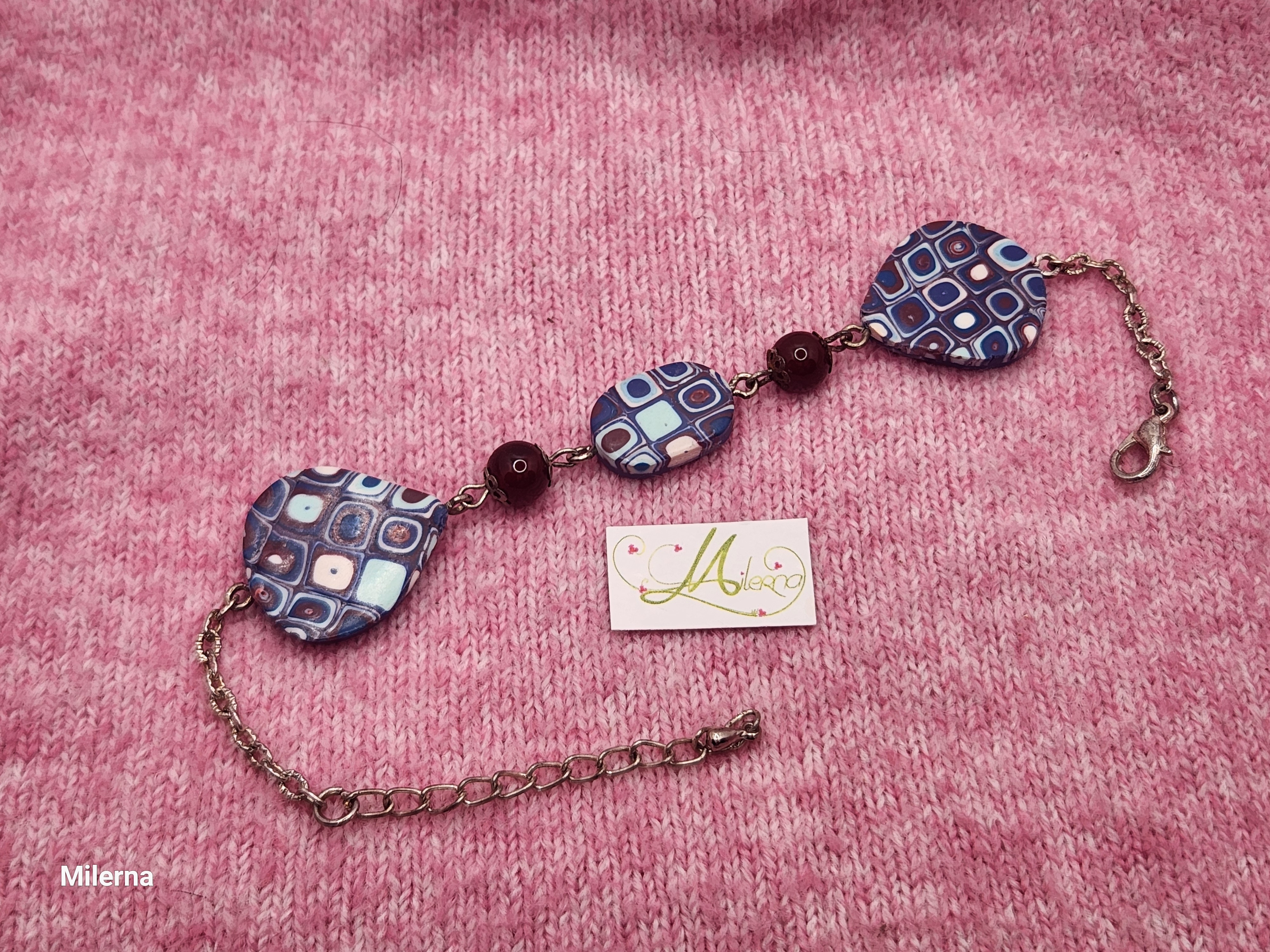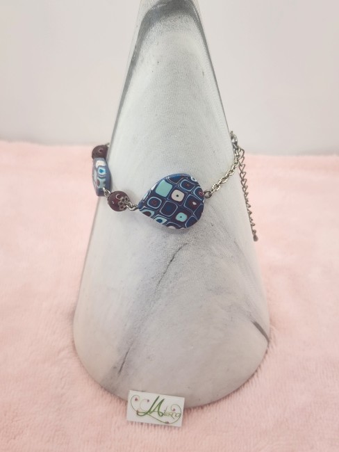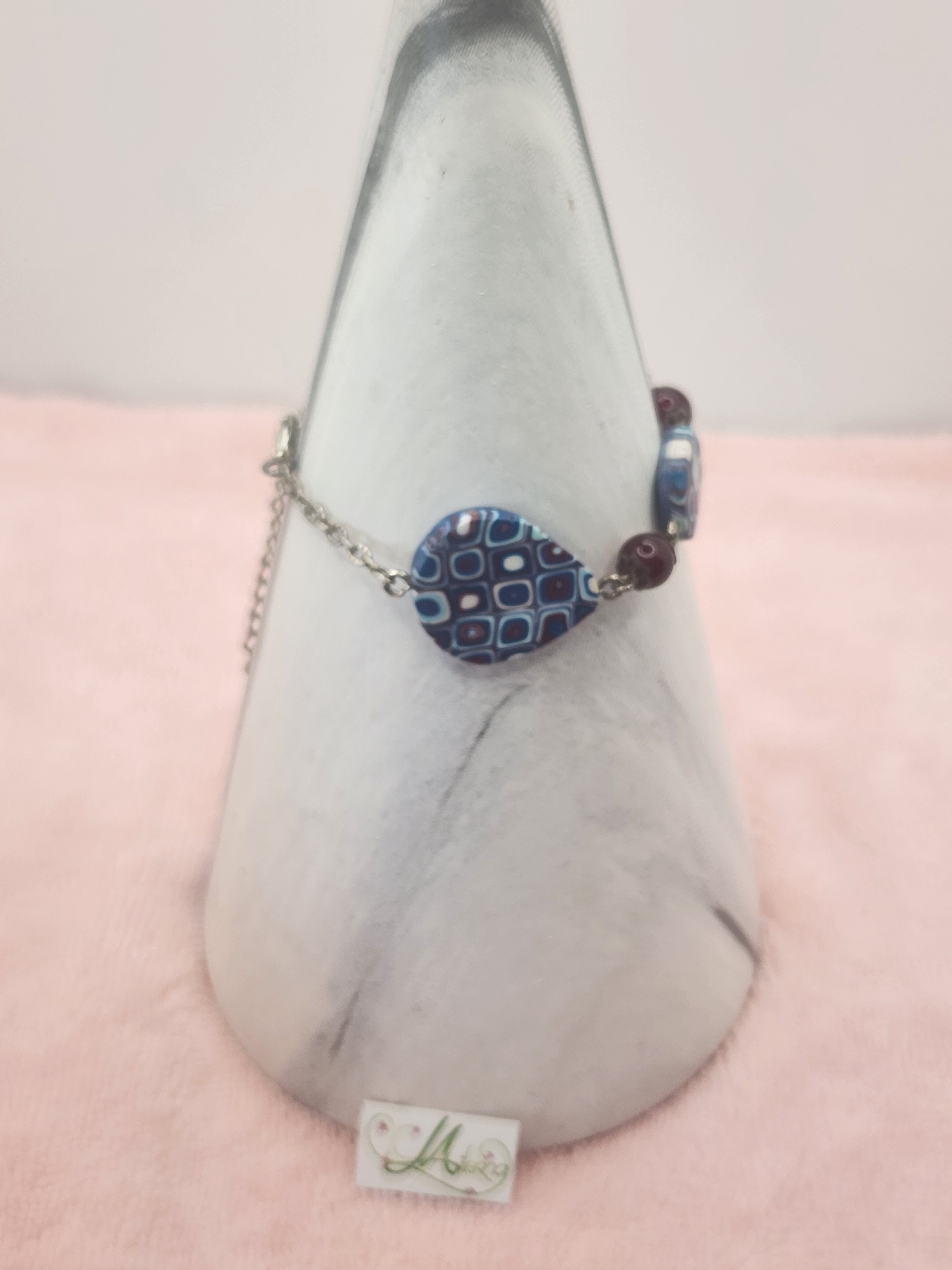 Le coloris des perles en polymère est dans les tons de bleu et bordeaux.