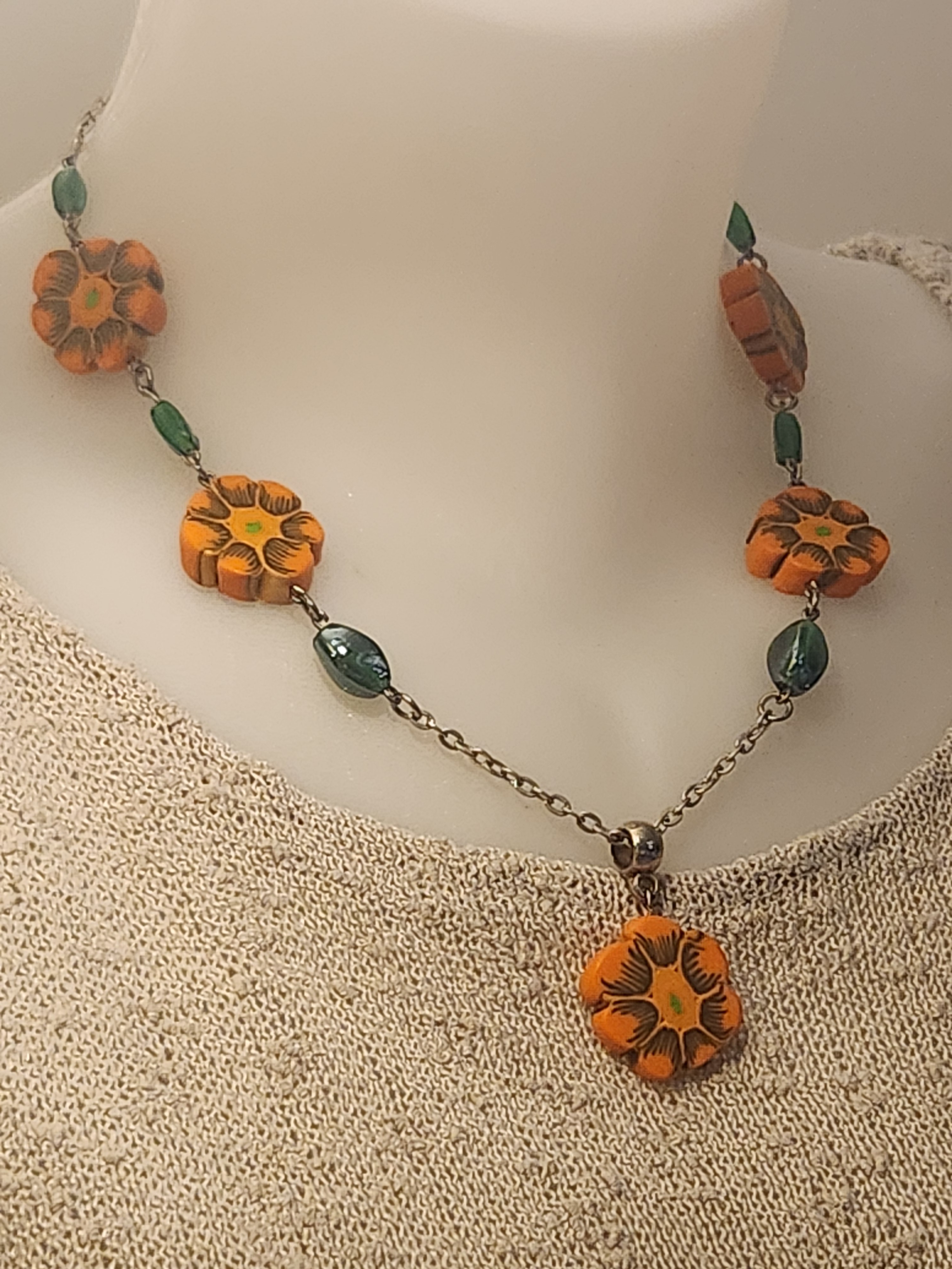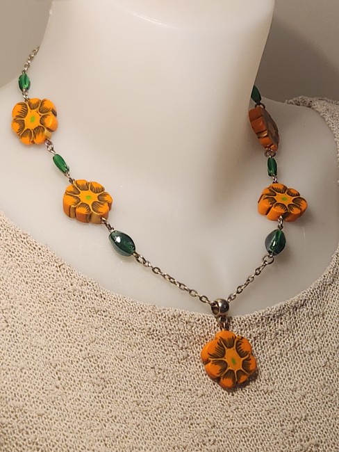 Je vous propose ce collier 5 fleurs en polymère, monté sur chaîne argentée, les fleurs sont orange et marron avec leur centre vert.