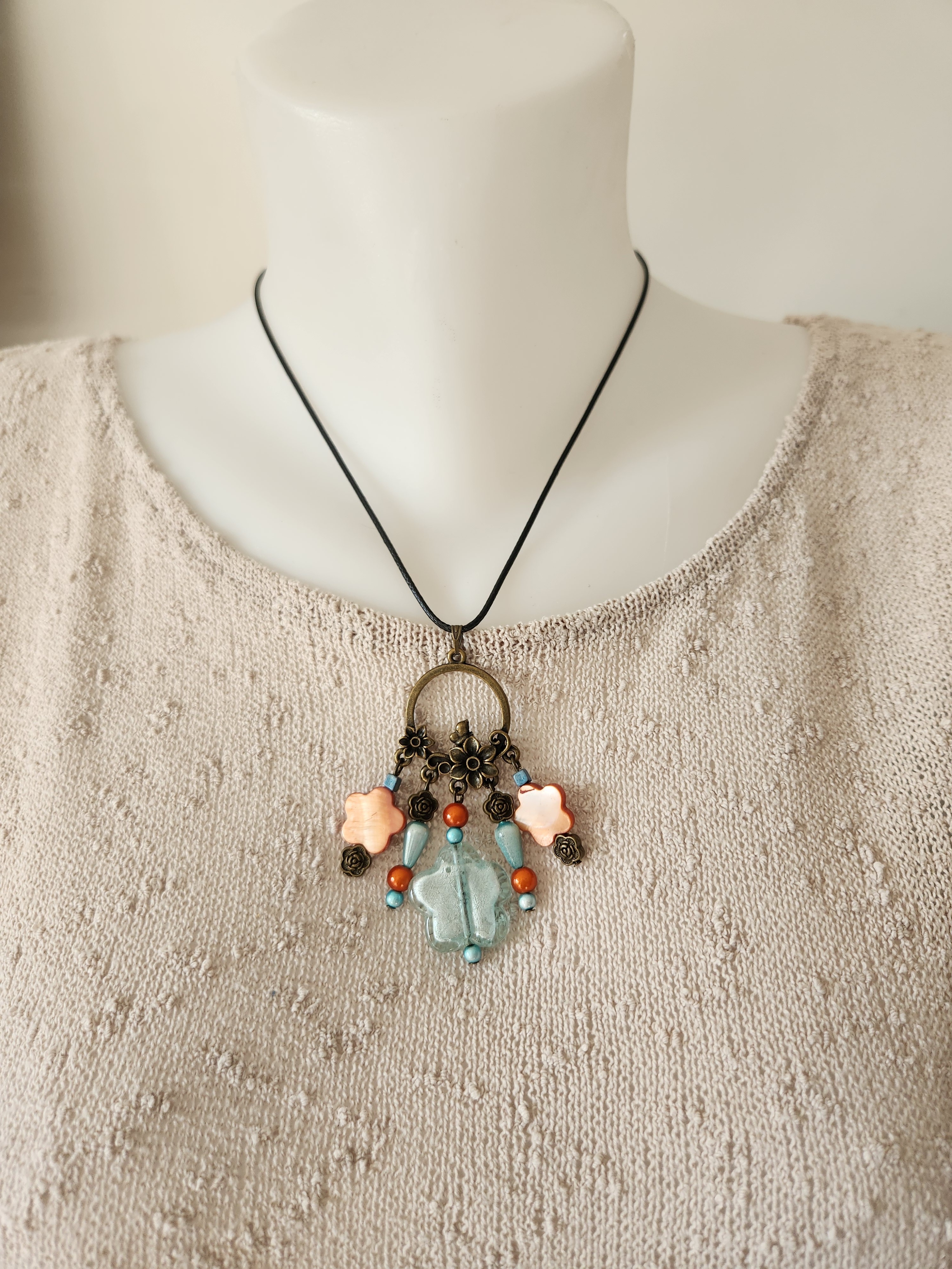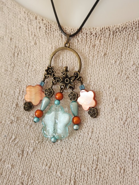 Le tout sur un joli pendentif colori bronze, et un tour de cou en coton ciré noir.