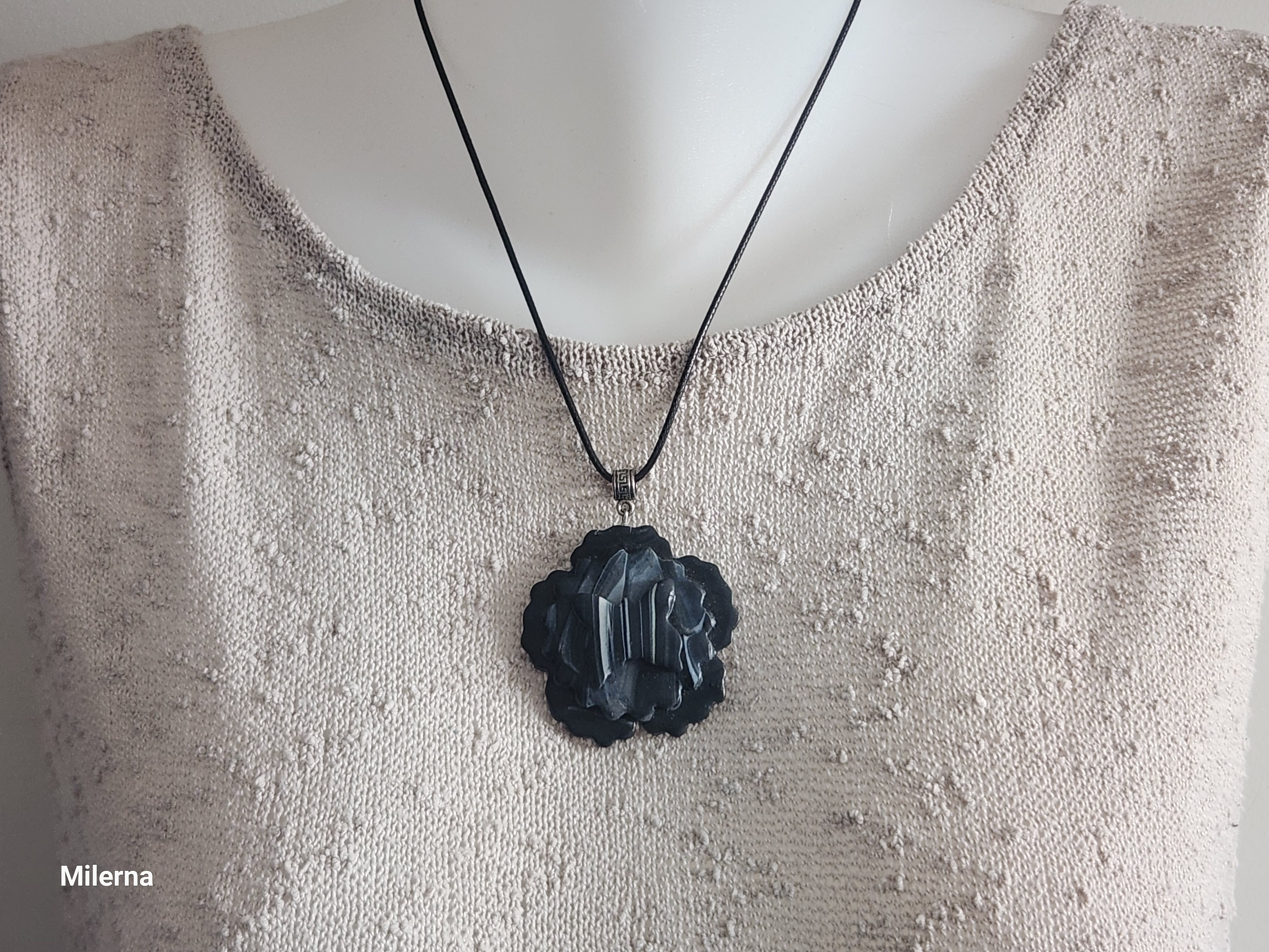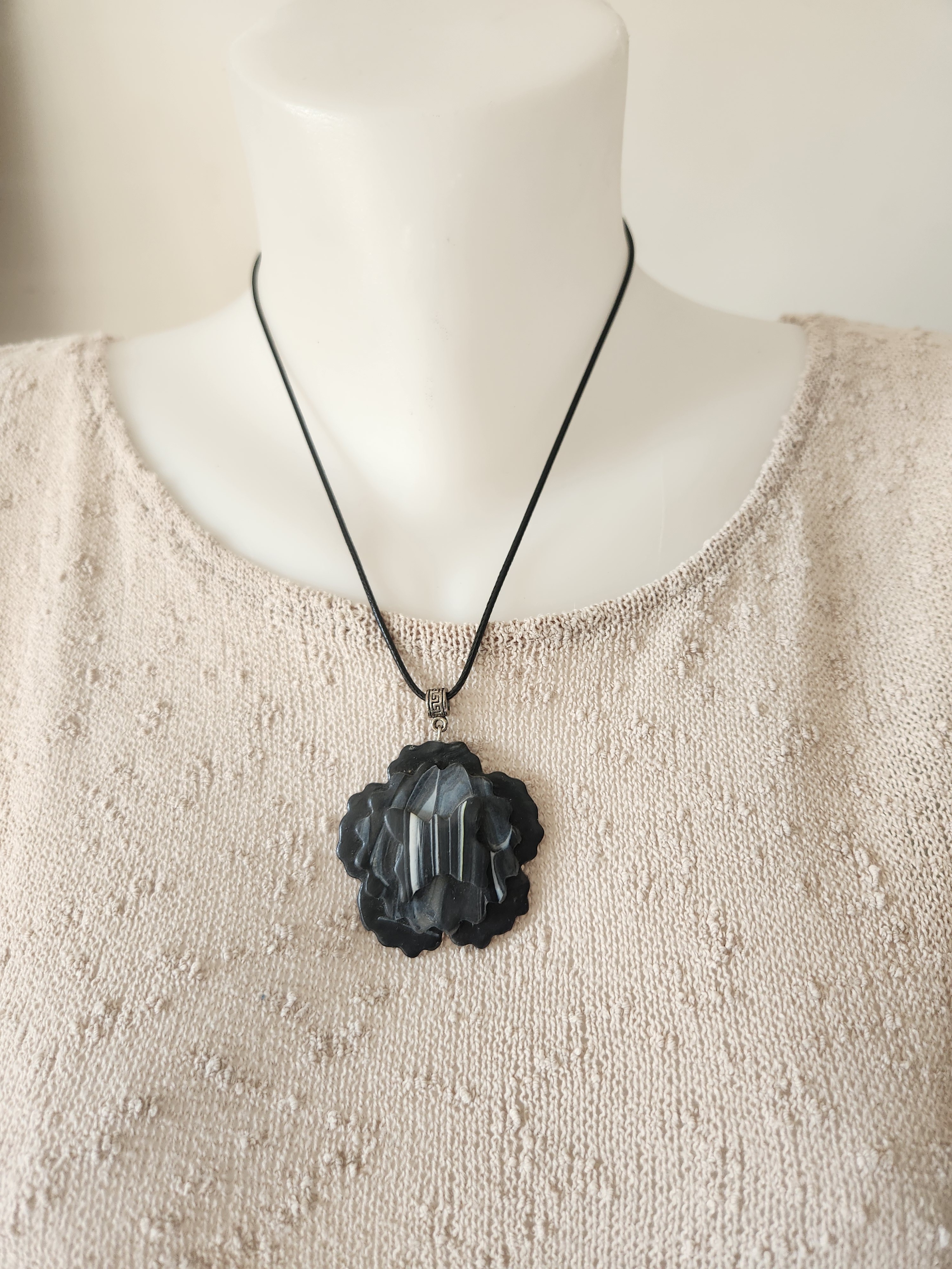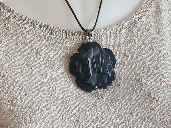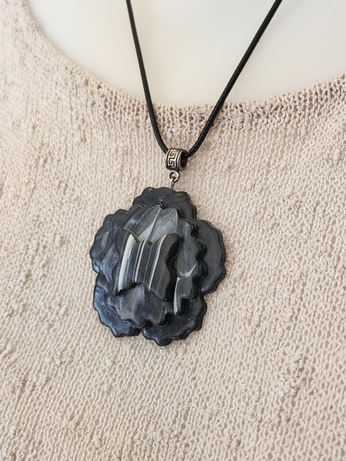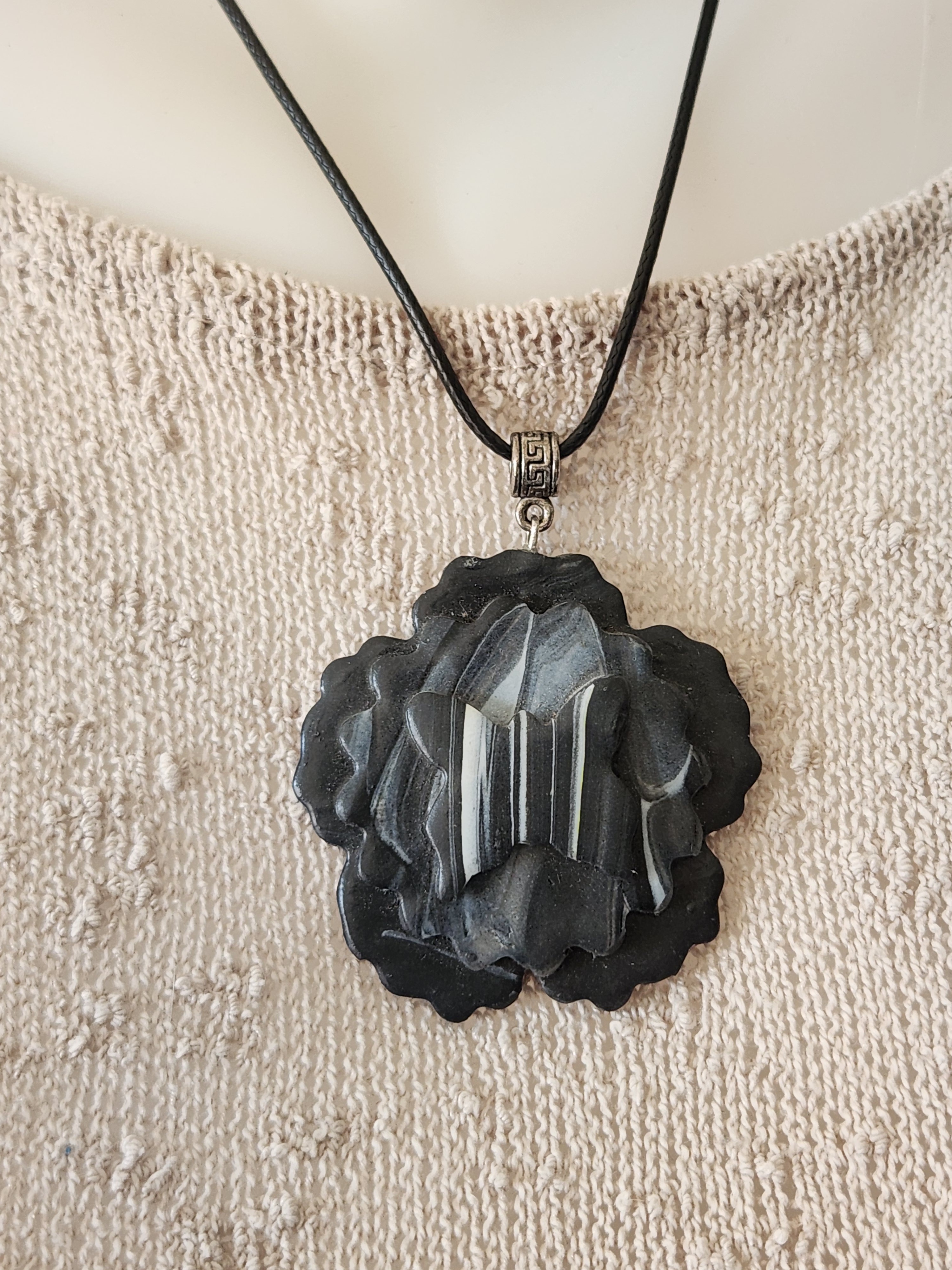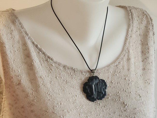 Je vous propose ce pendentif en polymère marbrée, grosse fleur noire, moyenne marbrée, au centre un papillon.
