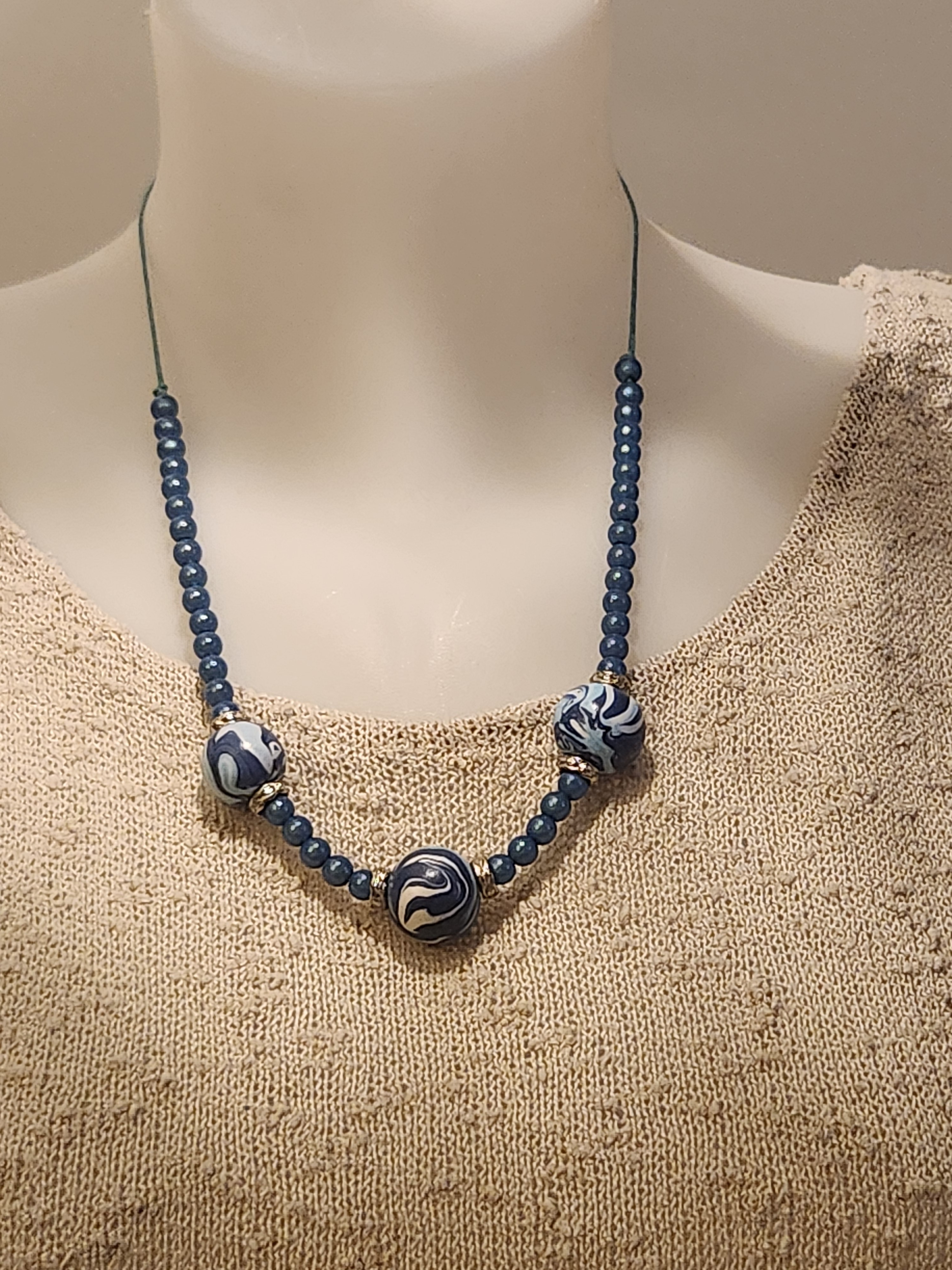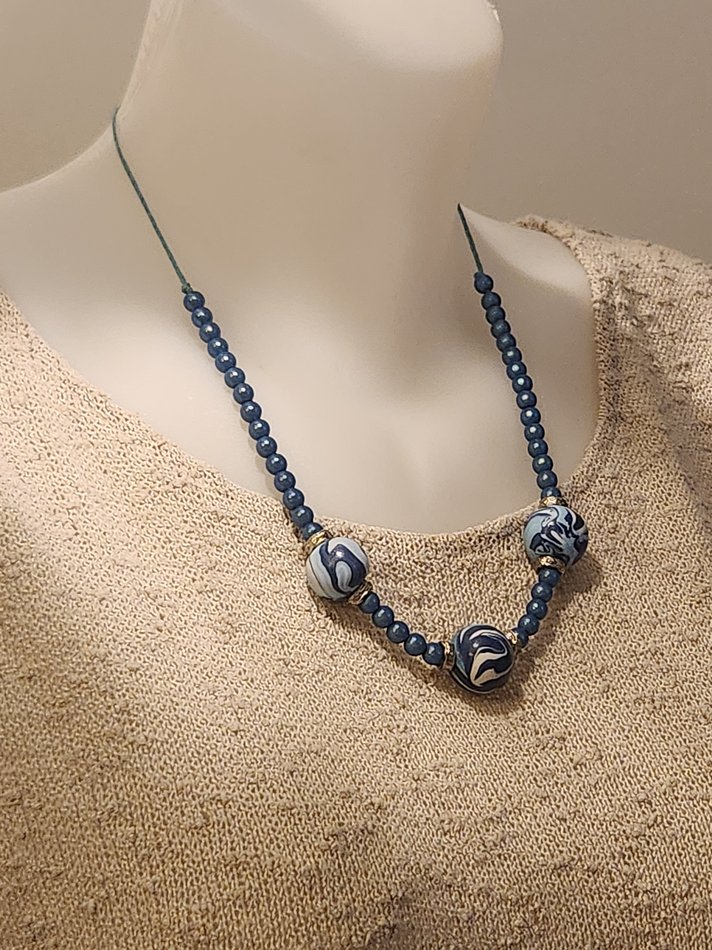 Je vous propose ce collier 3 perles de polymère, marbré de bleu, perles magiques bleues,