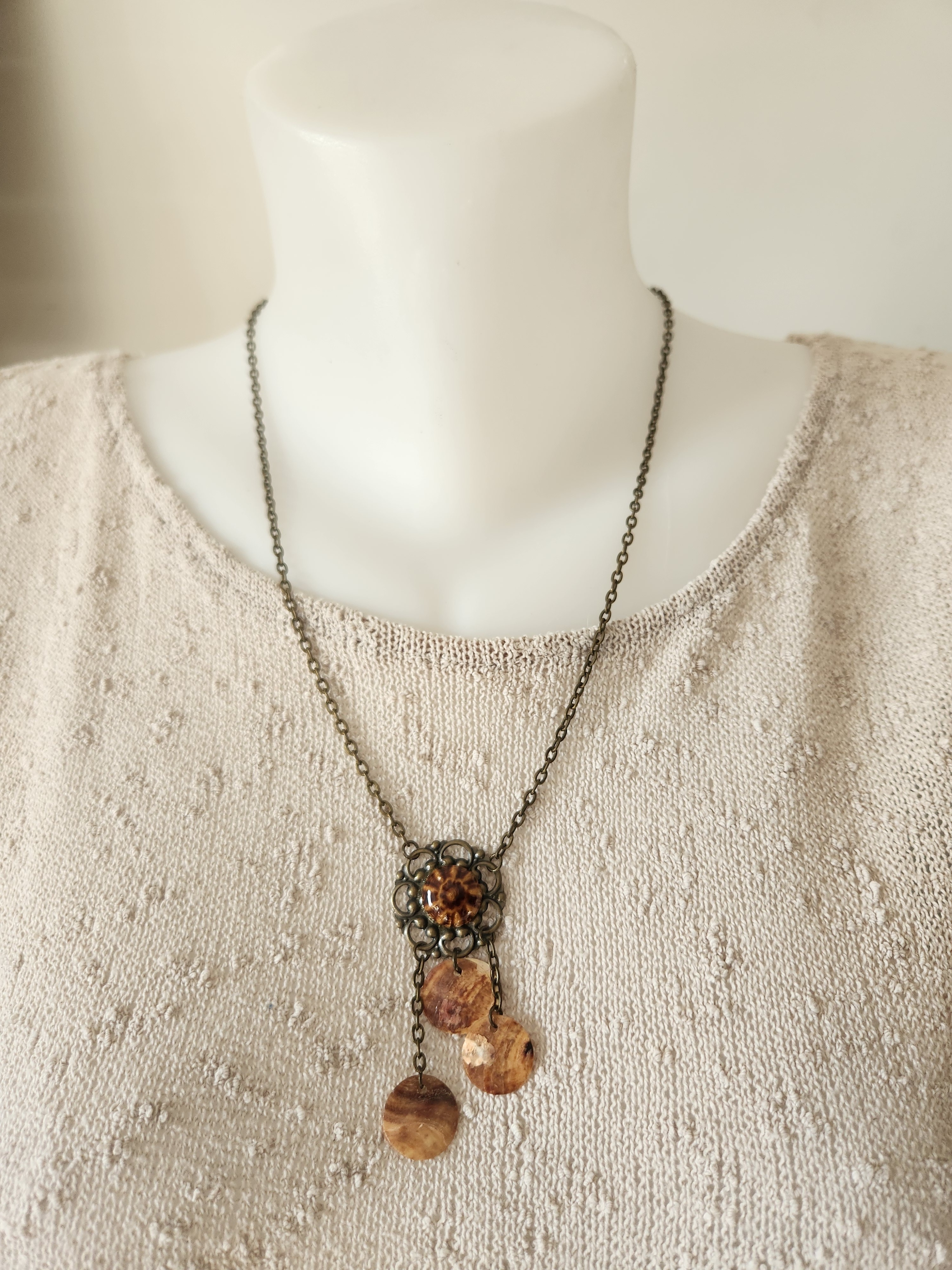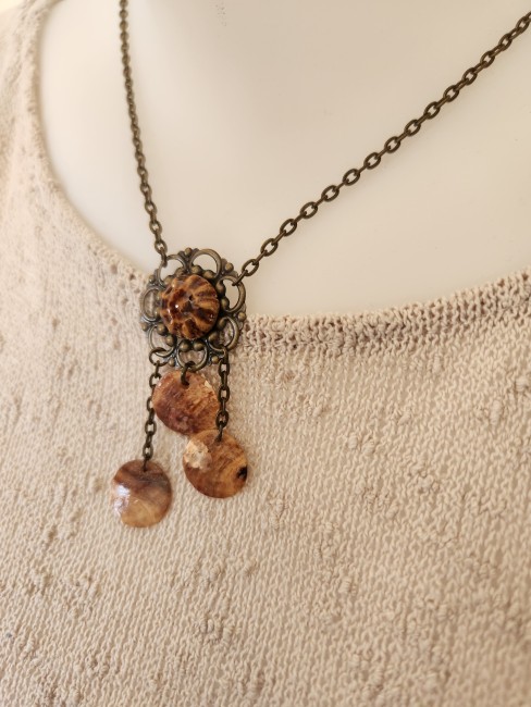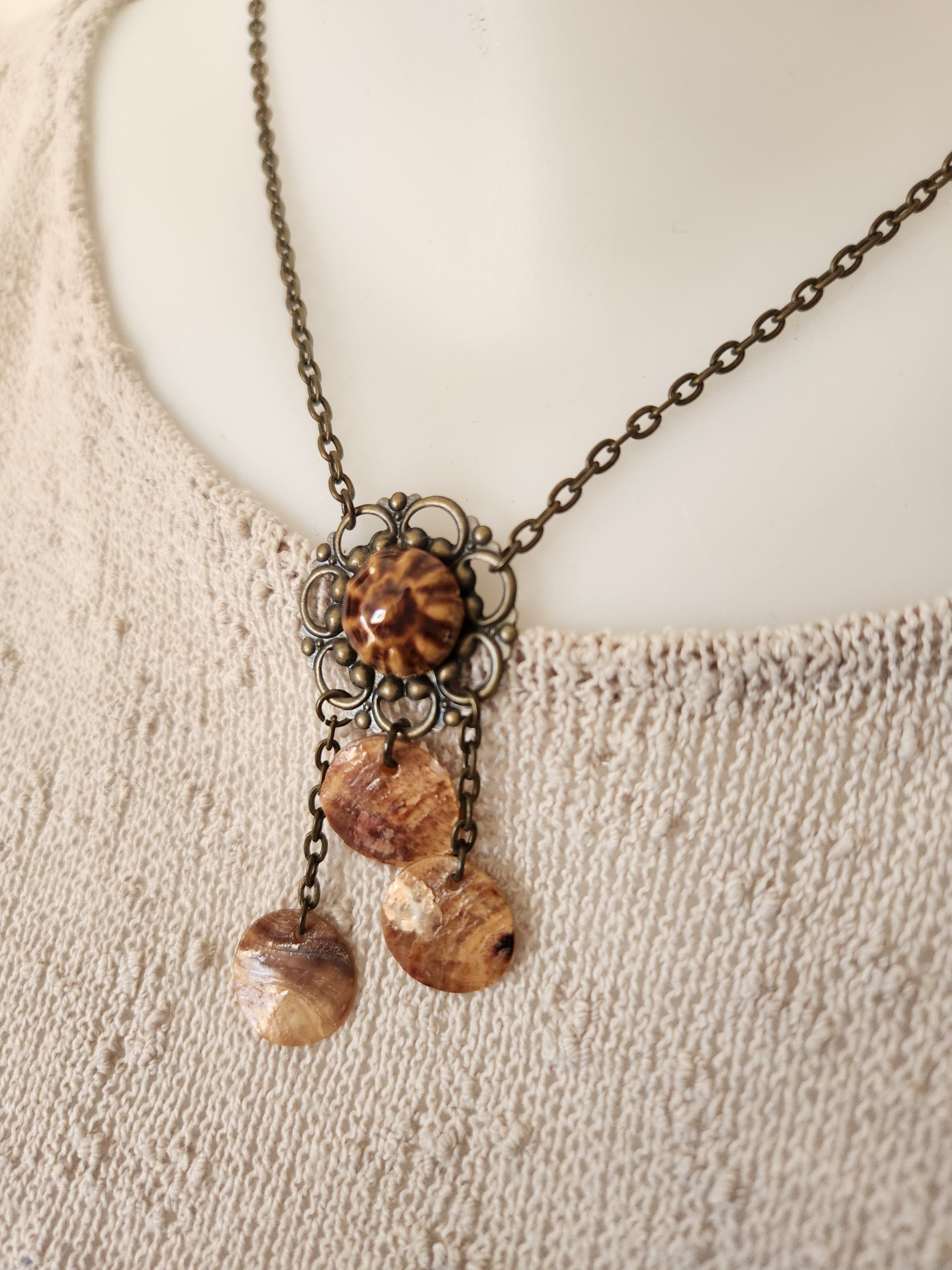 Je vous propose ce collier, fleur en céramique marron montée sur une estampe en bronze.