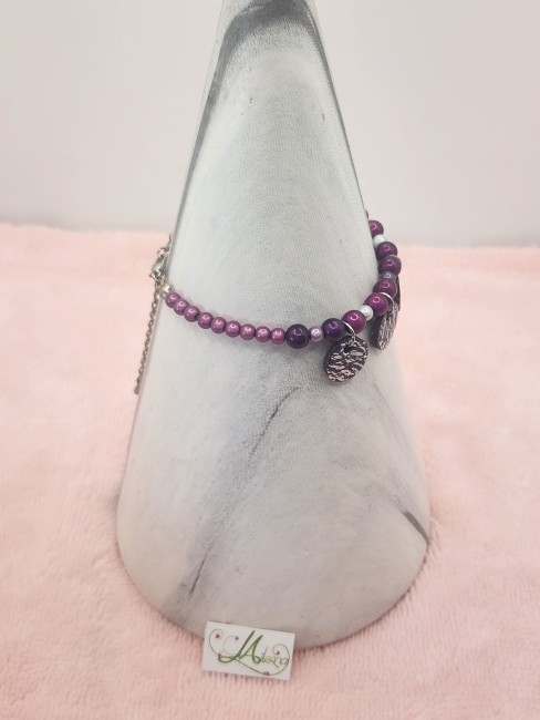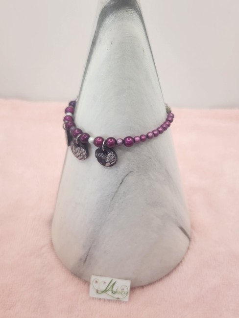 Je vous propose ce bracelet composé de perles magiques, tons de violet et de prune, de breloques en polymère, coloris black cherry/argenté, monté sur cordon de coton violet.
