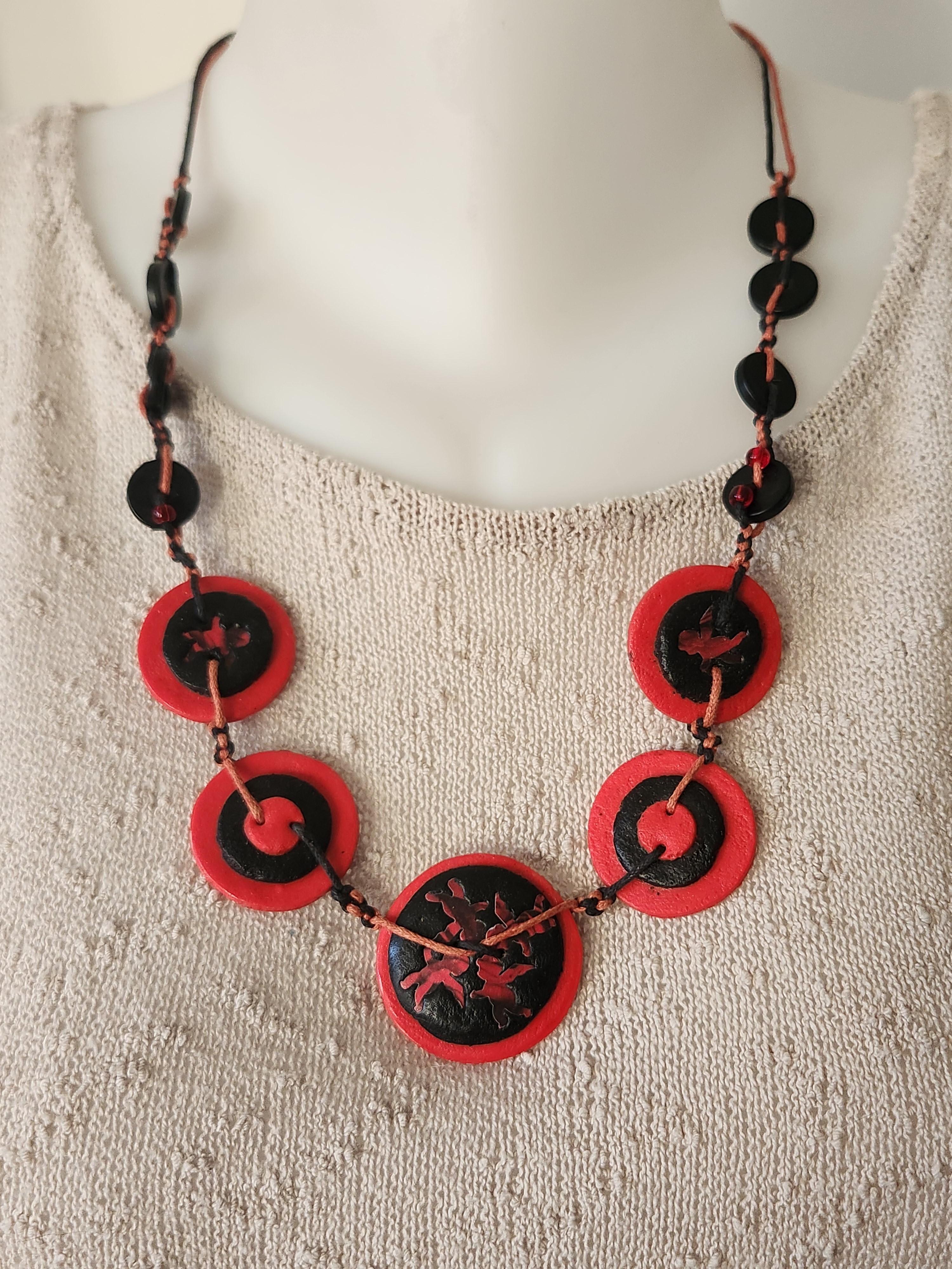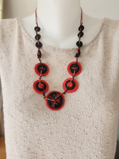 Je vous propose ce sautoir que j'ai appelé "Un ange passe" de couleur noir & rouge en polymère.