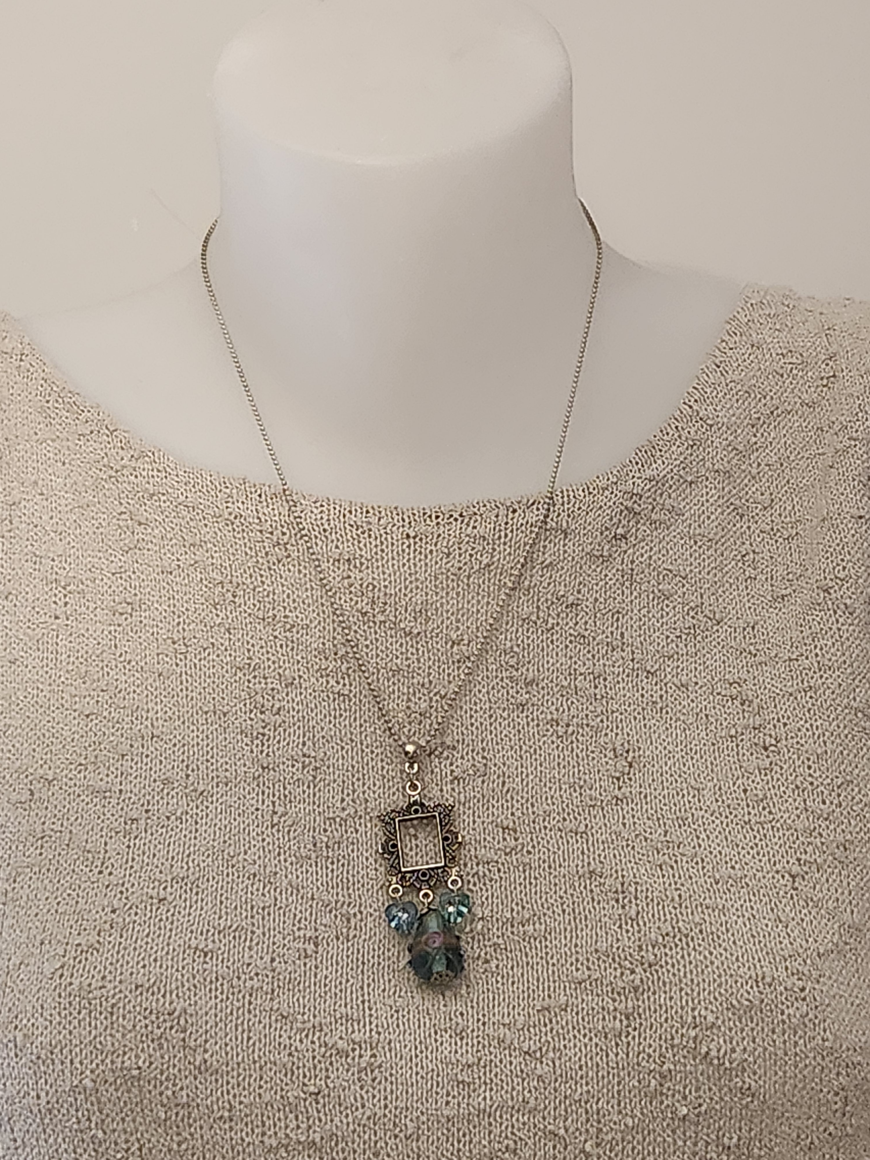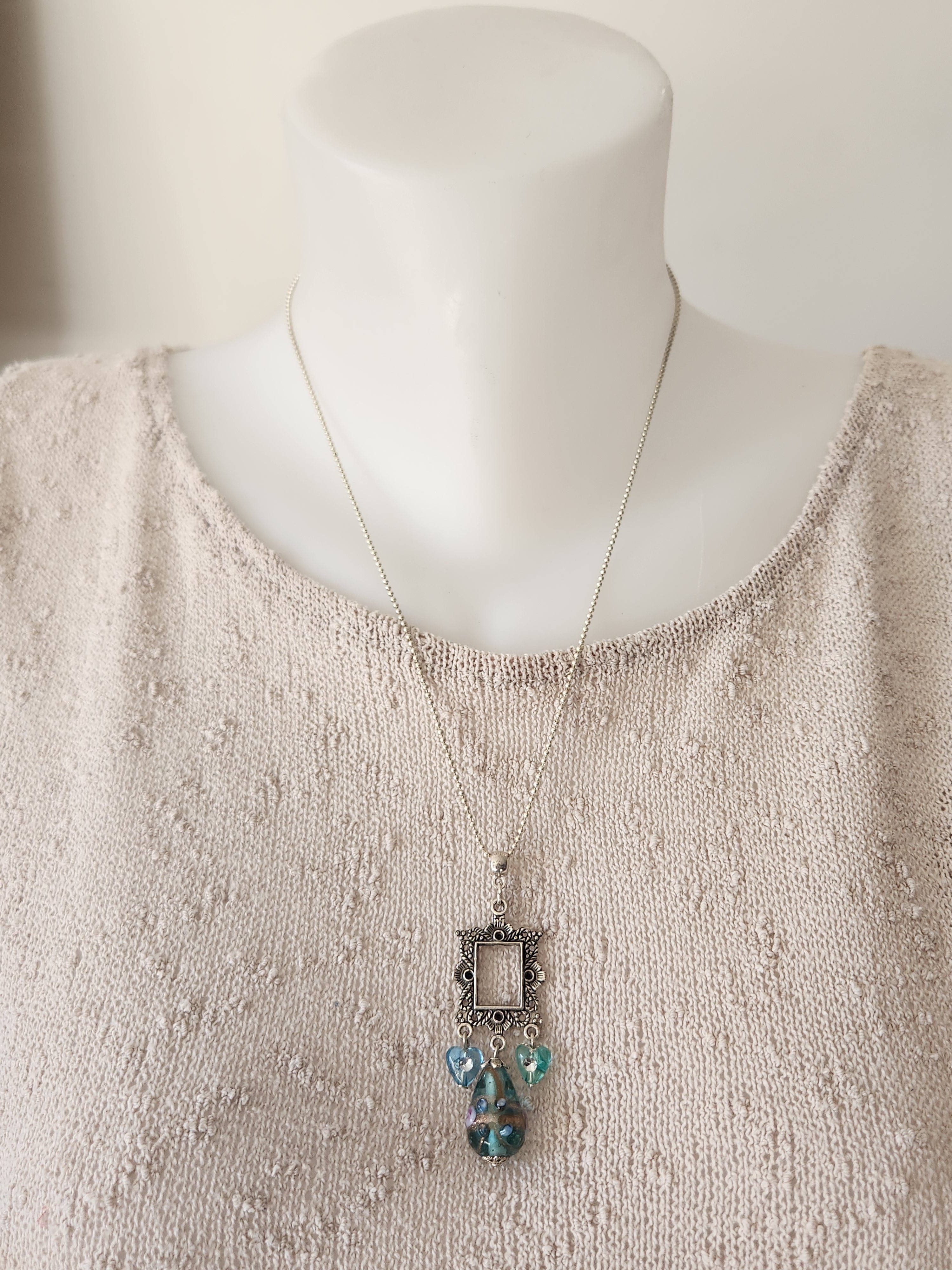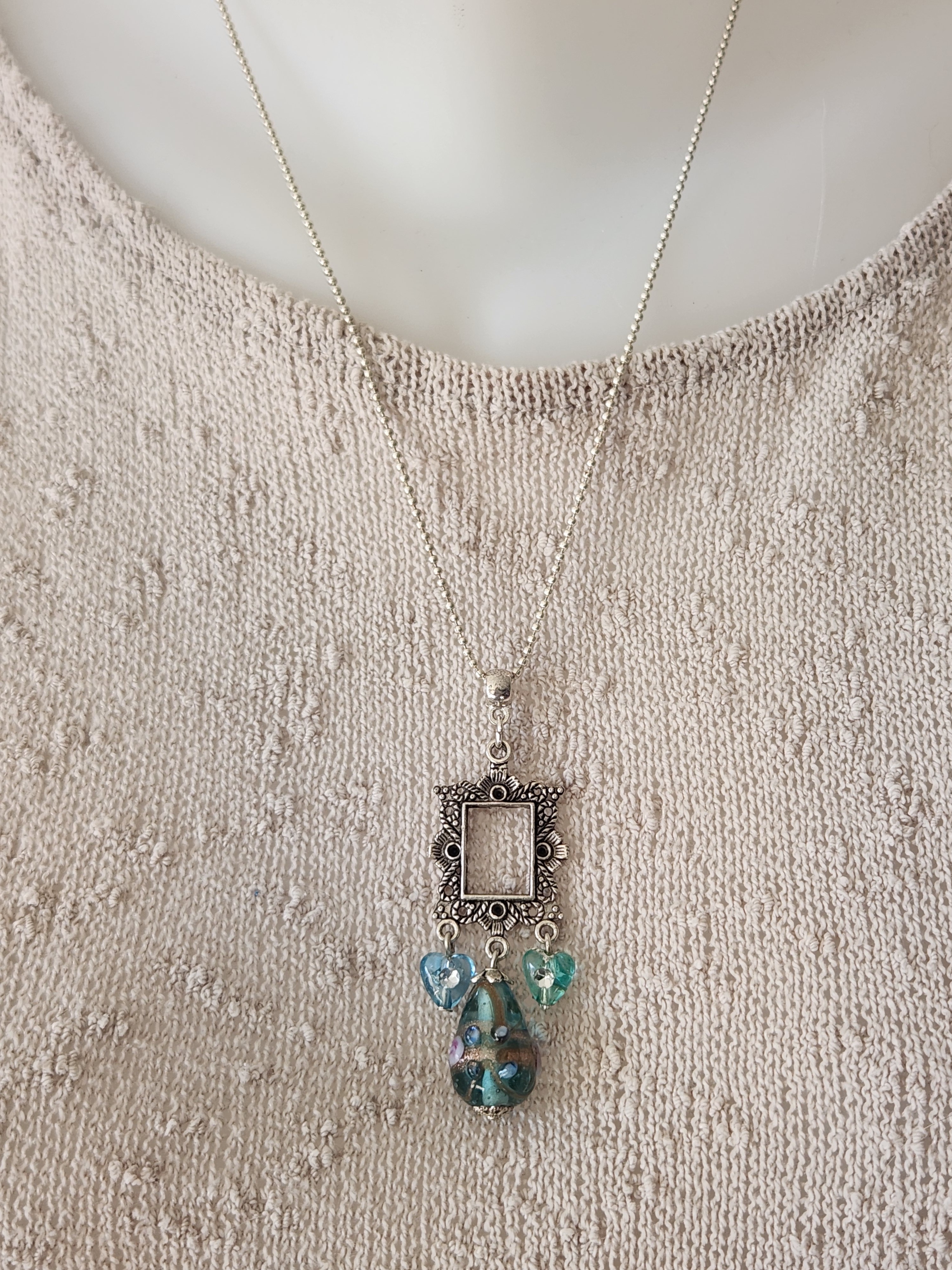 Je vous propose ce joli pendentif monté sur chaine argentée, perles coeur à strass et perle transparente bleue en verre (ogive) décorée en son centre avec une rose.