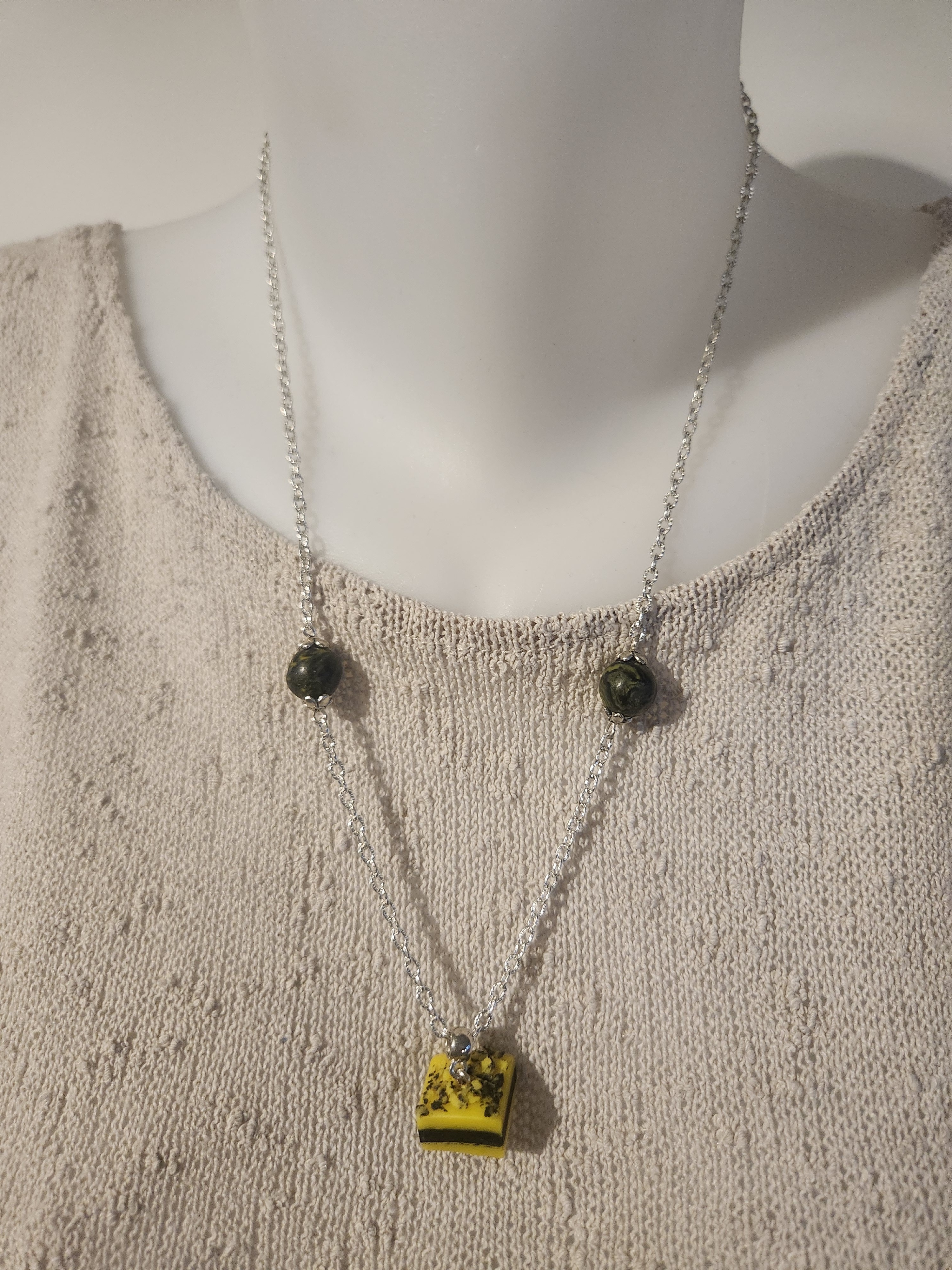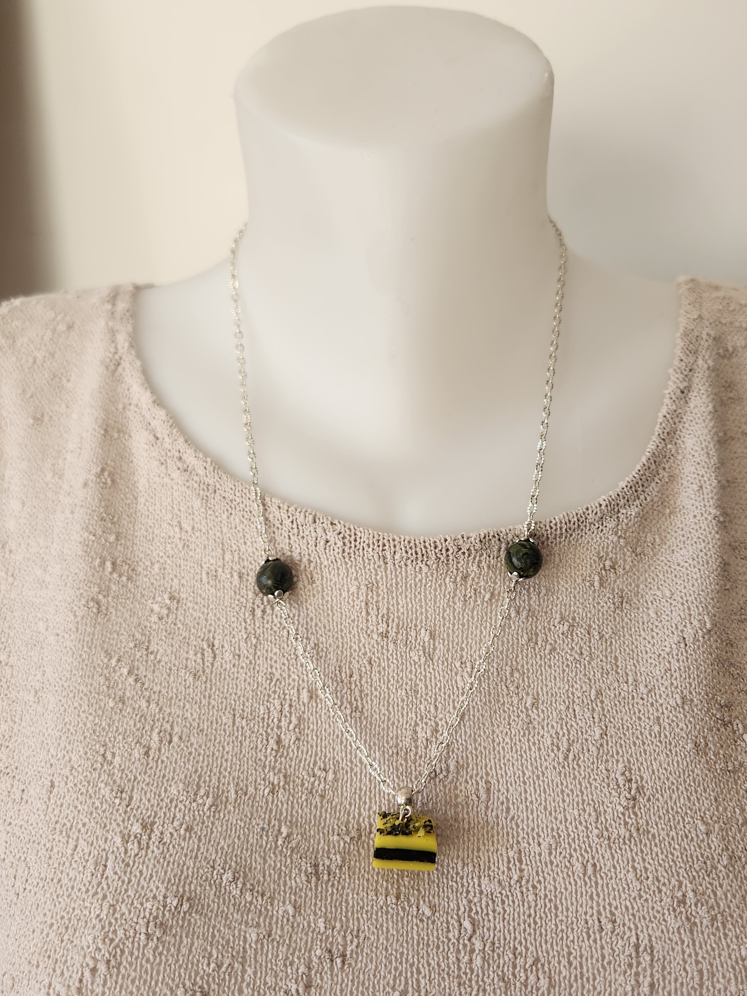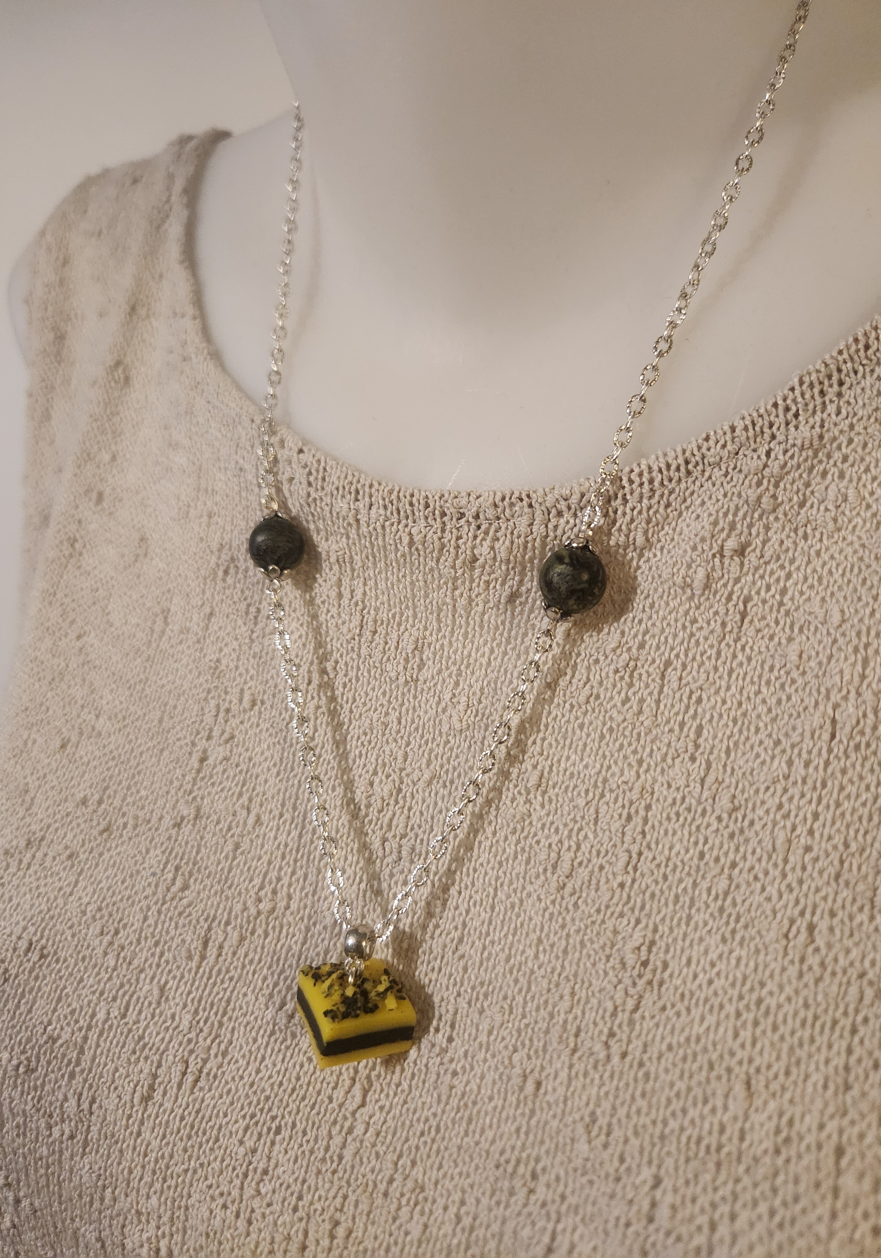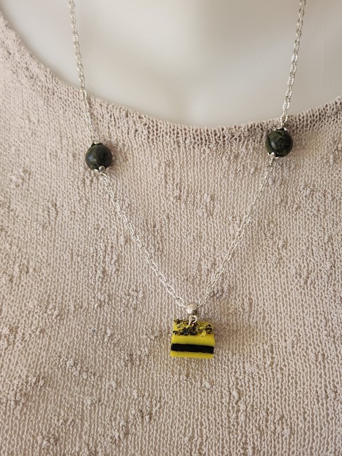 Deux perles foncées jaunes et noires marbrée en polymère complètent ce pendentif gourmand.