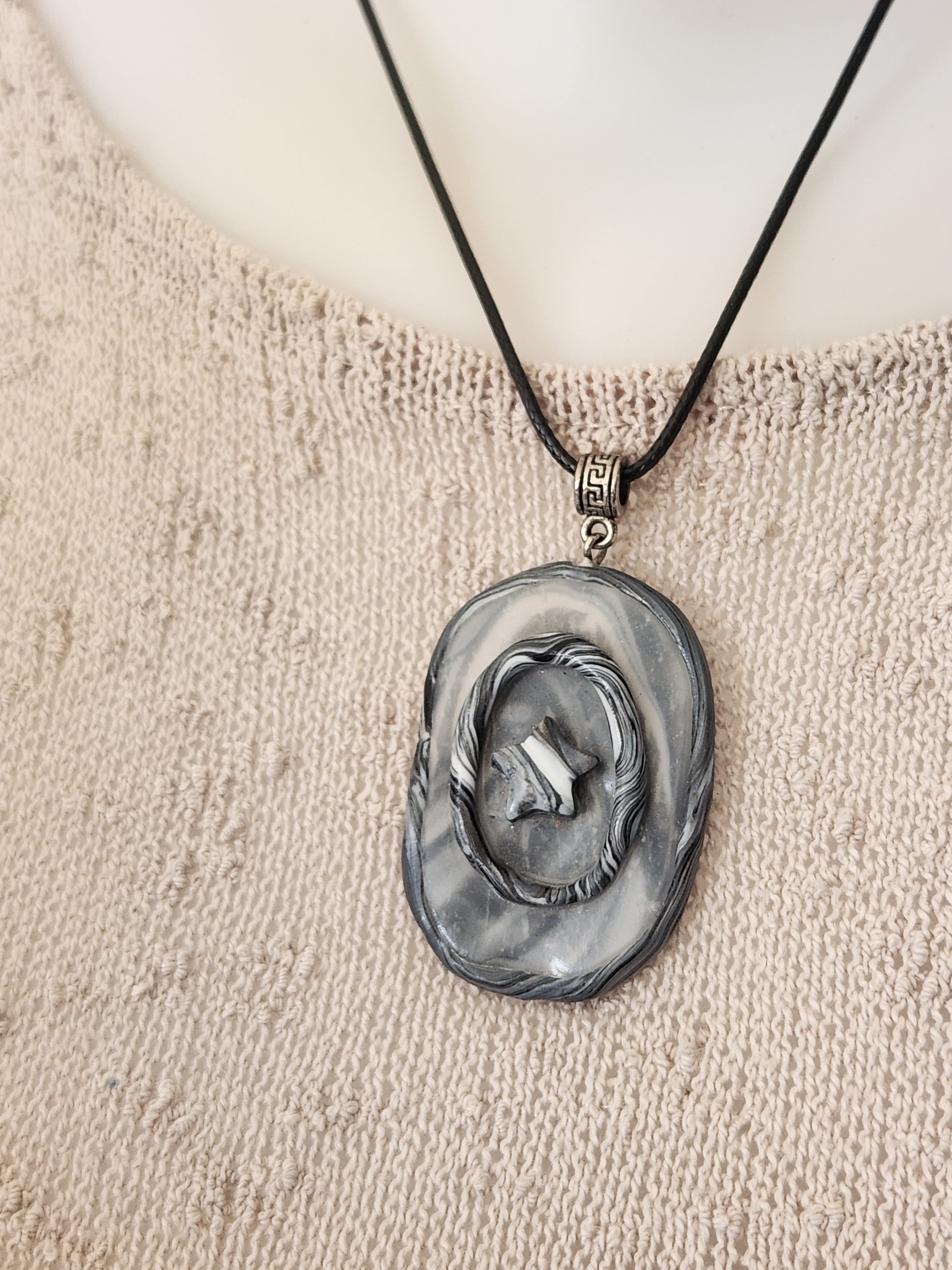 Je vous propose ce pendentif en polymère marbré noir/translucide/blanc.