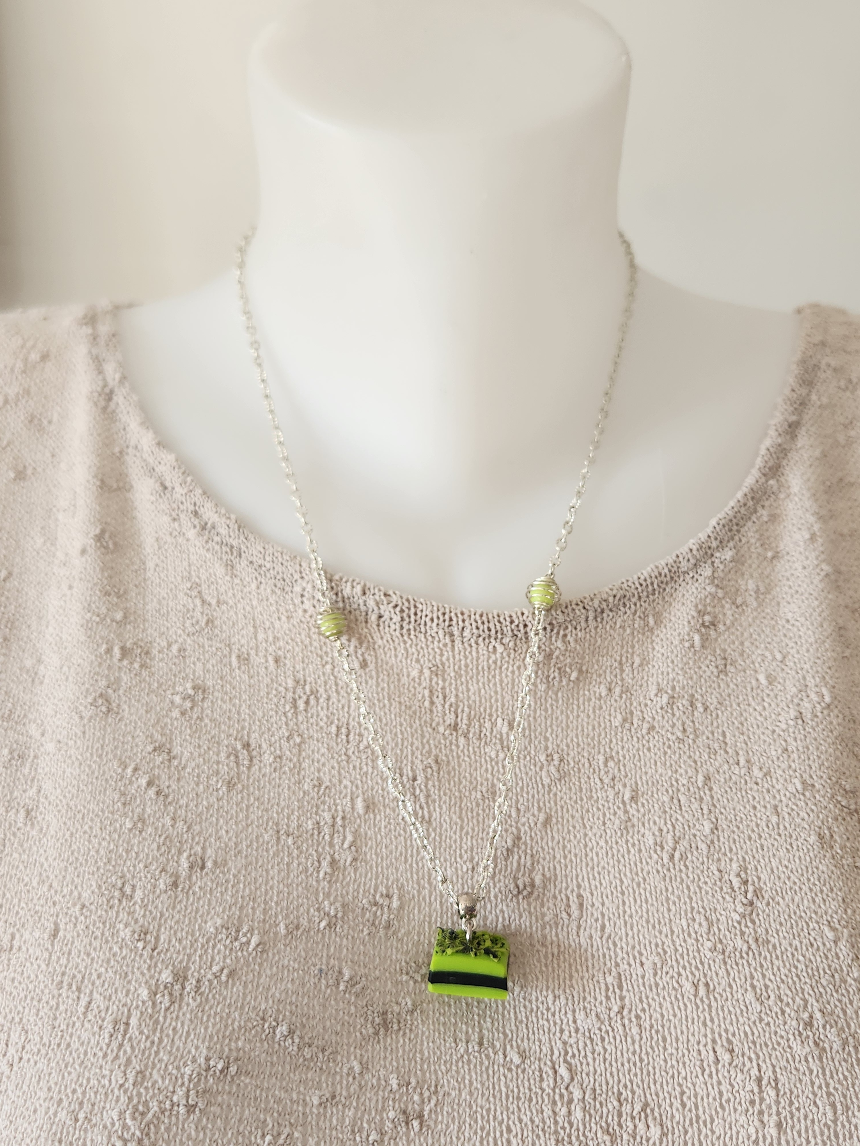 Deux perles vertes en cage complètent ce pendentif gourmand.