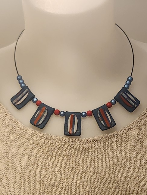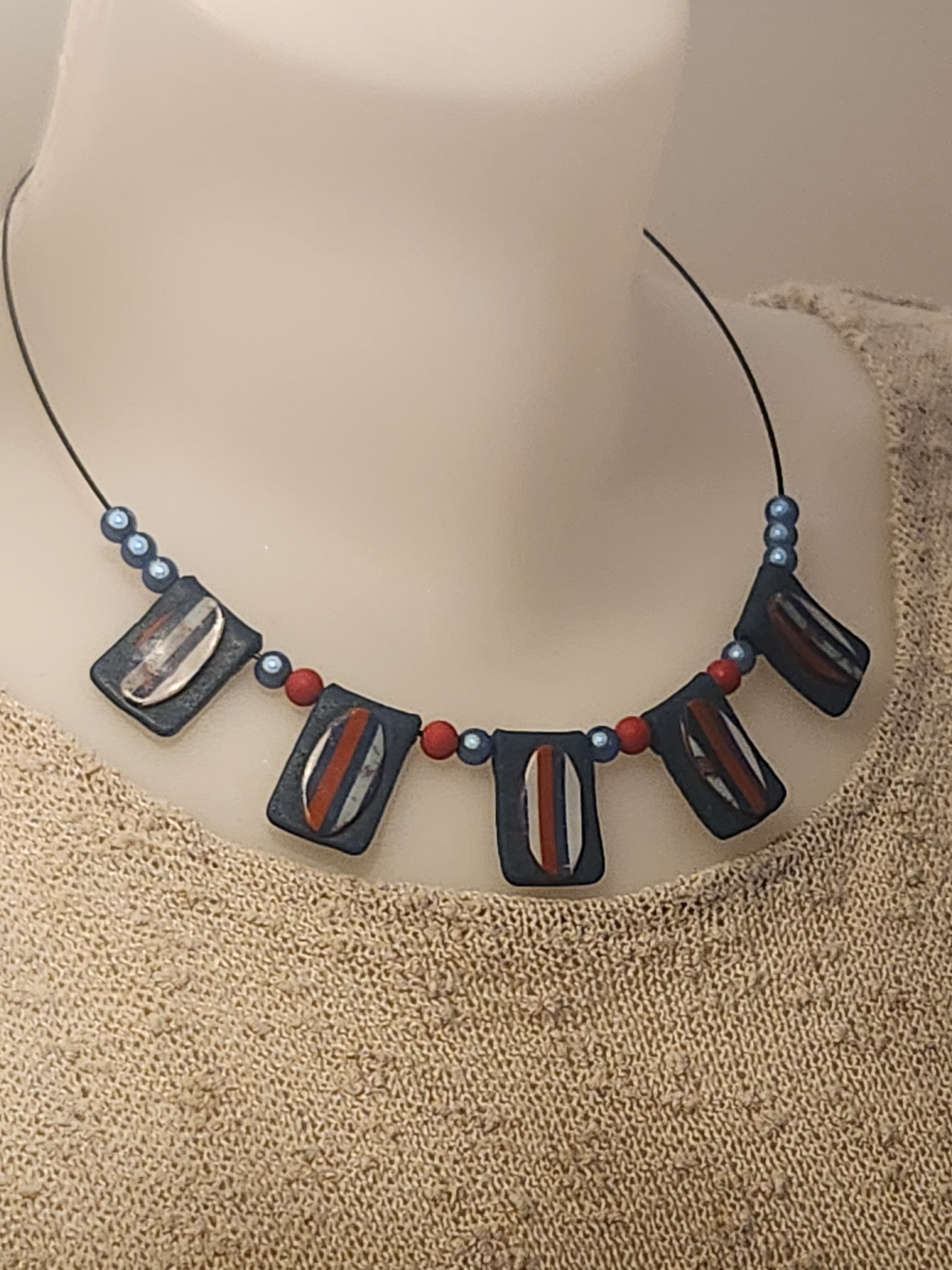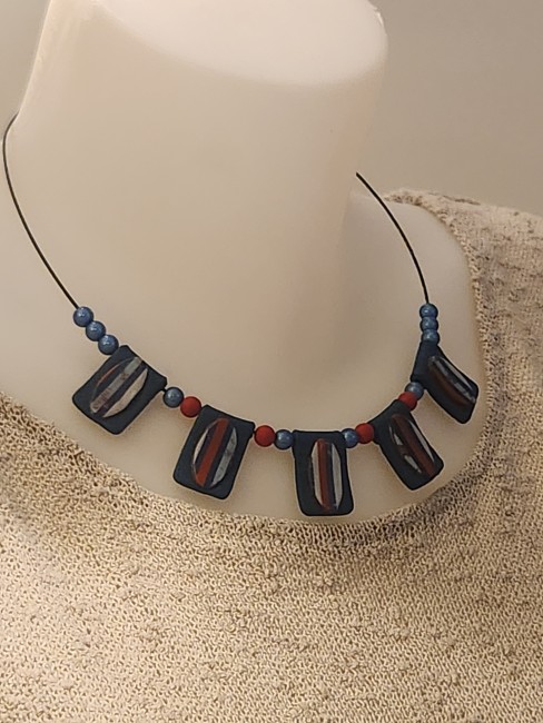 Je vous propose ce collier composé de 5 perles plates en polymère réhaussé d'une pièce rayée. Le coloris des perles plates est dans les tons de bleu, rouge et blanc.
