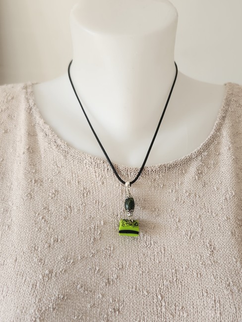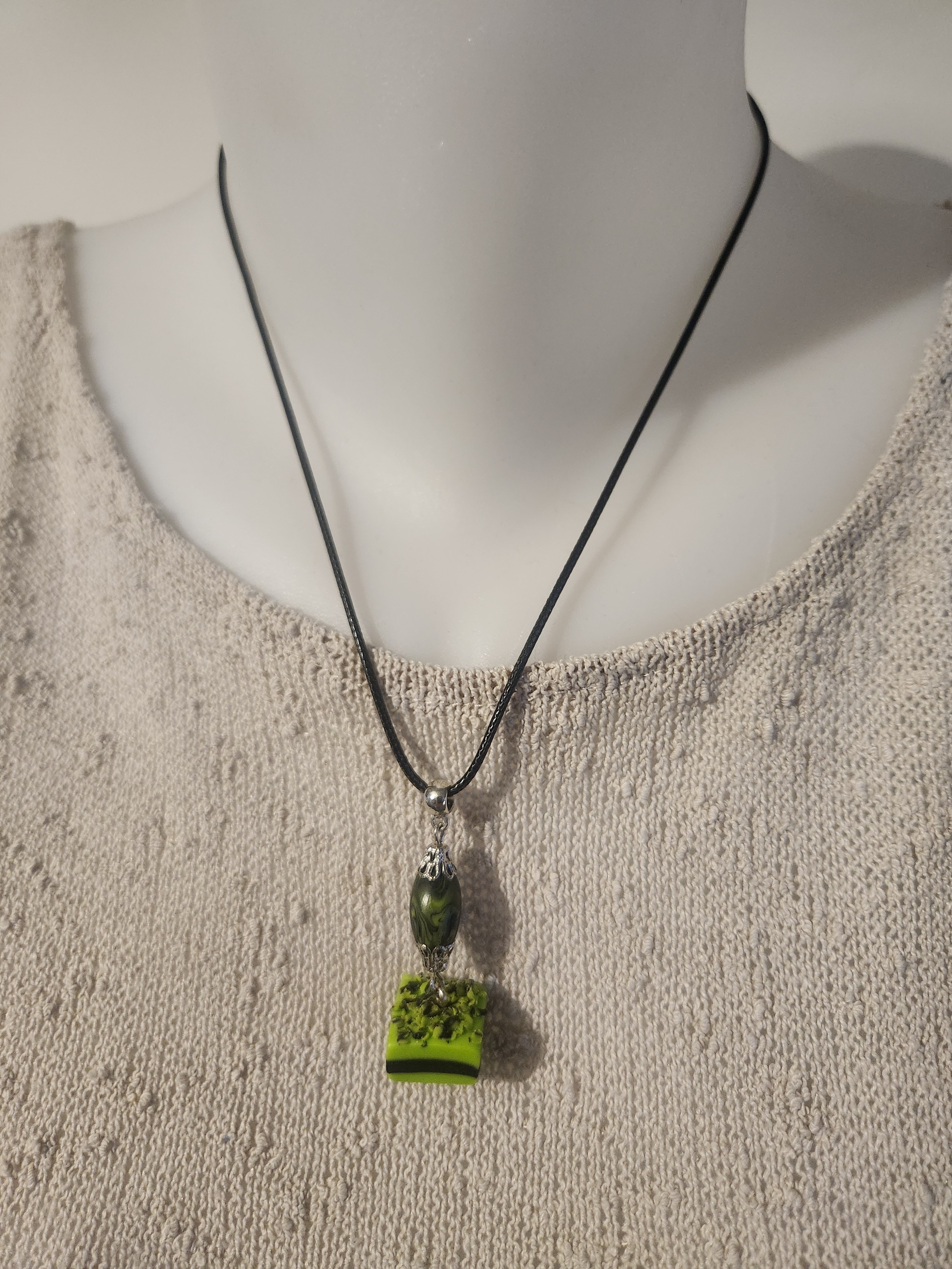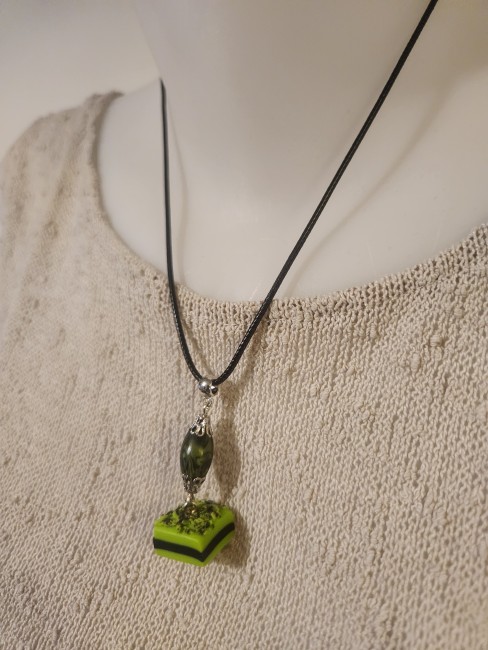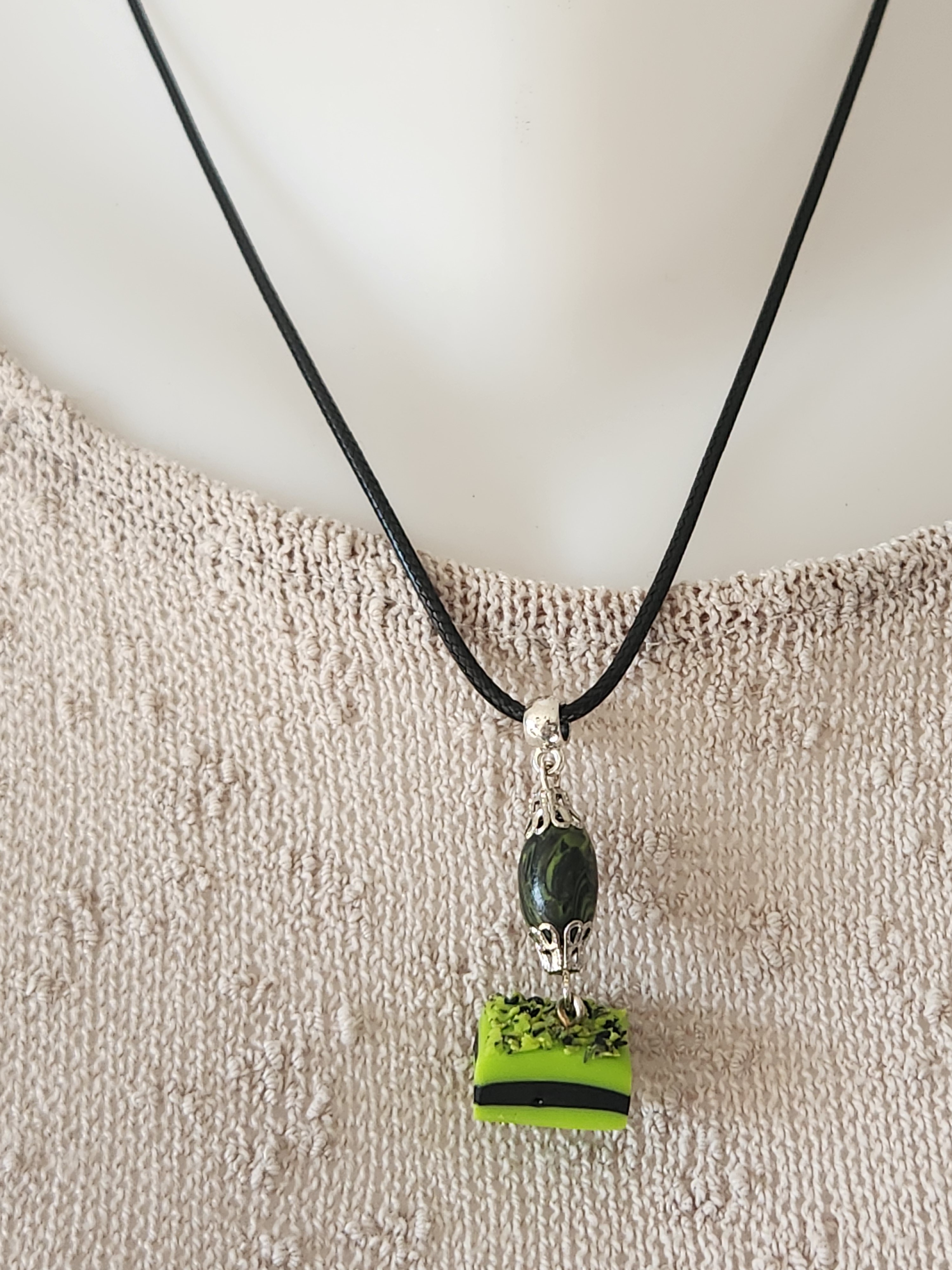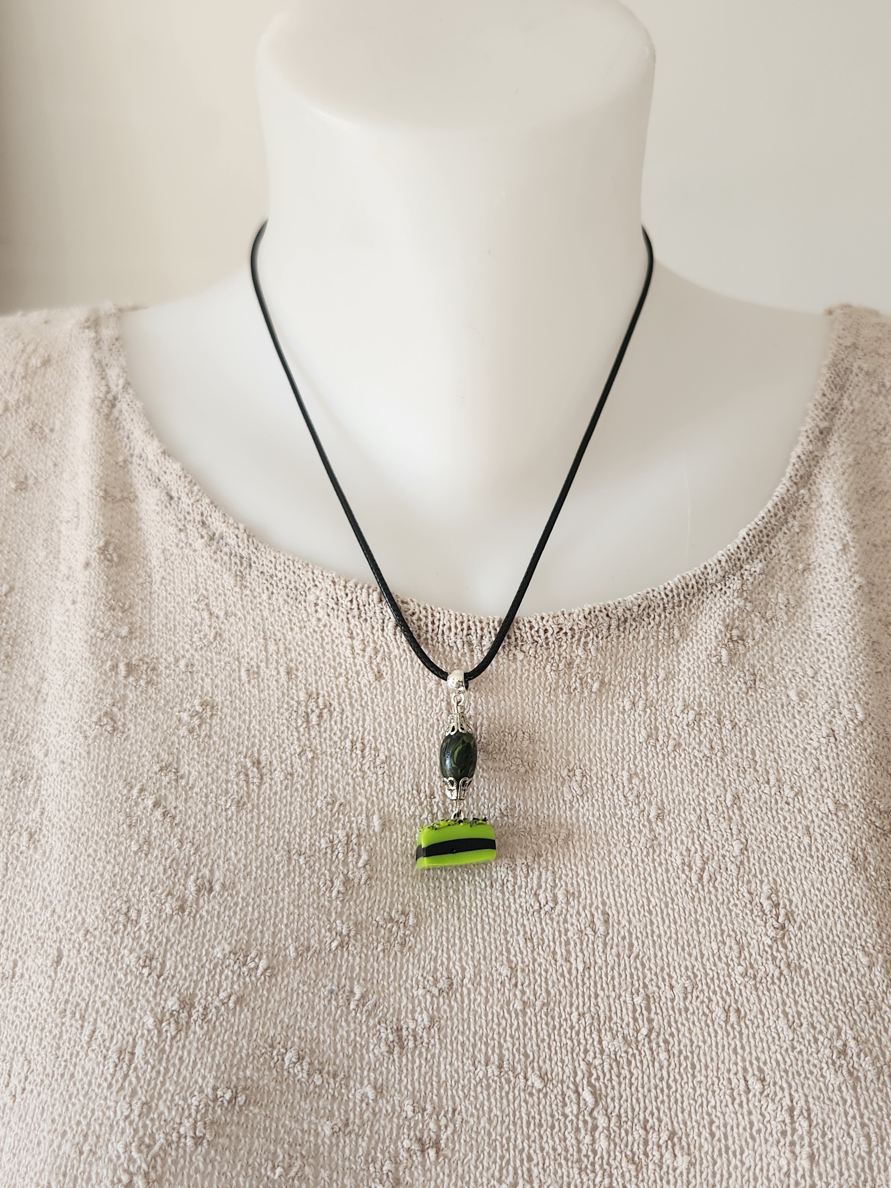Je vous propose ce pendentif gourmand, réglisse vert et noir en polymère, une perle allongée verte et noire complète ce pendentif gourmand.