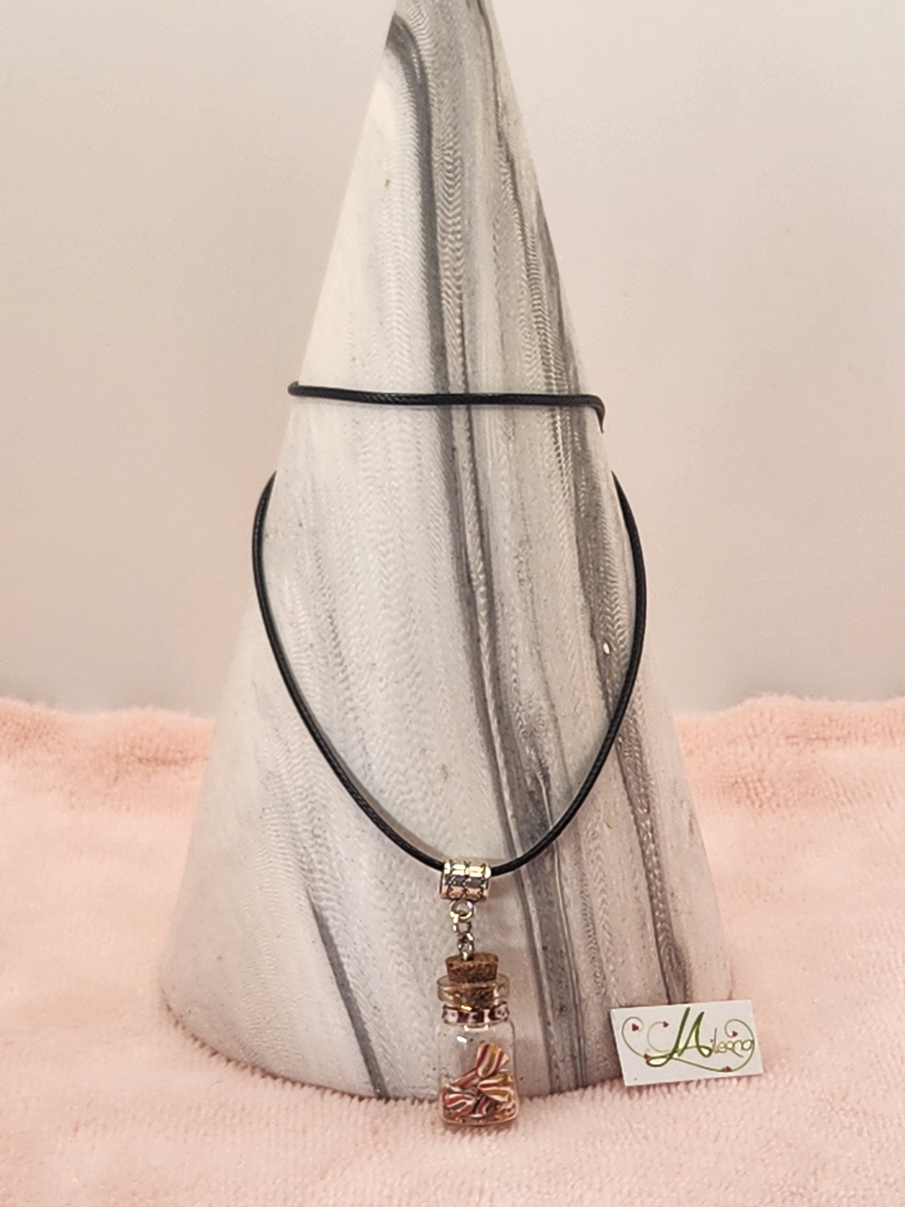Je vous propose ce pendentif gourmand, fiole berlingots en polymère, longueur environ 26 cm, tour de cou en coton noir ciré.