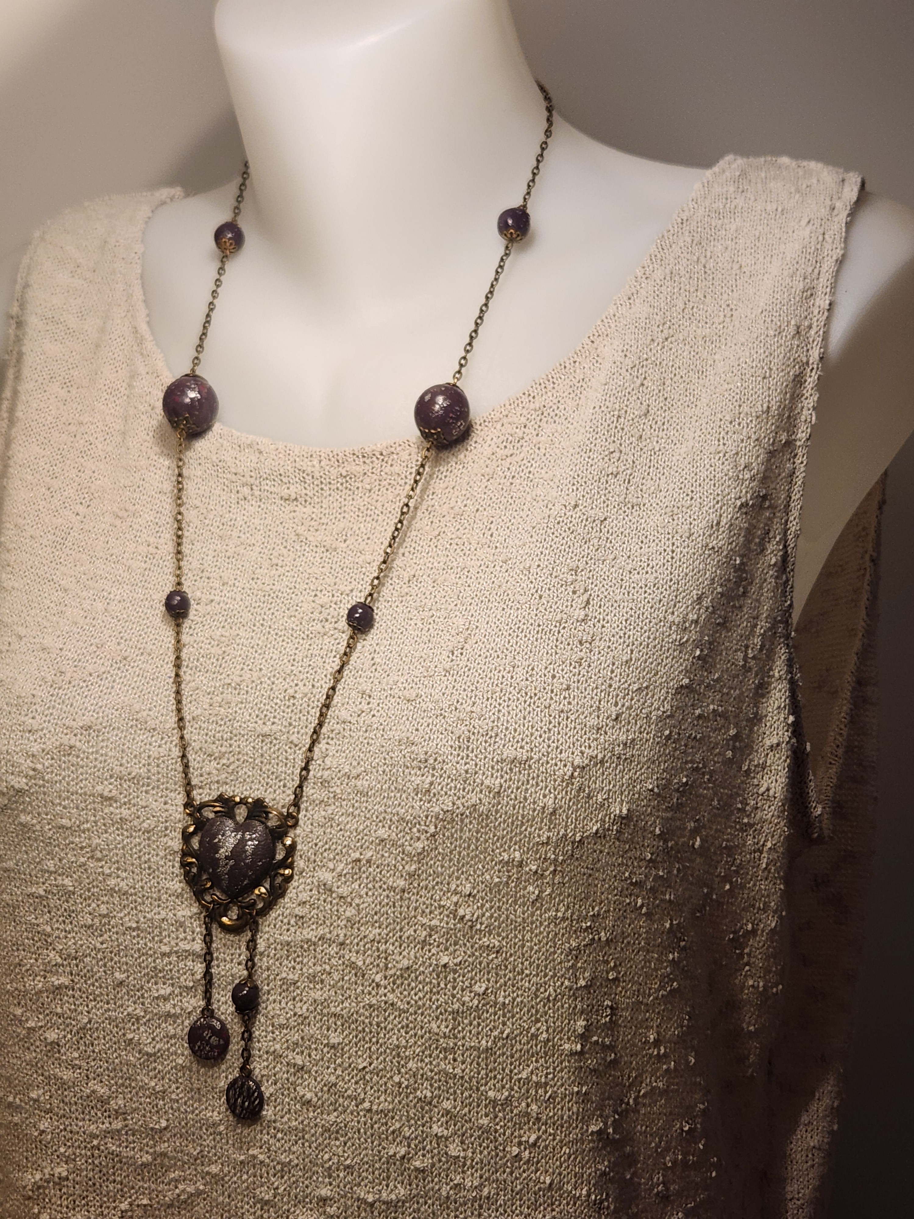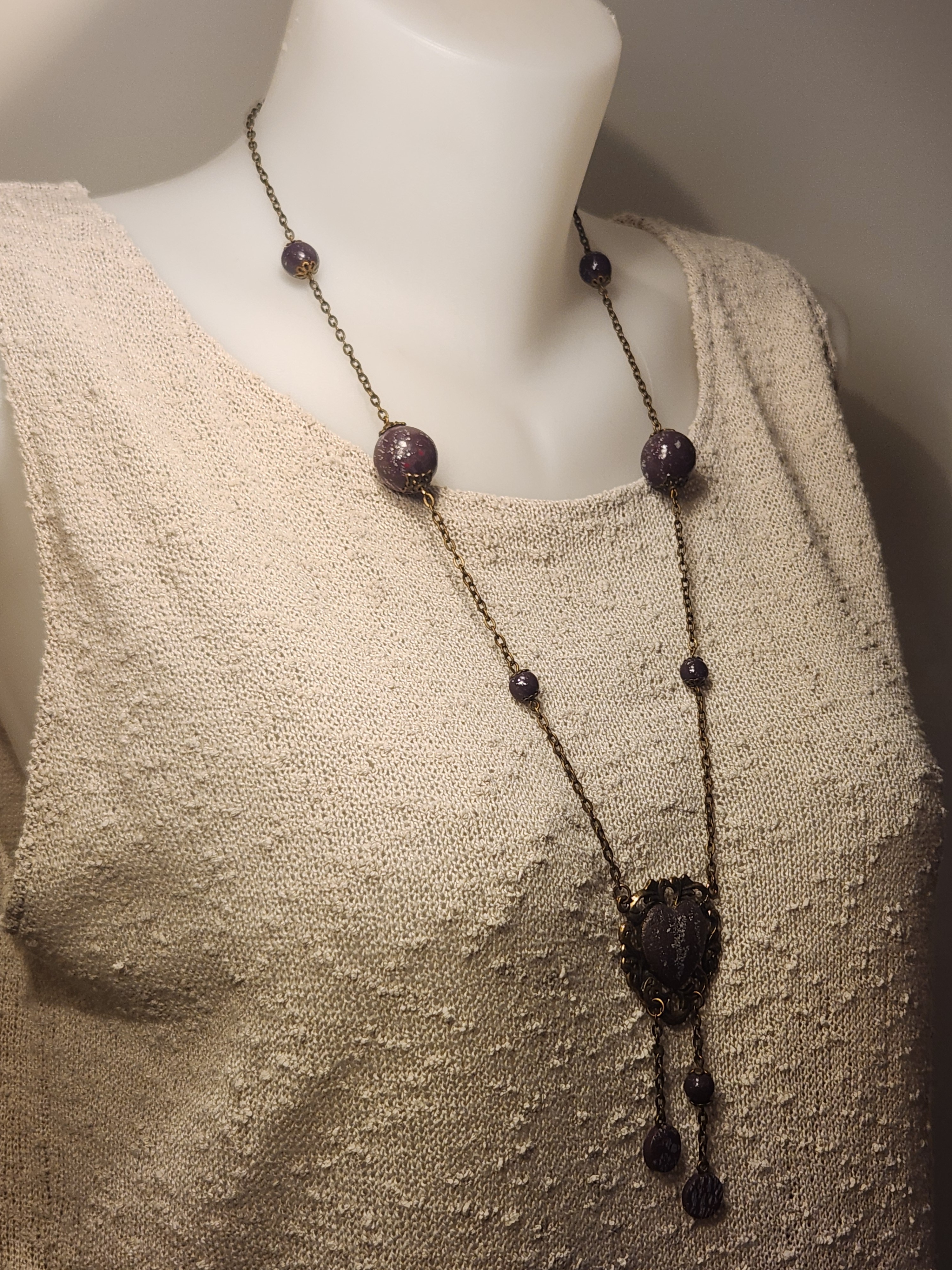 Je vous propose ce sautoir avec ses perles de coloris black cherry / argenté en polymère.