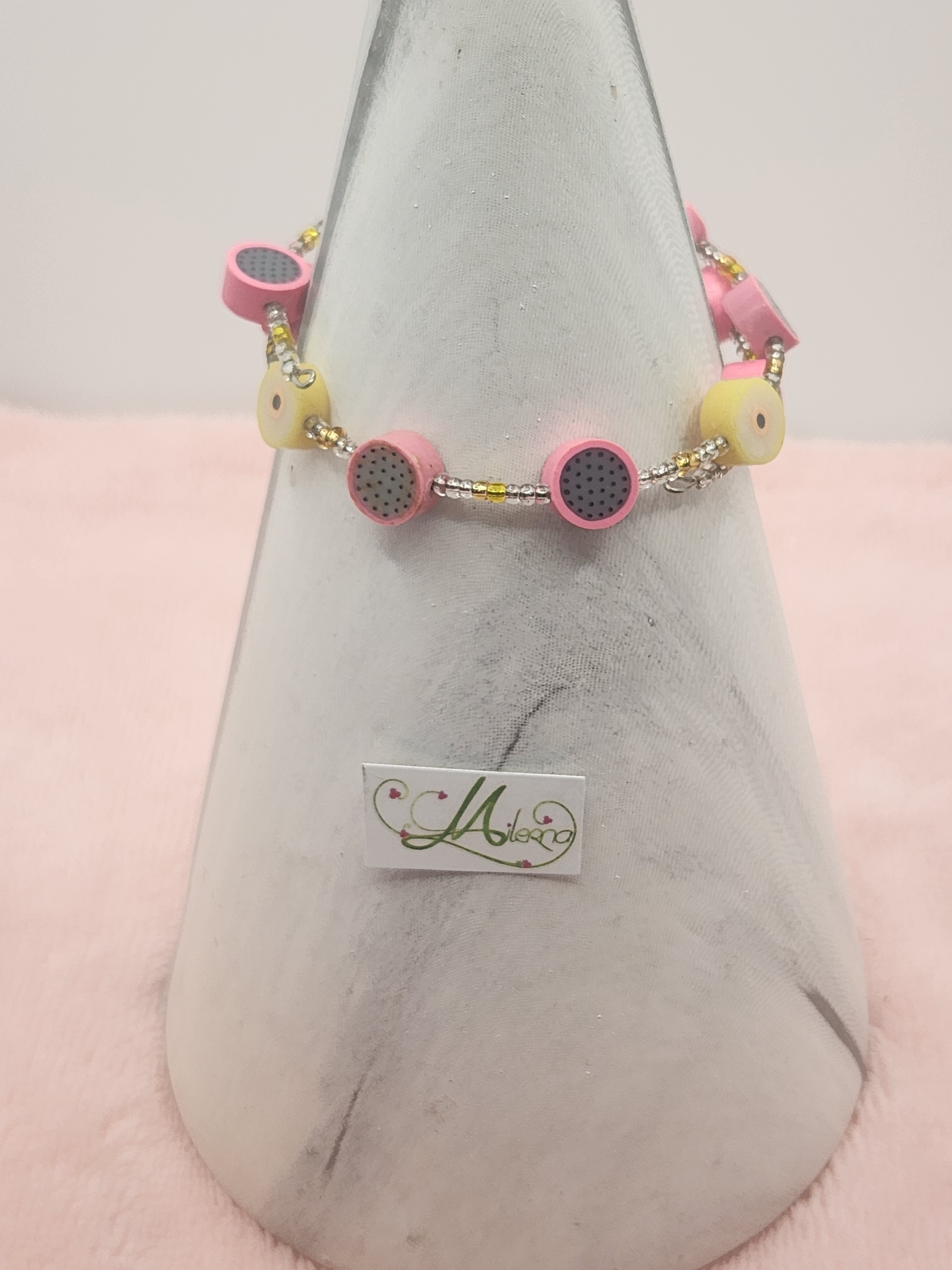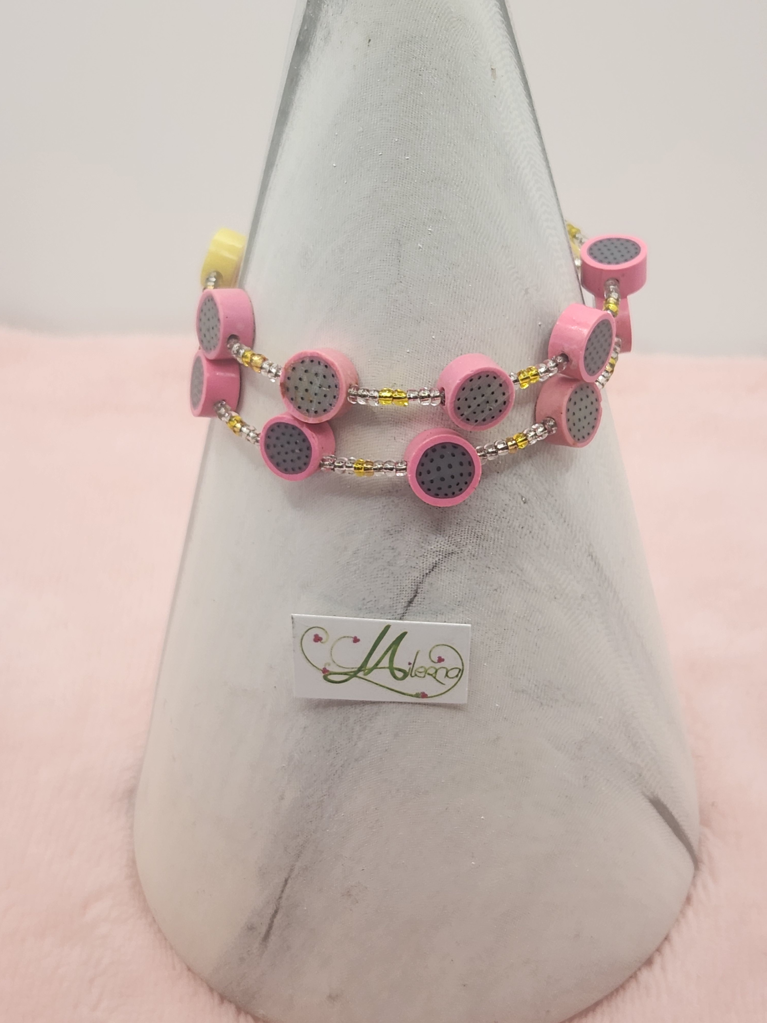Il se compose de perles de rocailles grise et jaune, des tranches de fruits en polymère.