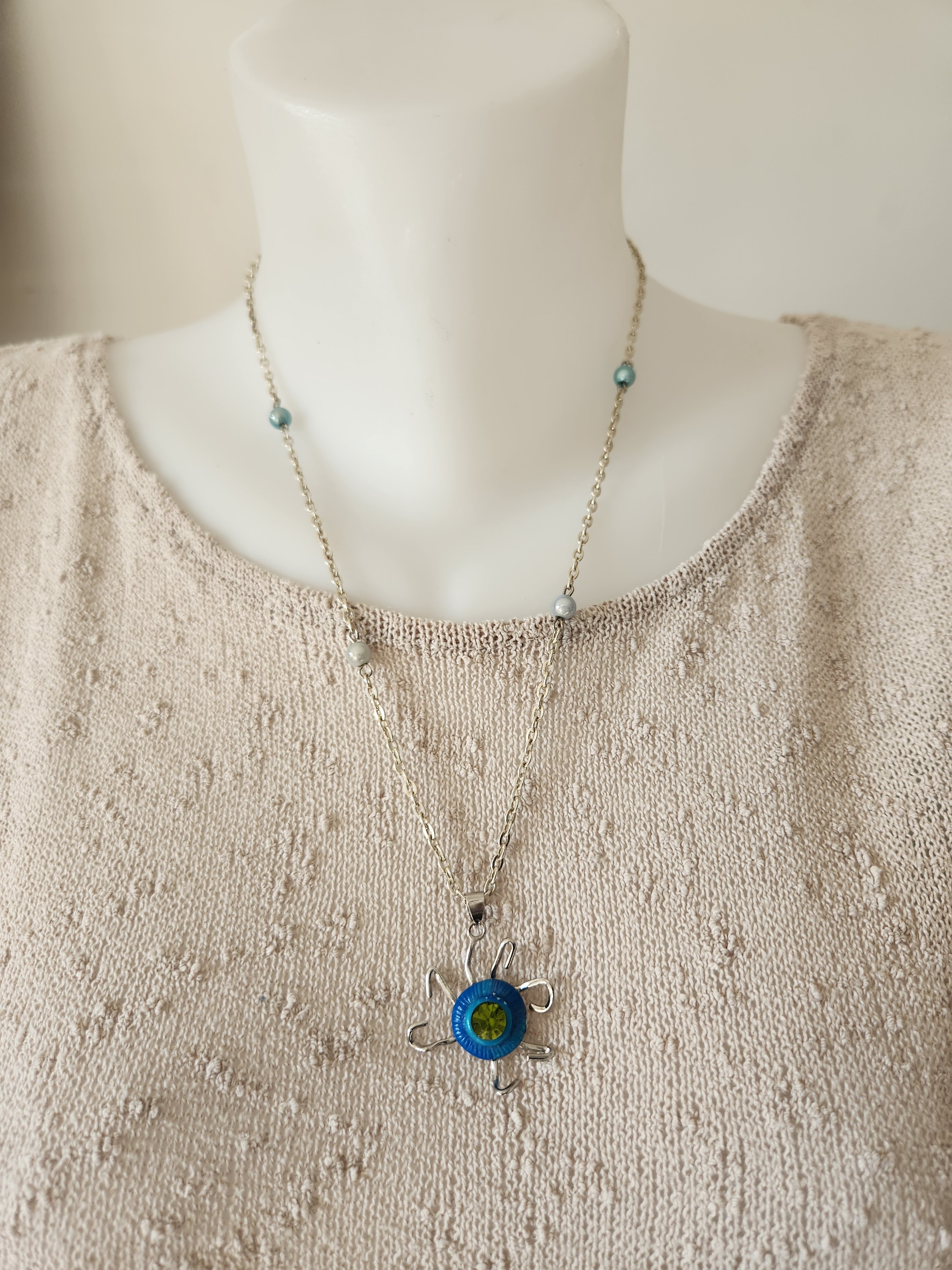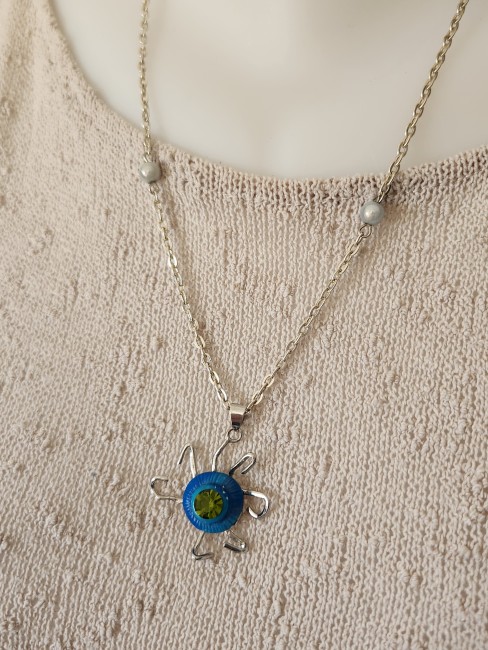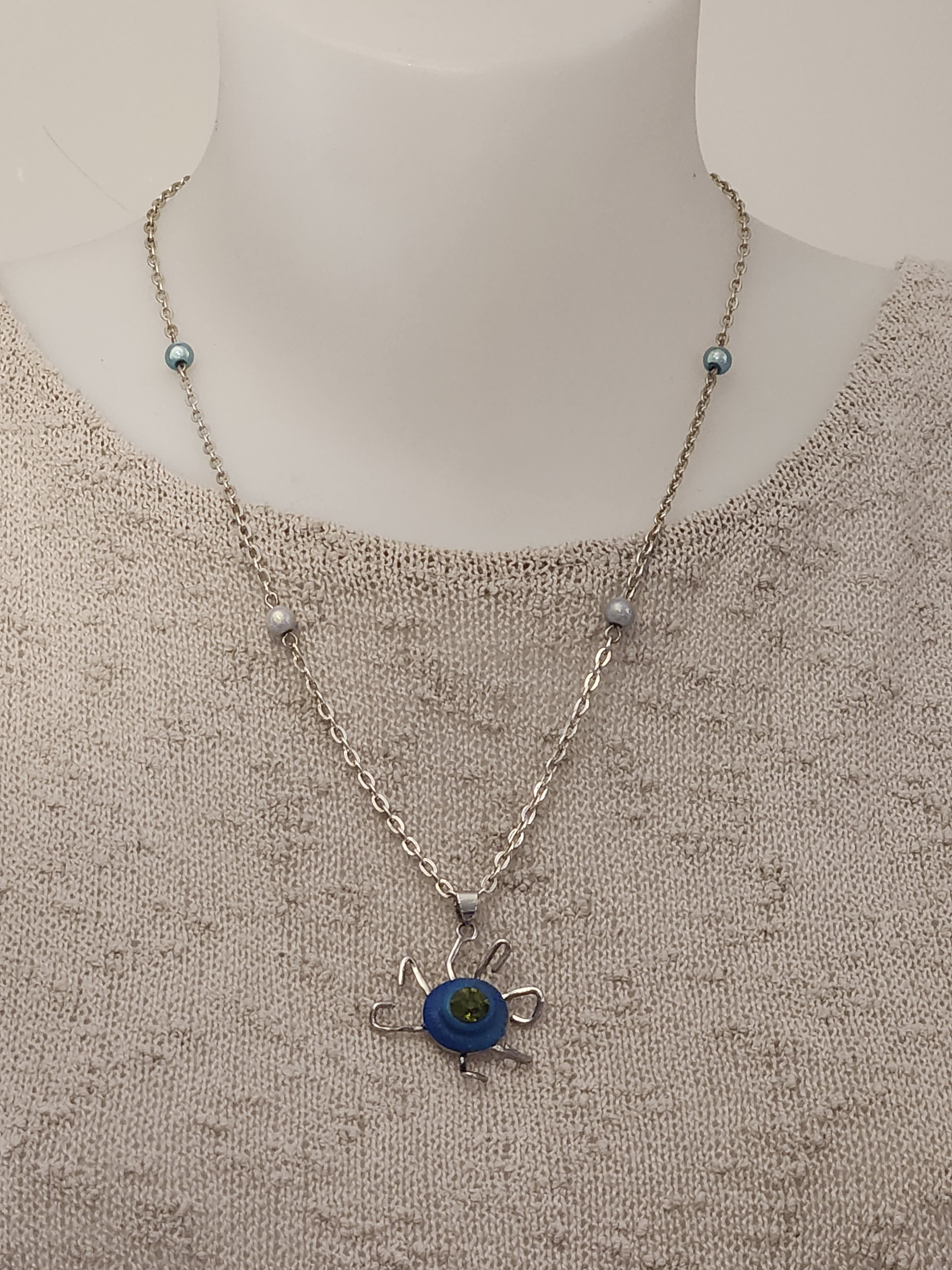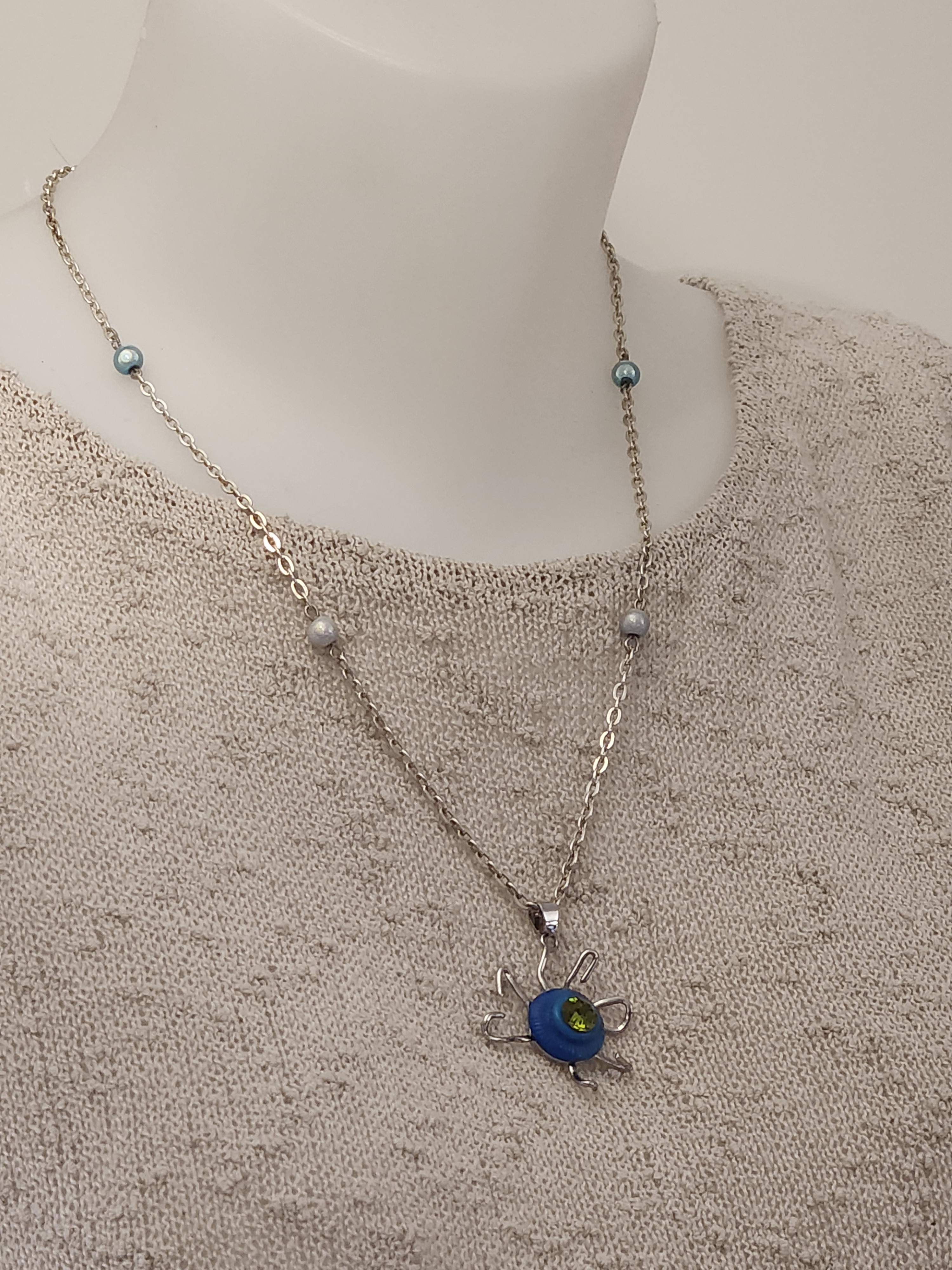 Chaine métal fantaisie, sur laquelle se trouve 4 perles magiques de couleur bleue et grise.